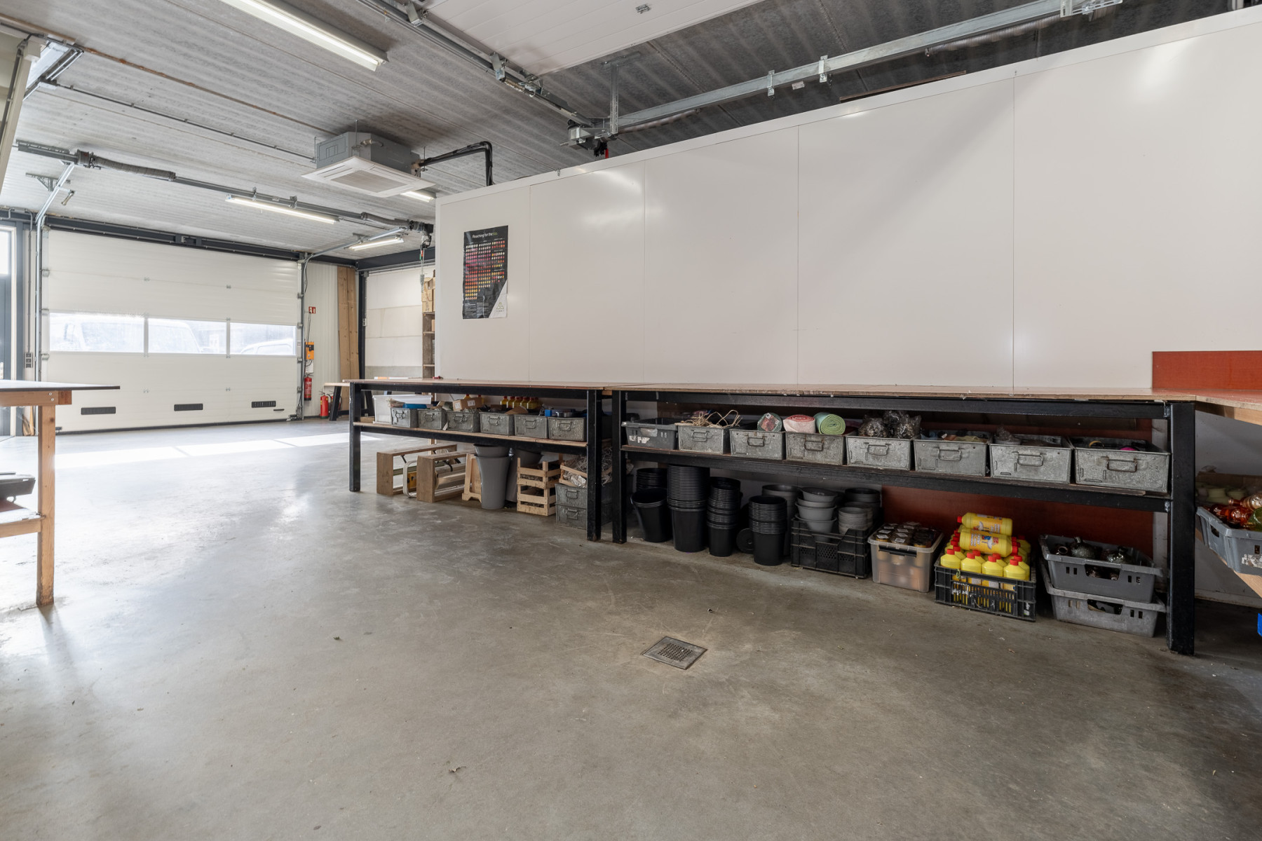 Overheaddeuren, betonvloer, toilet en pantry