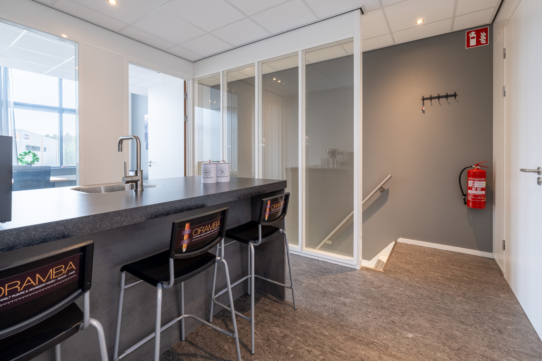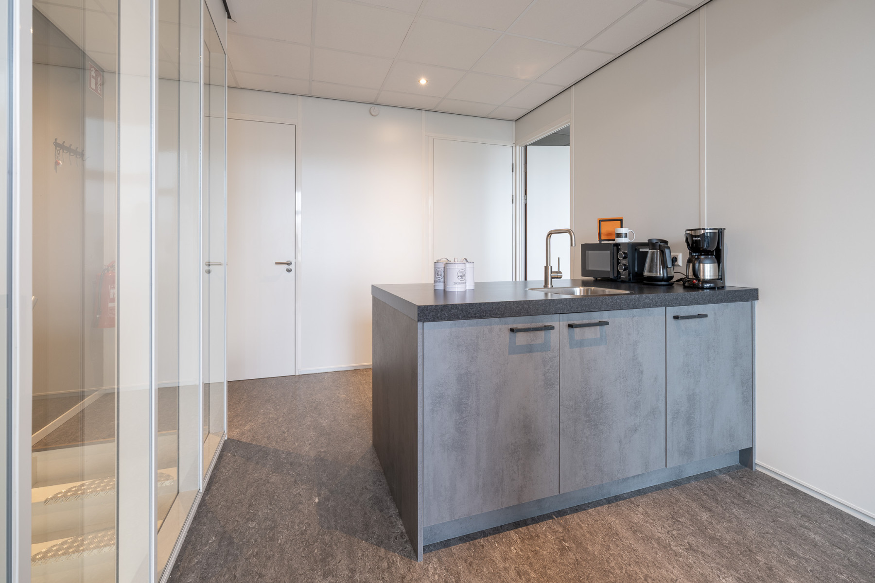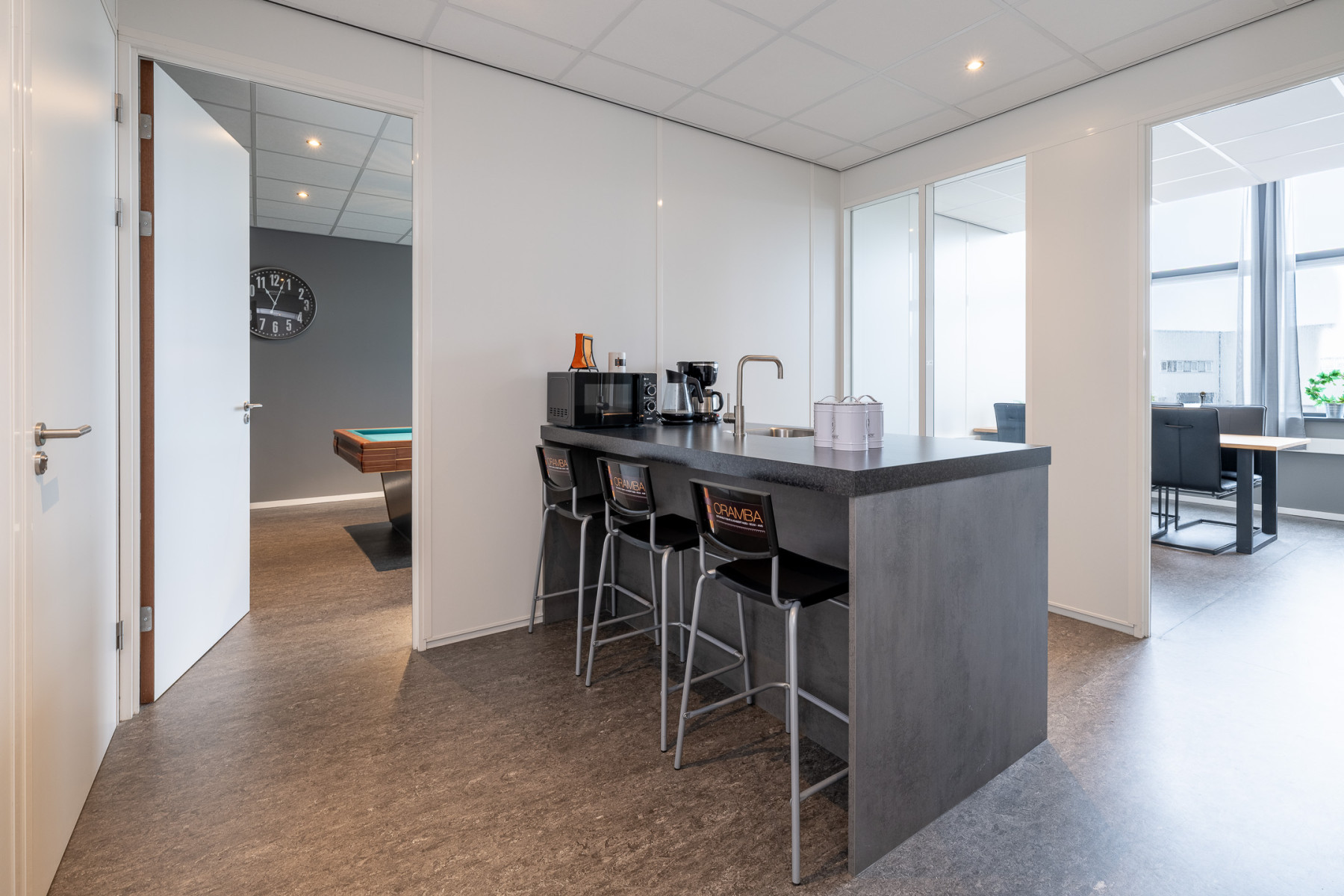 De begane grond bestaat uit een ruime bedrijfshal met een vrije hoogte van 4,63 meter. Via de automatische overheaddeur van 4 bij 4 meter is de hal goed toegankelijk voor voertuigen en goederen. Naast de entree bevindt zich de meterkast en de trap naar boven. Op de verdieping zijn twee kantoorruimtes te vinden, waarvan één als spreekkamer. Verder is er een hal met een keukenblok en een toilet-en doucheruimte.