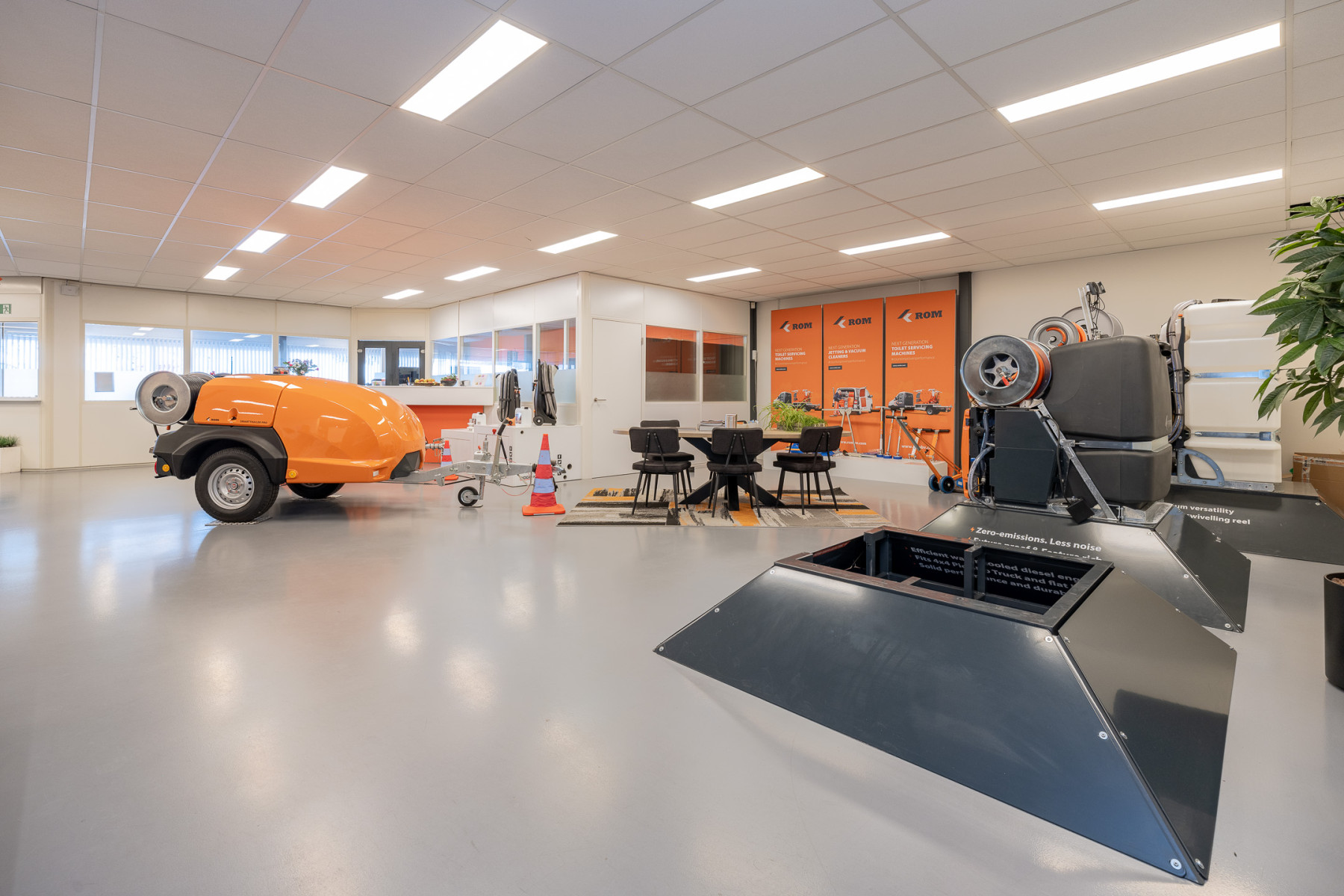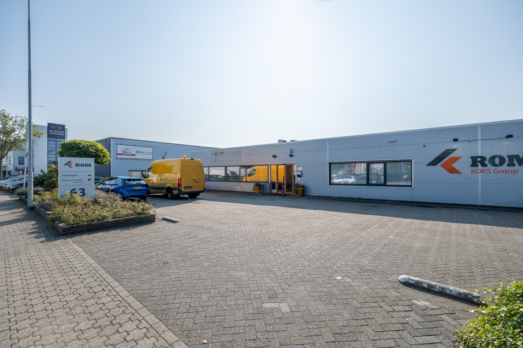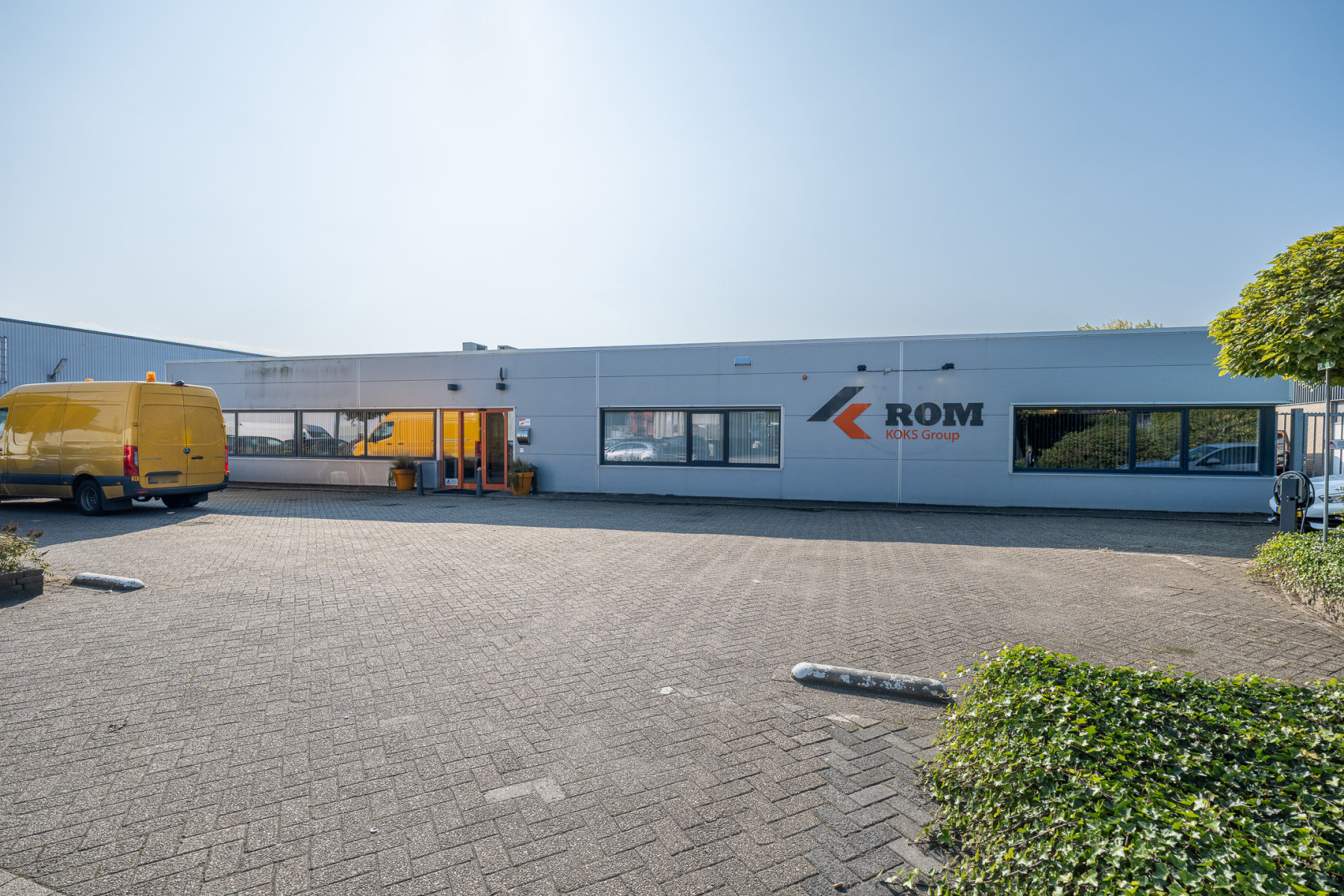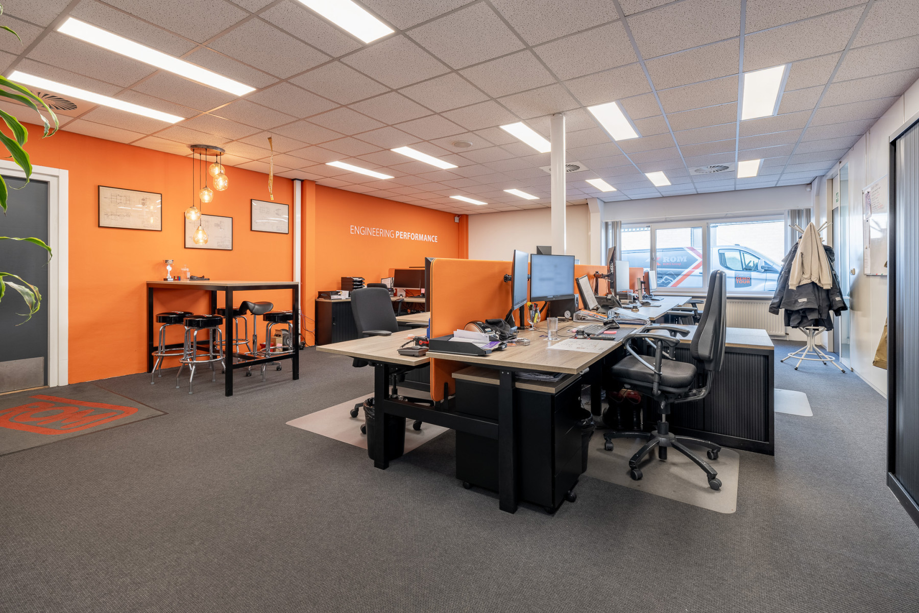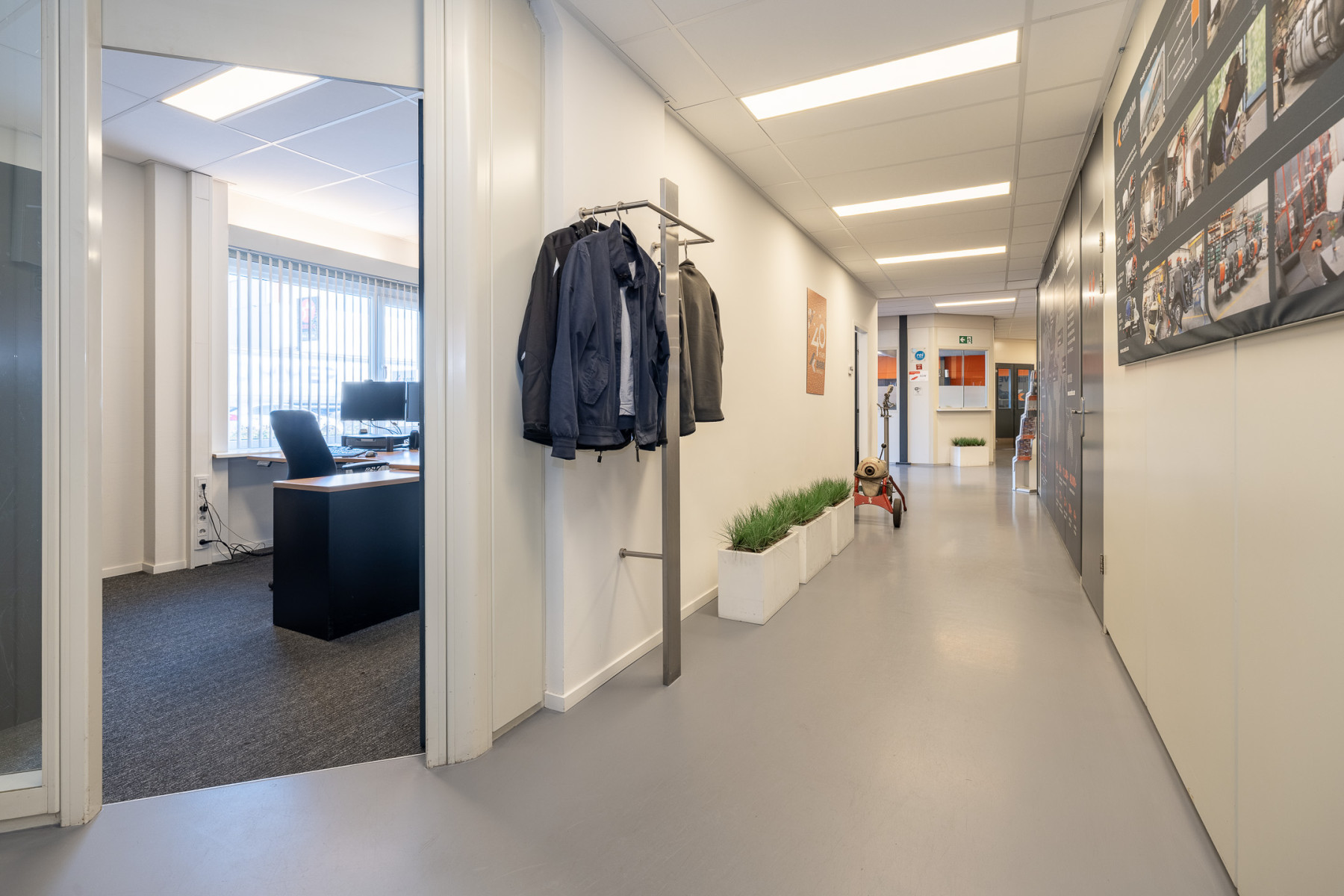 Achter het kantoor ligt de grote bedrijfsruimte/werkplaats gesplitst in meerdere afdelingen. Ook zijn er sanitaire voorzieningen, een pantry en een archief aanwezig. Op de verdieping bevinden zich extra kantoren en een kantine.