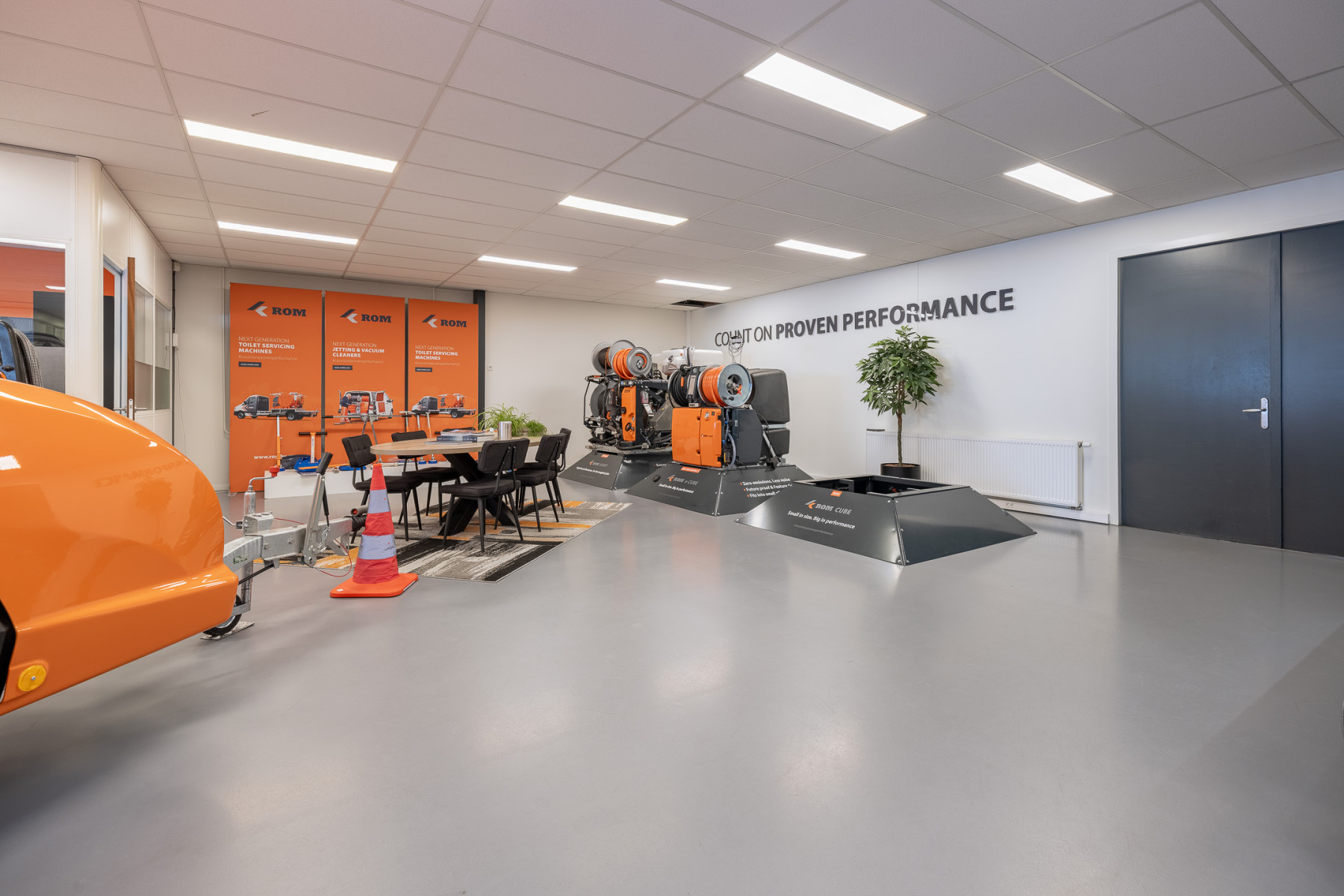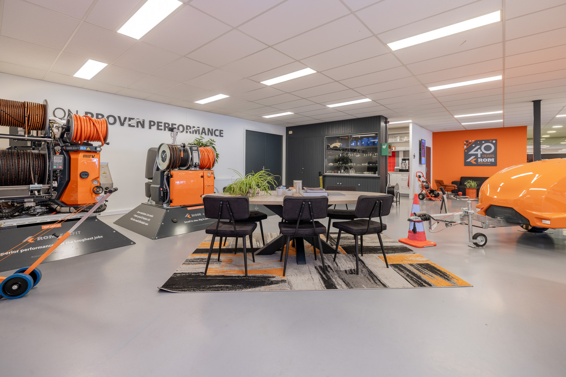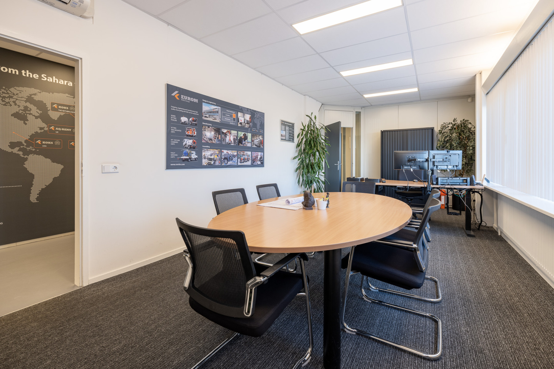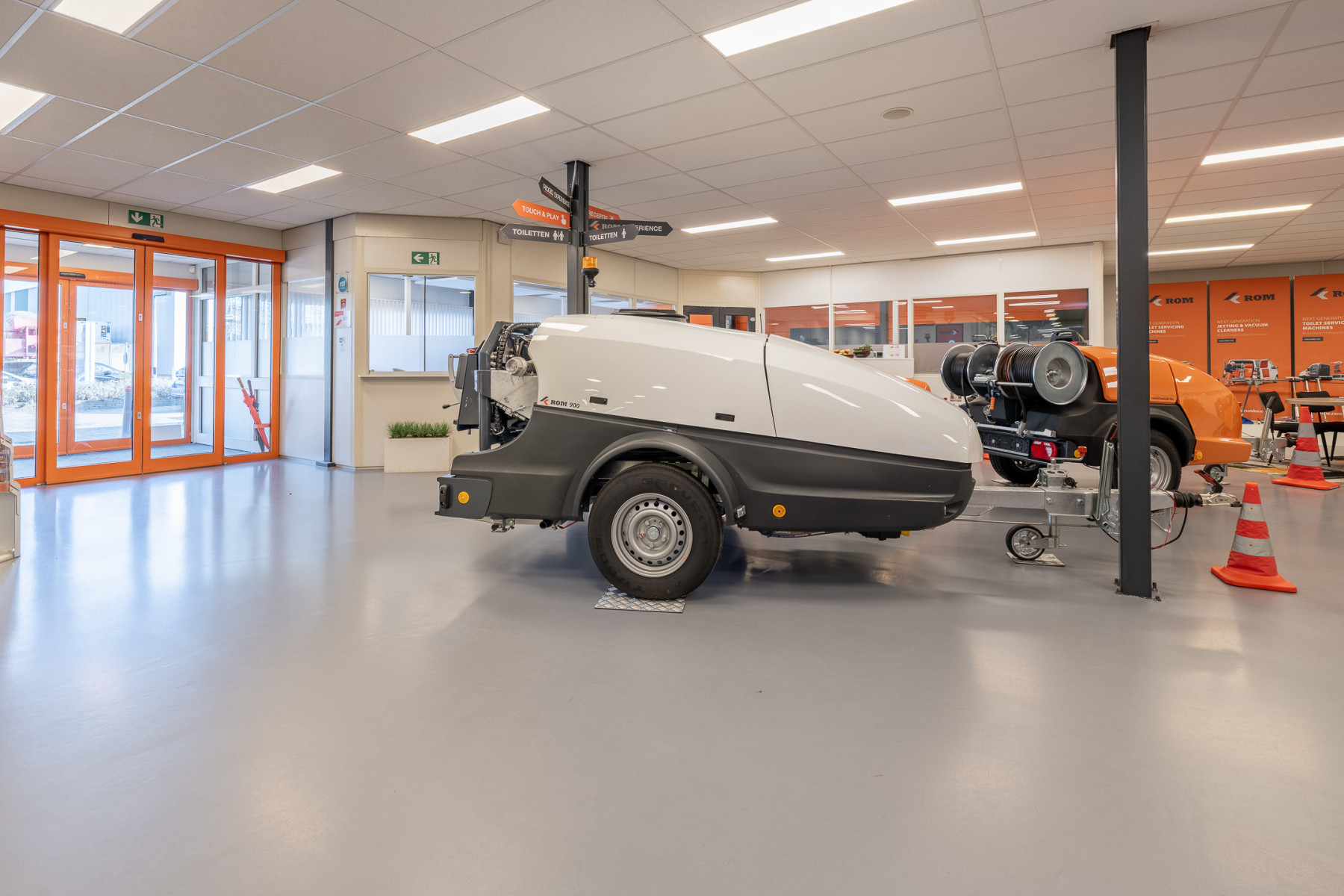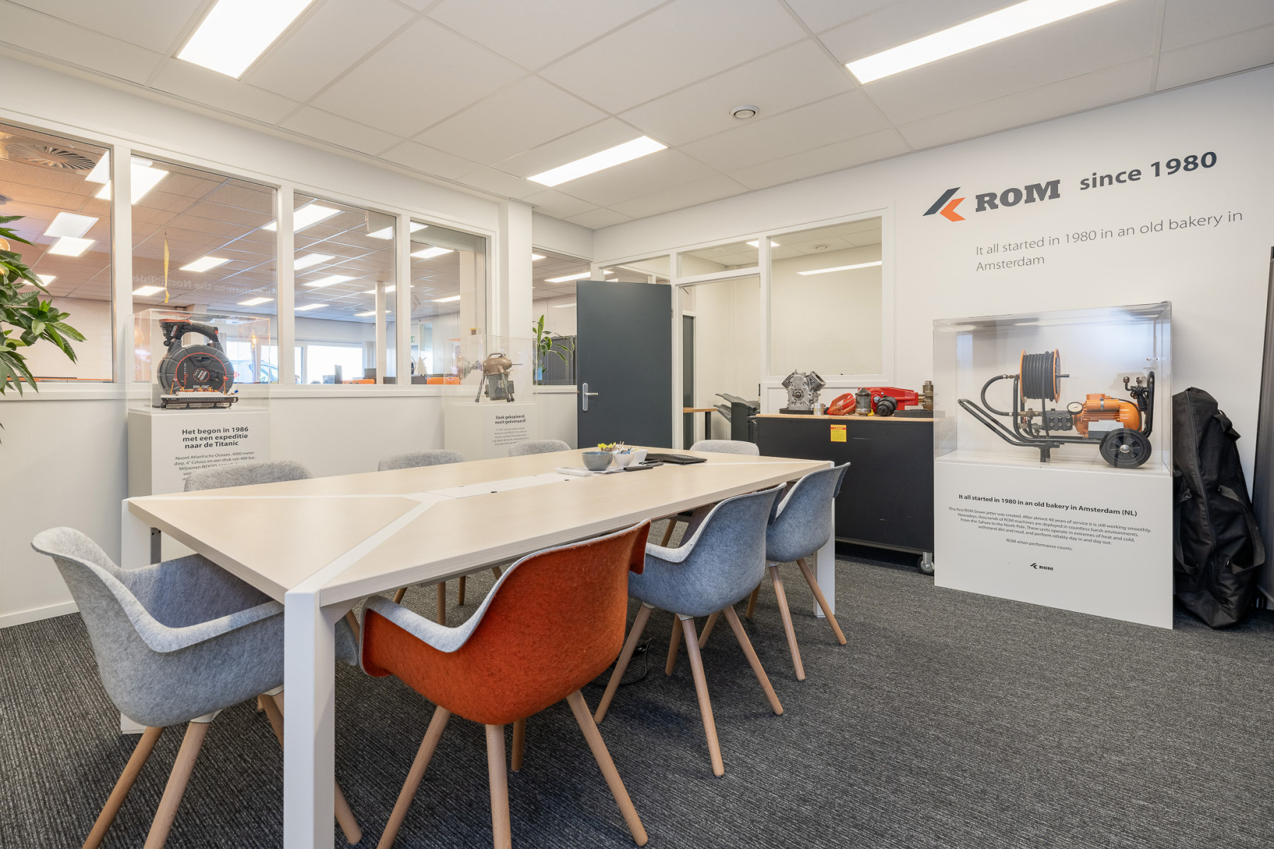 Achter het kantoor ligt de grote bedrijfsruimte/werkplaats gesplitst in meerdere afdelingen. Ook zijn er sanitaire voorzieningen, een pantry en een archief aanwezig. Op de verdieping bevinden zich extra kantoren en een kantine.