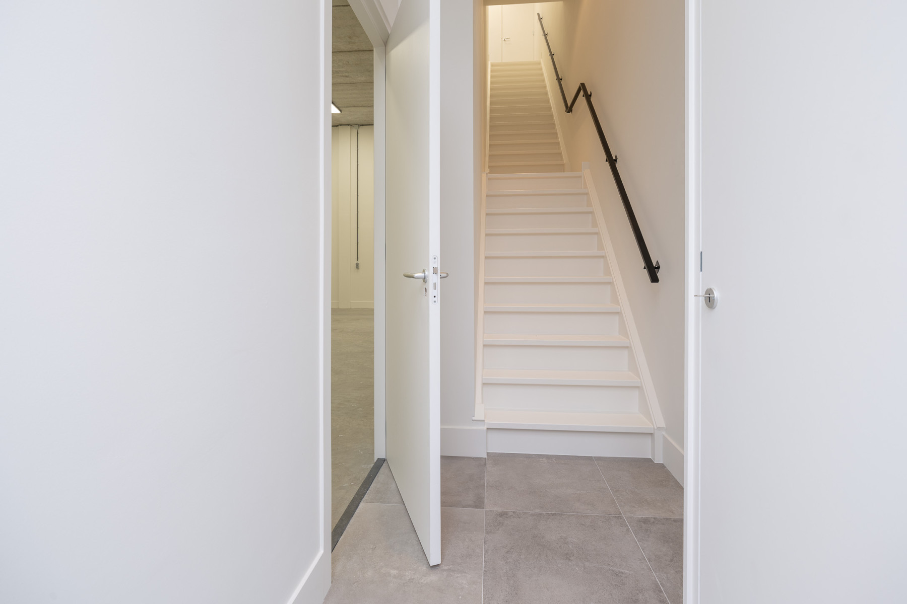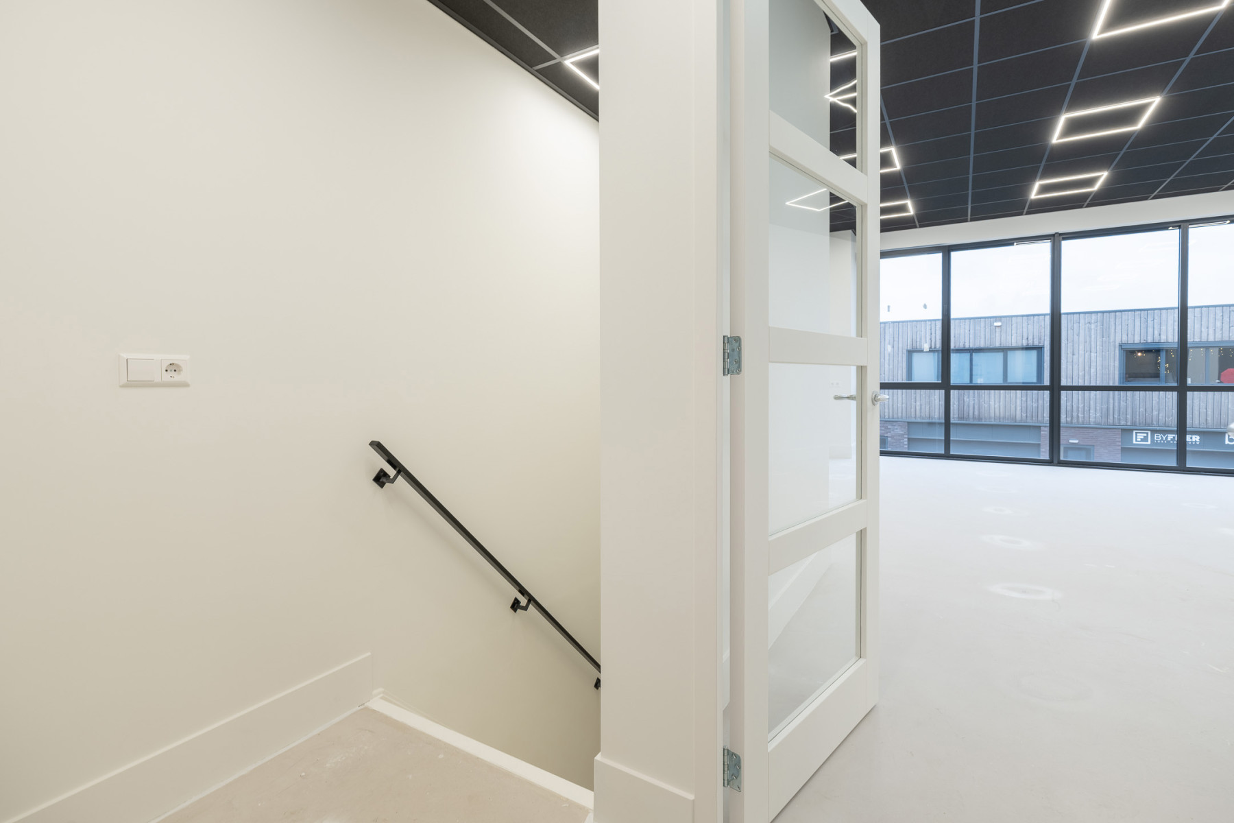 De begane grond bestaat uit een hal aan de rechtervoorzijde met meterkast en toegang tot de open bedrijfsruimte. Aan de rechterzijde liggen een toilet, een kast en een pantry. Op de verdieping komt de trap uit op een overloop met aan de voorzijde een badkamer. De rest van de verdieping is ingericht als open kantoorruimte met een keukenblok aan de linkerkant.