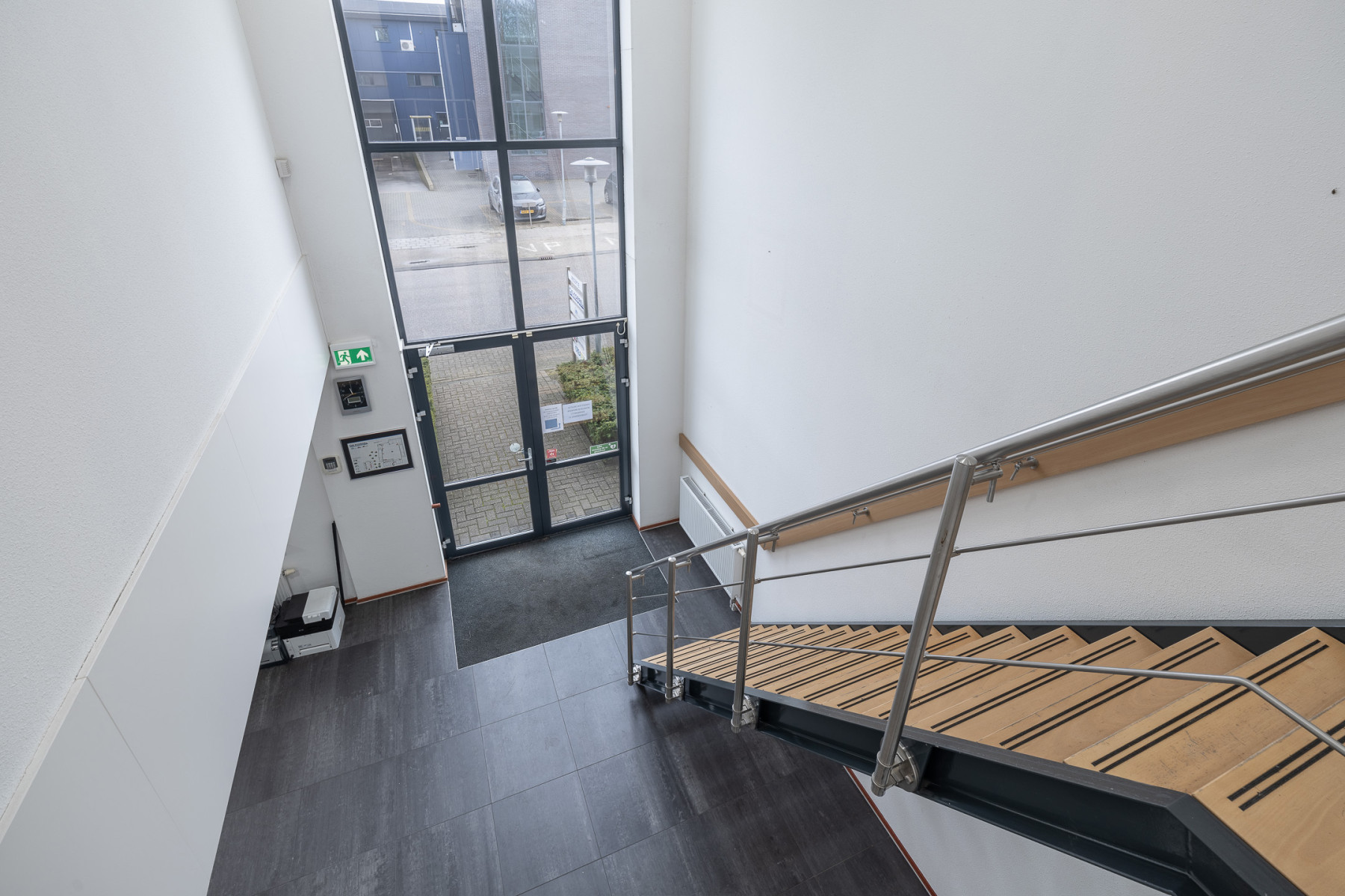 Begane grond: Bij binnenkomst betreedt u de ontvangstruimte, waar zich de balie bevindt. Hiervandaan is een kantoorruimte te bereiken, maar ook de hal. Deze hal geeft toegang tot alle zes kantoorruimtes op de begane grond, tot twee opslagruimtes, de keuken en twee toiletruimtes. Door de aanwezigheid van meerdere buitendeuren en trapopgangen is deze kantoorruimte eenvoudig op te splitsen.