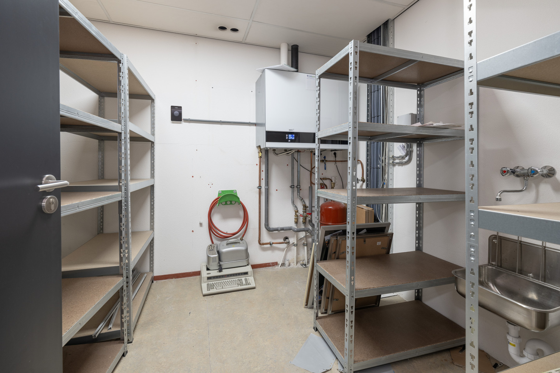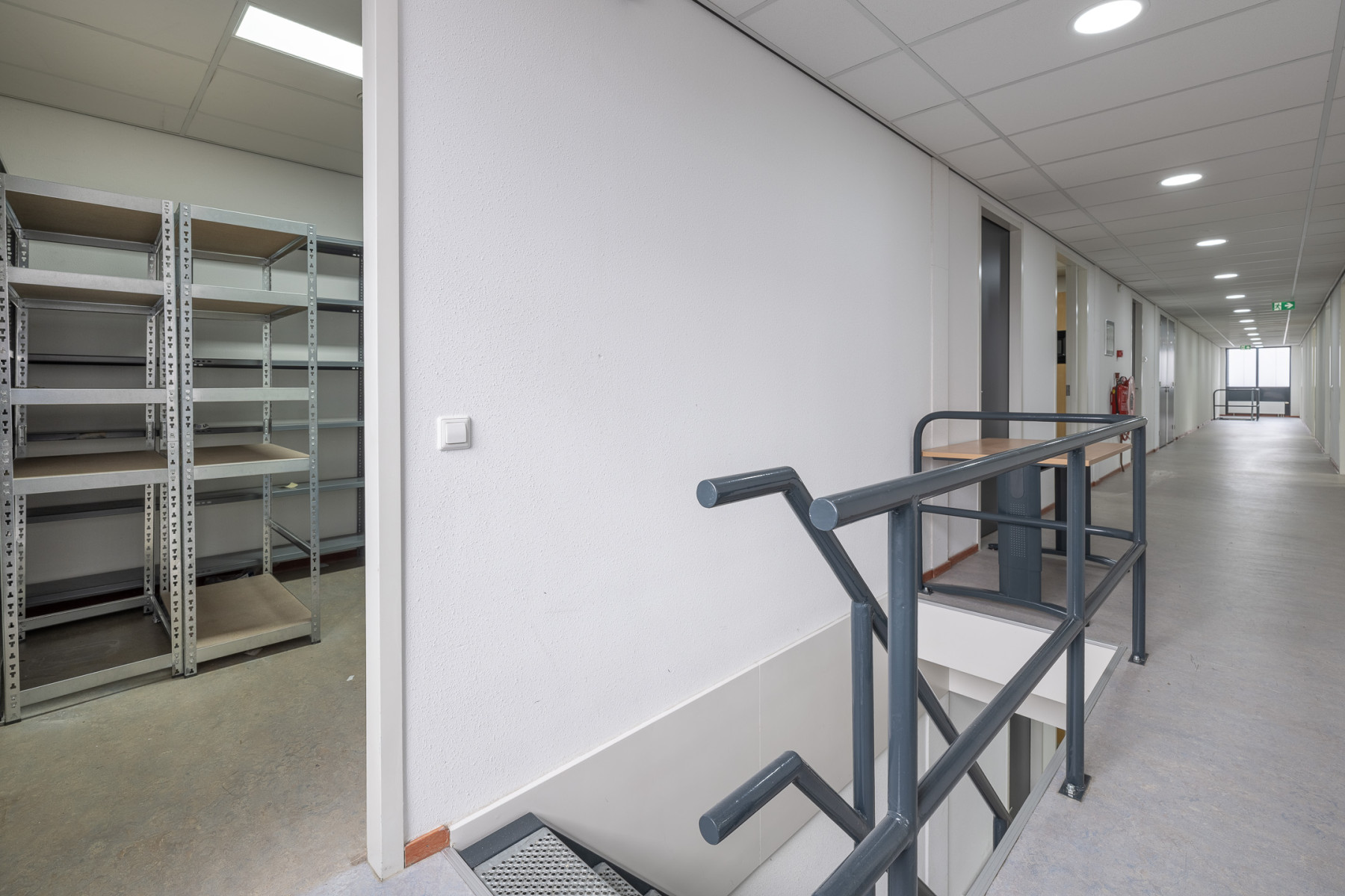 Verdieping: Deze gang is aan weerszijden toegankelijk via drie trapopgangen. De lange hal geeft hier toegang tot vier kantoorruimtes, drie opslagruimtes, een keuken en twee toiletruimtes.
