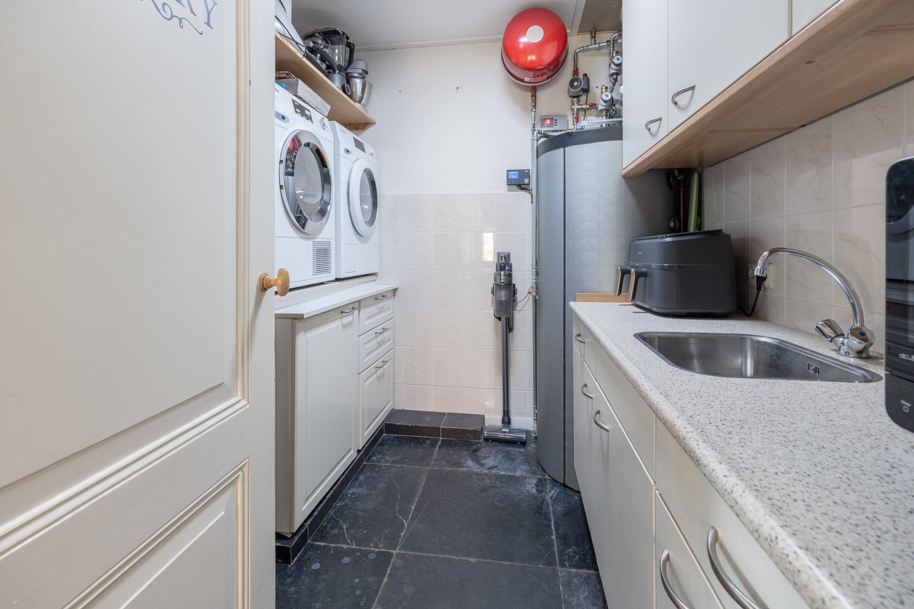 De bijkeuken met een tegelvloer is een fijne toevoeging aan de woning. De ruimte is optimaal ingericht. Aan de ene kant vindt u de witgoedapparatuur op hoogte met daaronder vaste kasten, ideaal voor het dagelijkse gemak. Aan de andere zijde bevindt zich een warmwatervat en een keukenblok met spoelbak. Kortom; Een compacte ruimte die praktisch is ingericht en waar u alles bij de hand heeft.
