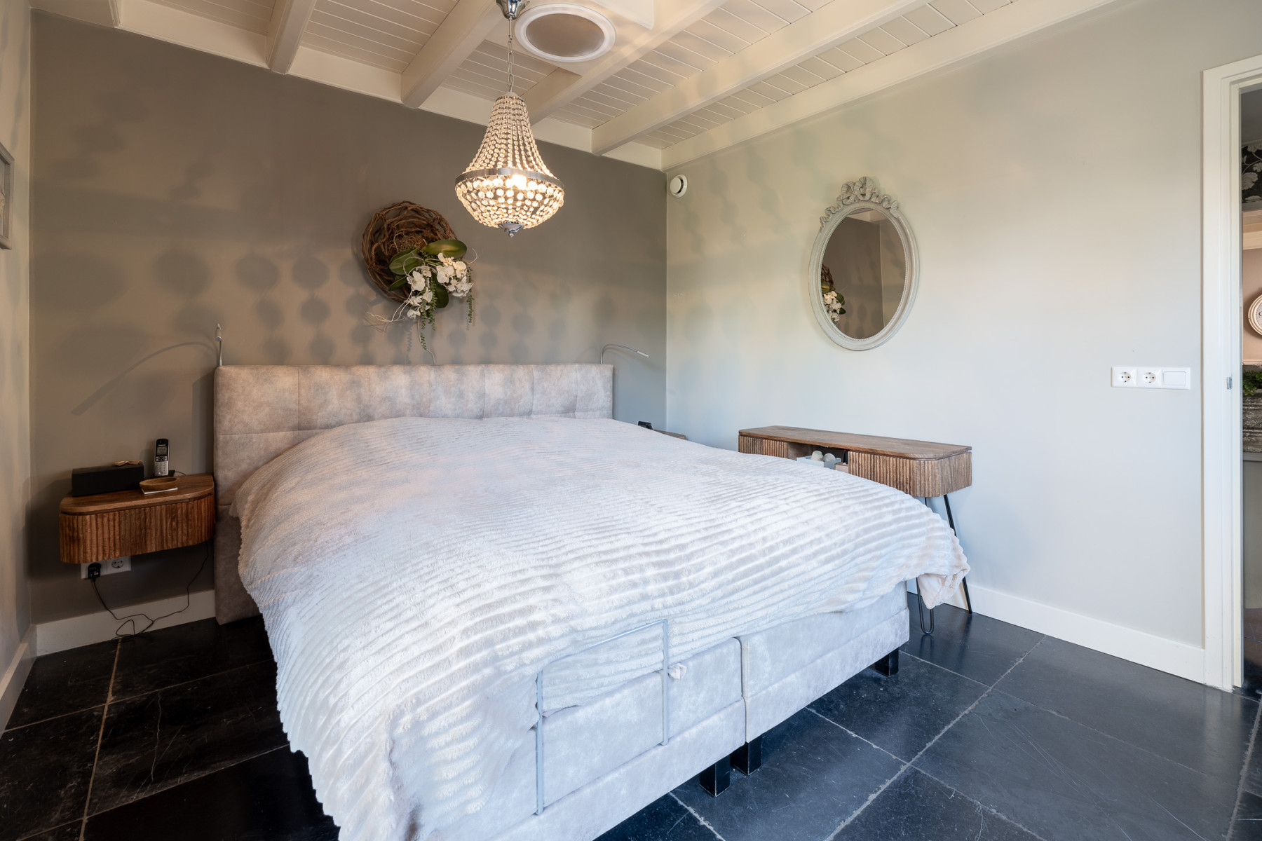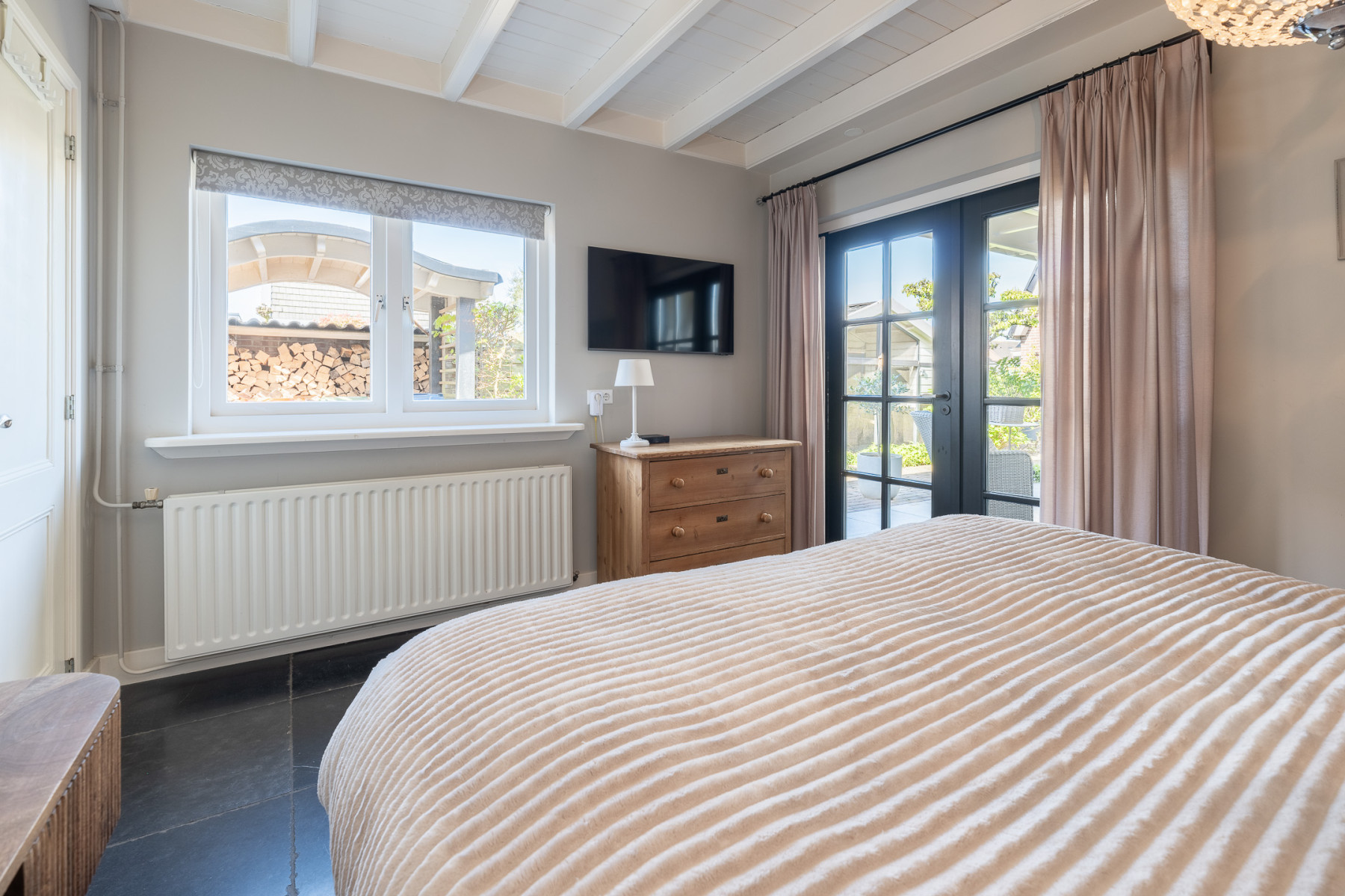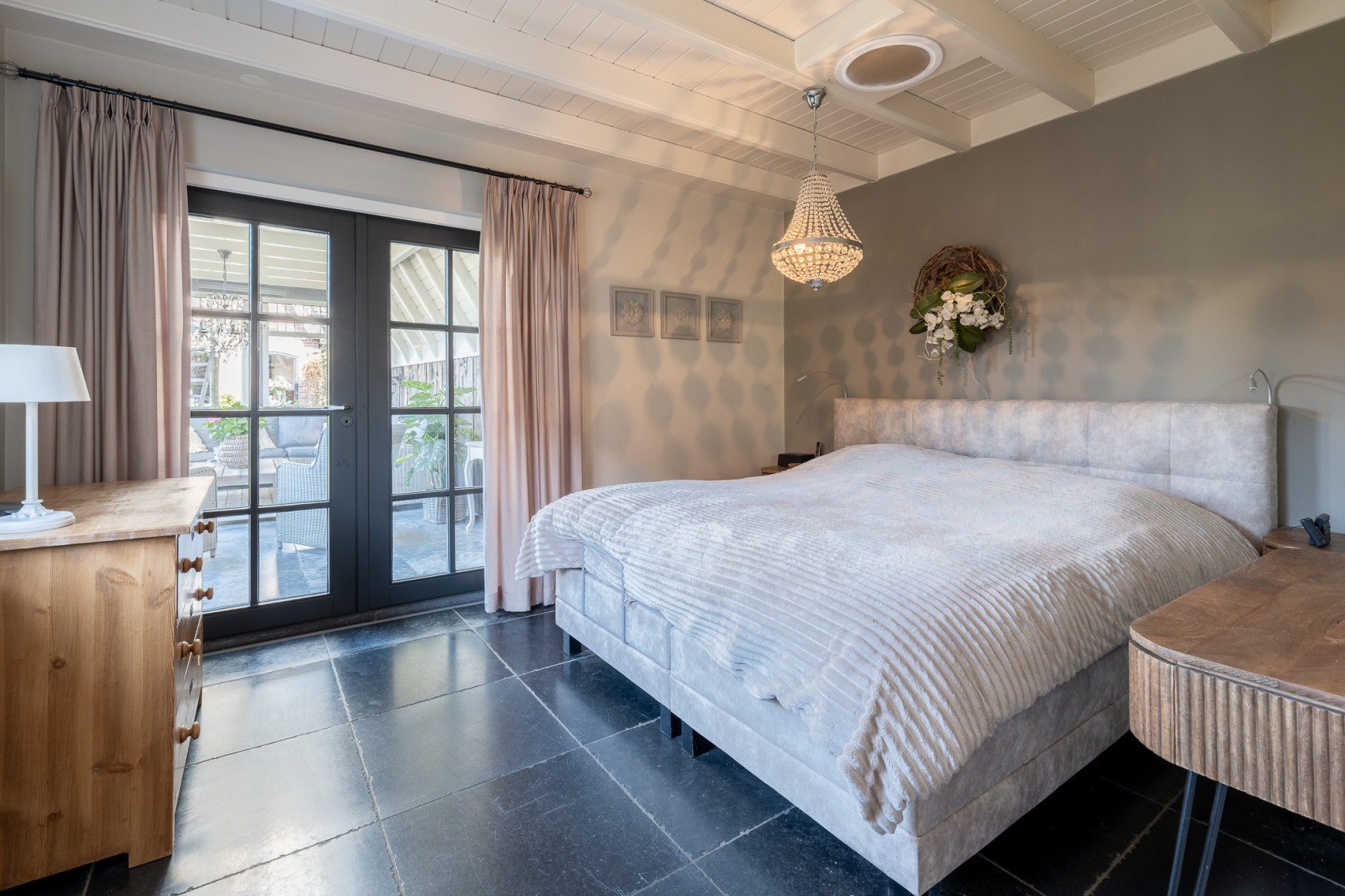 Aan de achterzijde van de woning is de slaapkamer op de begane grond te vinden. Het balkenplafond geeft karakter aan de ruimte. Verder is de slaapkamer afgewerkt met een donkere Castle Stone tegelvloer en lichte wanden. Een instapklare ruimte. De openslaande deuren naar de veranda maken deze kamer net even anders. Zet ze open op een mooie dag en laat de frisse lucht binnen. Hier begint uw dag gewoon goed. De deuren zijn voorzien van hordeuren.