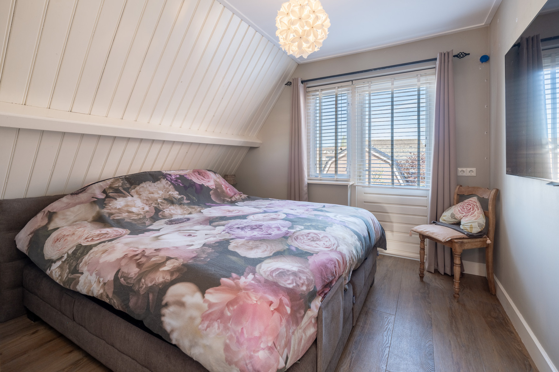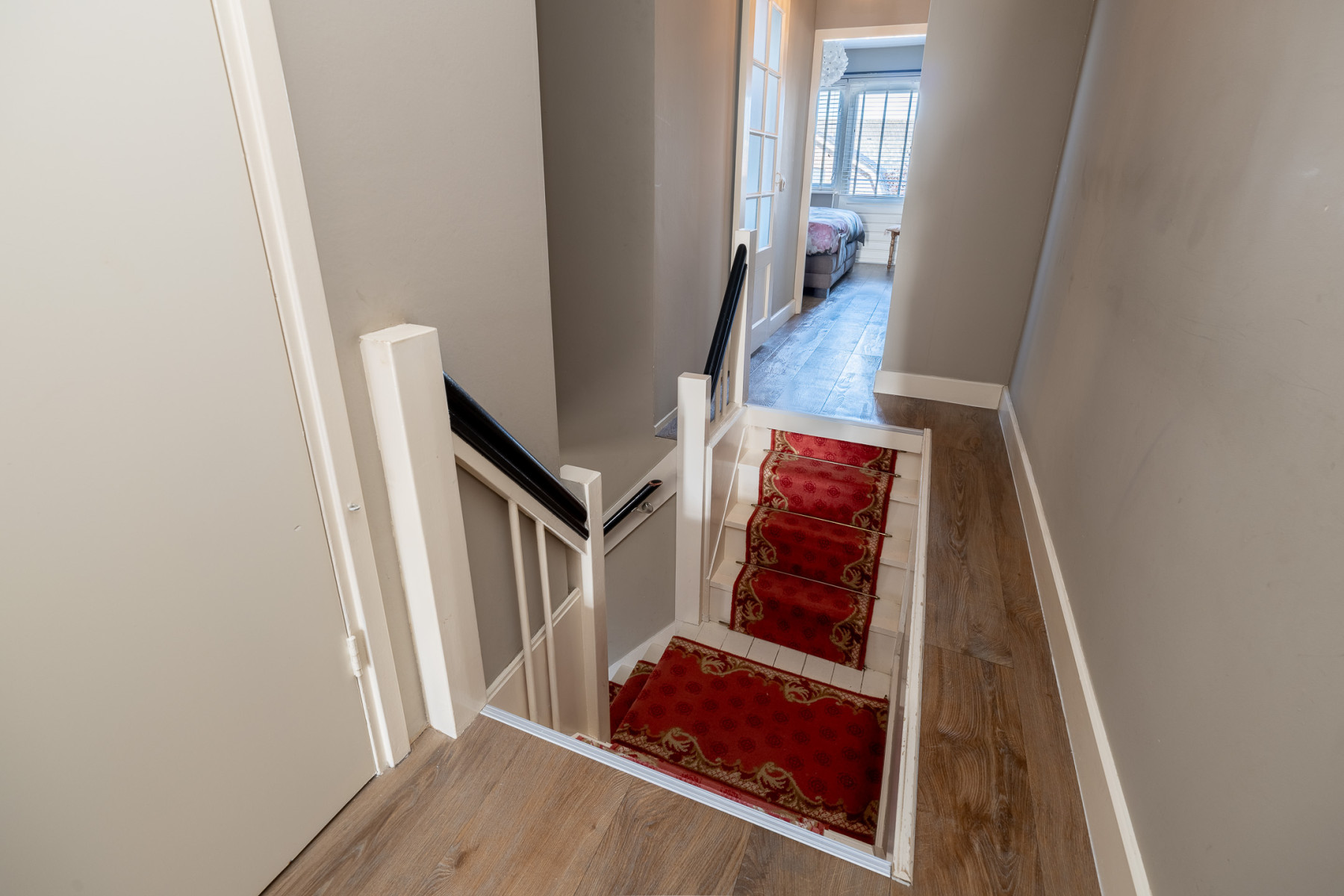 De trapopgang heeft iets wat u niet vaak ziet, het verbindt de verdieping op twee manieren. De klassieke trap met rode loper geeft meteen karakter. Boven aangekomen kunt u letterlijk twee kanten op. Handig als u privacy wilt creëeren of ruimtes apart wilt gebruiken. Aan de ene zijde vinden we een ruime slaapkamer die u toegang geeft tot het platte dak. Verder is hier ook nog een ruimte te vinden die op dit moment in gebruik is als heuse inloopkast. Een droom van elke vrouw. Deze kamer is voorzien van een Velux dakraam. Uiteraard kunt u deze kamer ook gebruiken als slaapkamer. Op de overloop treft u een vaste kast aan met de opstelling van de cv-ketel. Aan de andere kant zijn nog twee slaapkamers te bereiken. Beide kamers hebben een uitstekende maatvoering. Op één kamer beschikt u over een dakkapel. Op de overloop is een vaste kastenwand te vinden, compleet met legplanken, hanggedeelte én verlichting. Via de overloop krijgt u toegang tot de vliering. Hier kunt u gemakkelijk uw seizoensgebonden spullen opbergen.