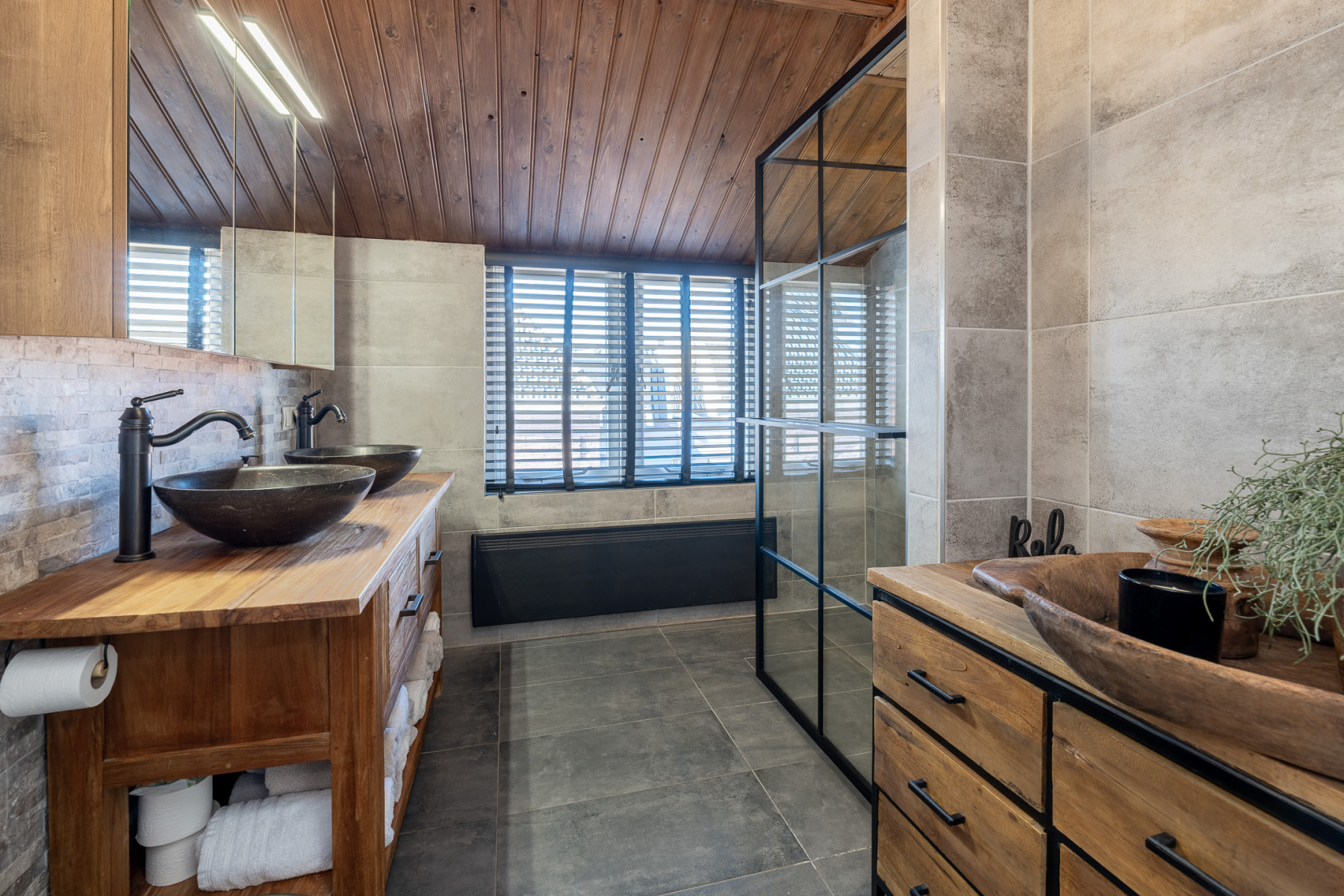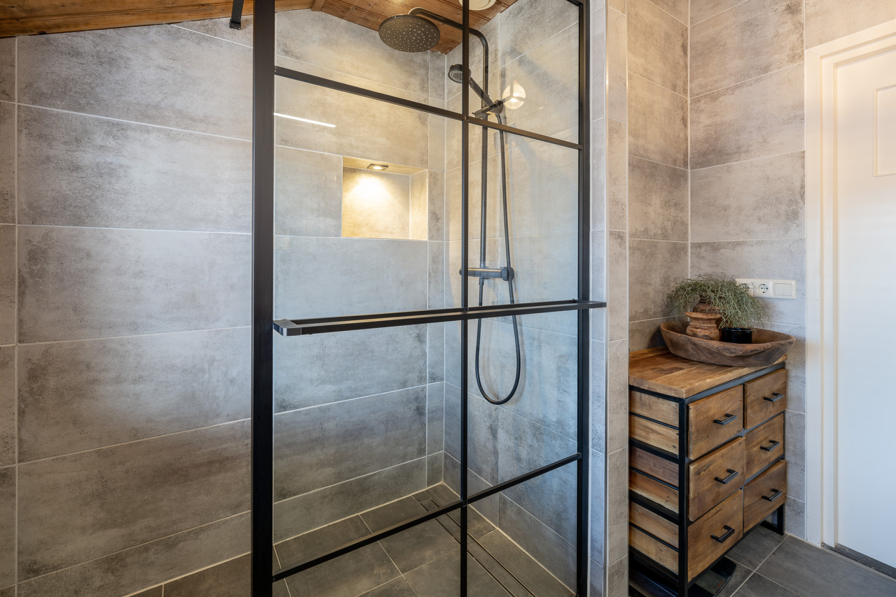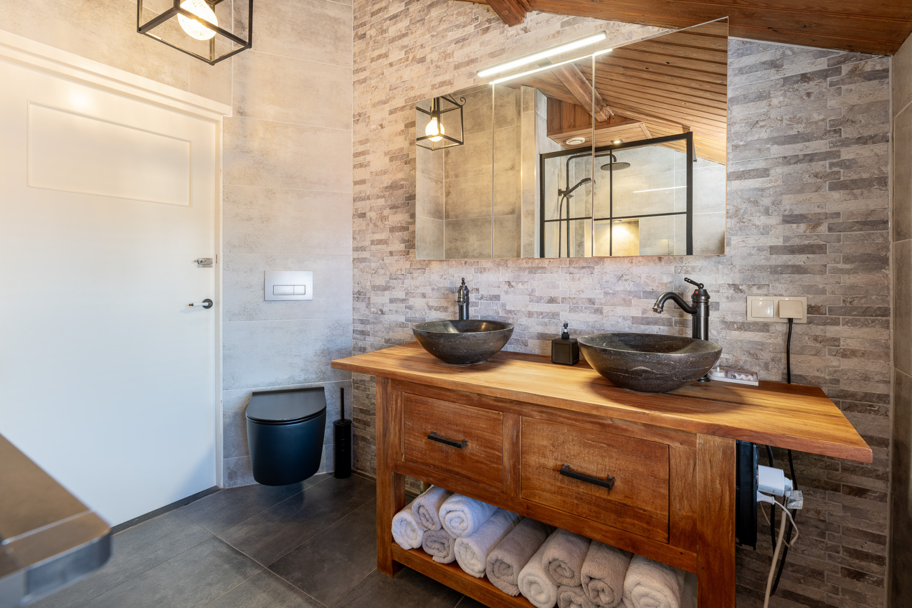 In deze badkamer bent u klaar voor dagelijks gebruik. De inloopdouche is ruim en voorzien van een regendouche en een handig nisje voor uw shampoo en zeep. Verder vindt u in de badkamer een wastafelmeubel in een mooie houtlook met twee waskommen, erg praktisch. De badkamer is afgewerkt met een combinatie van houttinten en zwarte accenten wat zorgt voor een warme uitstraling.