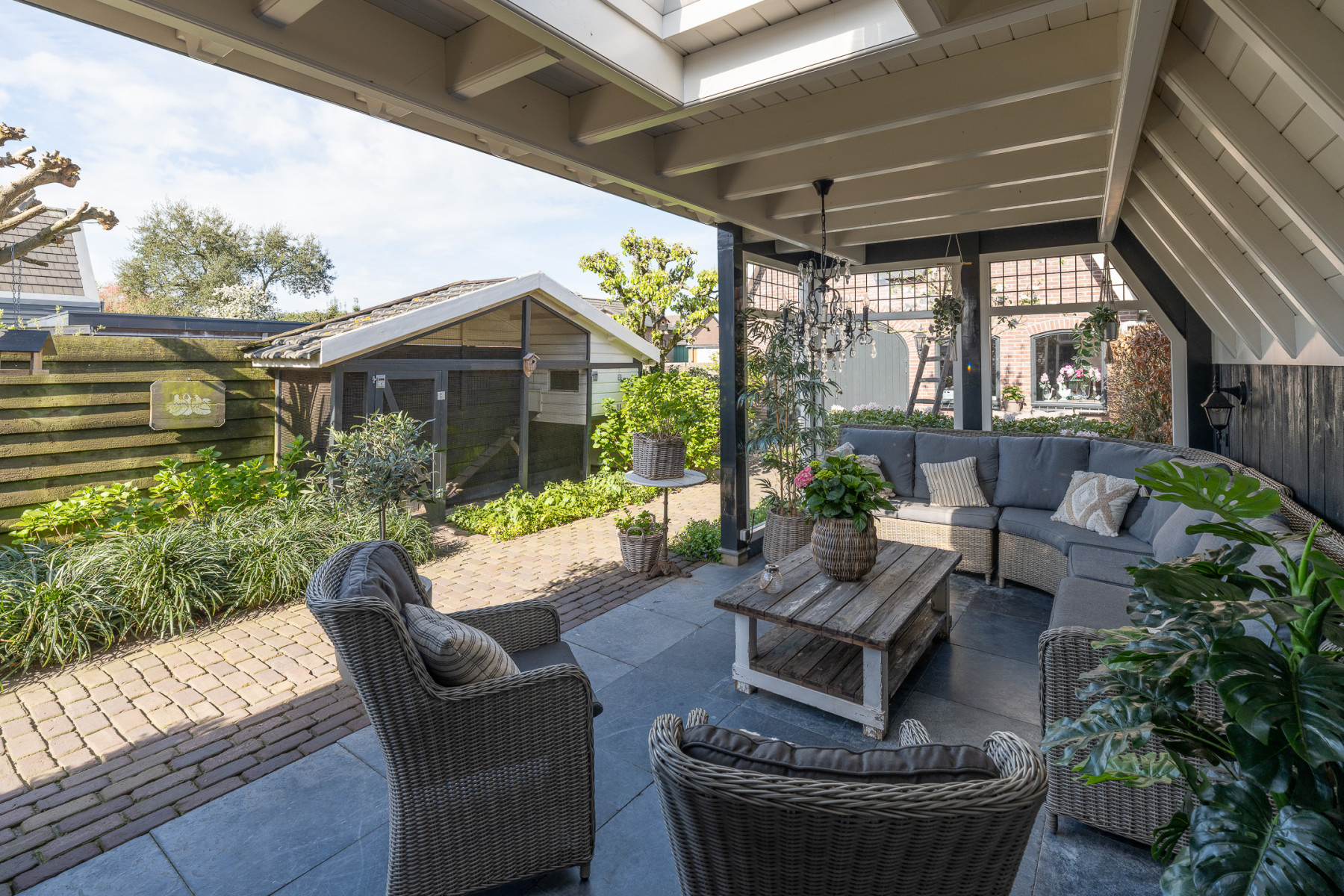 In deze tuin stapt u 's morgens in de vroegte vanuit de achterentree het terras op waar u kunt genieten van het ontbijt én de ochtendzon. Ook is hier de buitendouche te vinden, een fijne verkoeling op hete zomerdagen. Later op de dag verplaatsen we ons naar het terras achterin de tuin, hier geniet u de rest van de dag van de zon. En 's avonds? Dan is de veranda een fijne plek, hier vertoeft u met het gezin, familie of vrienden tot in de late uurtjes. De veranda sluit aan bij de woning, met een balkenplafond en glas-in-loodramen die direct sfeer geven. De lichtkoepel zorgt voor extra daglicht, zo is het echt een extra leefgedeelte. De tuin is gelegen op het zuiden waardoor u hier van veel zonuren profiteert. De combinatie van groen, bestrating en zelfs een kippenhok maakt het speels en levendig. De goudreinet appelboom zorgt niet alleen voor fruit, maar ook voor een prachtige bloesem in het voorjaar. De tuin is middels een poort, met openslaande deuren, volledig af te sluiten. Kortom; Een tuin waar u gewoon graag bent. Veel groen, volop privacy en altijd wel een fijne plek in de zon of schaduw.