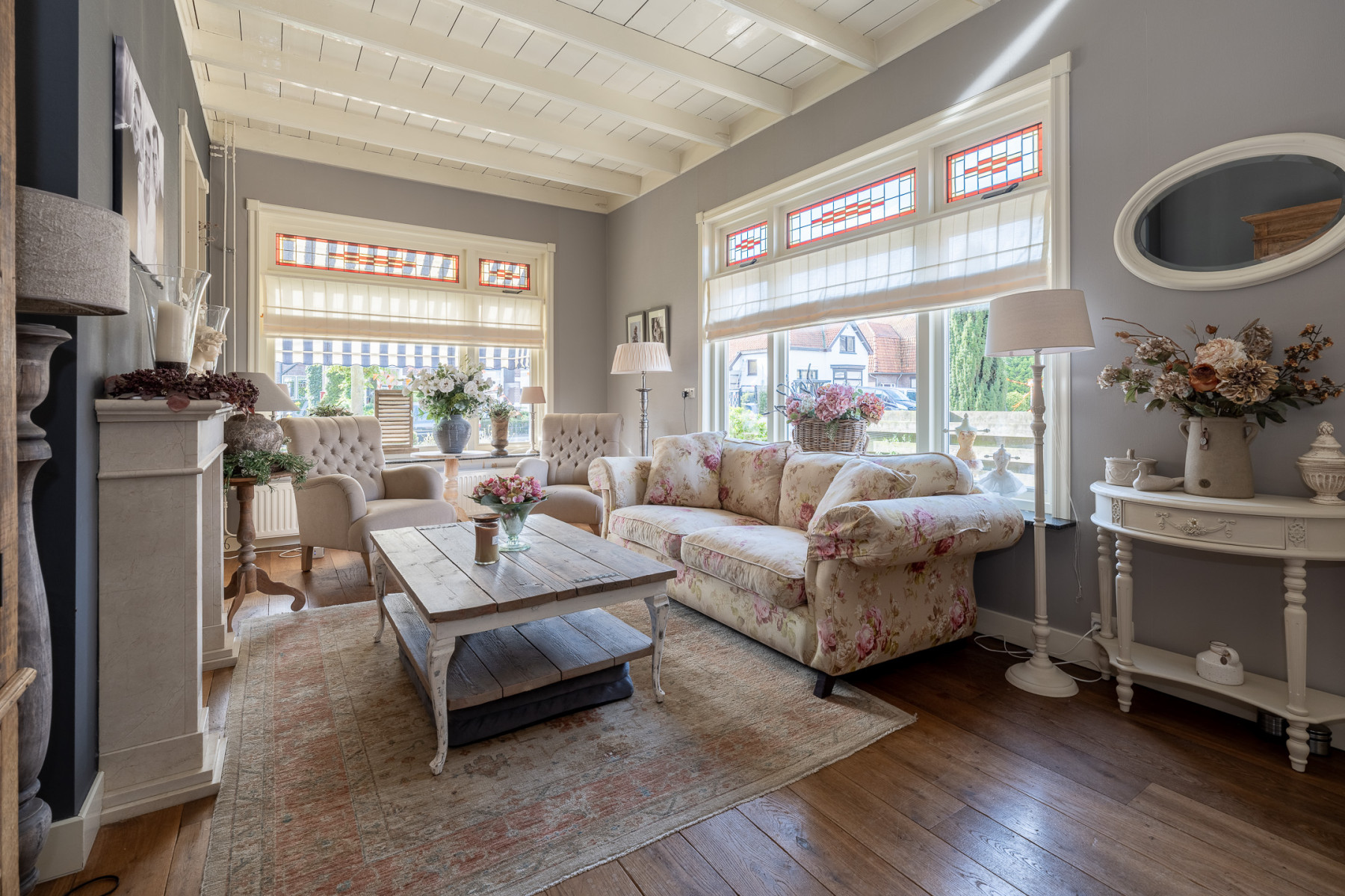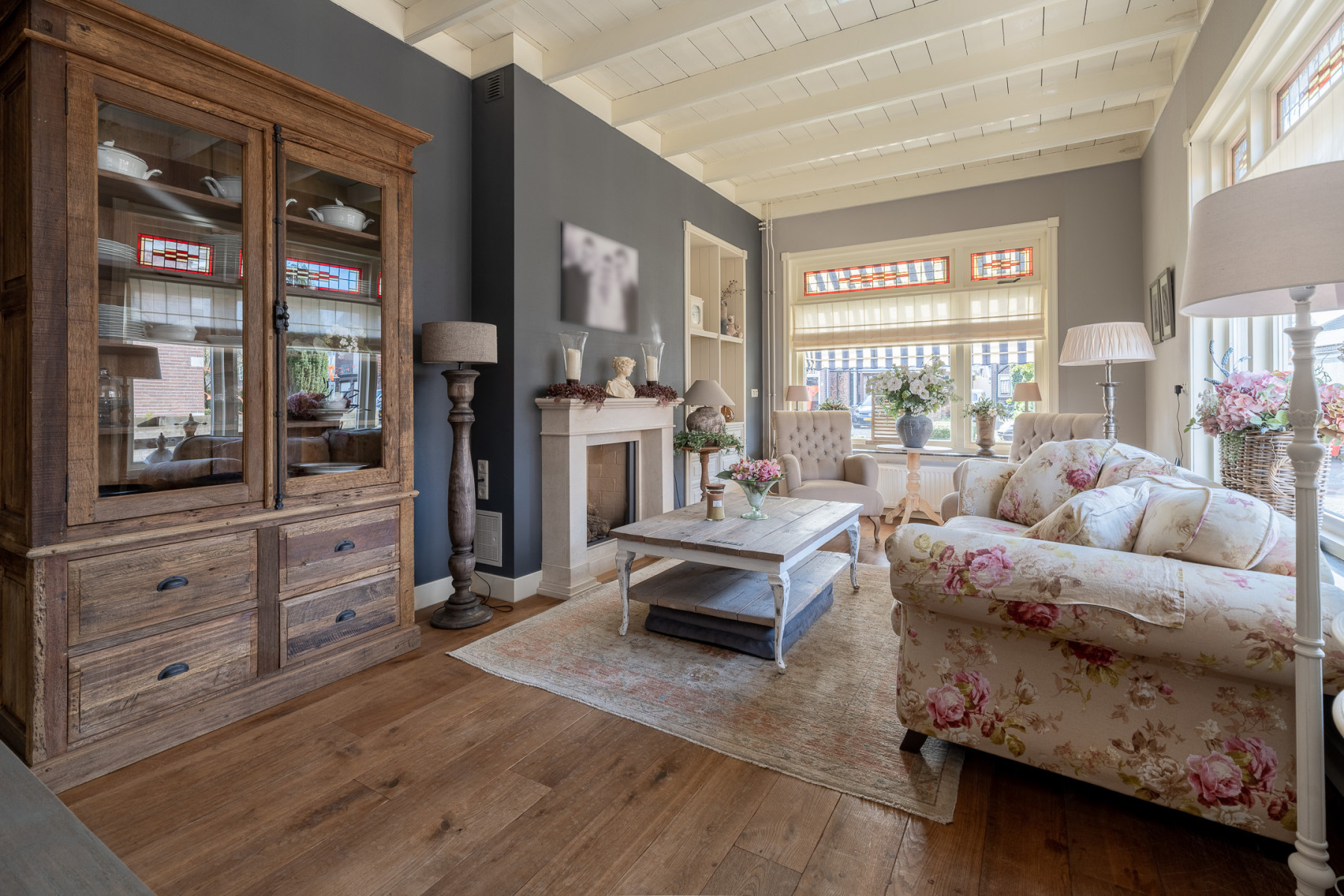 De woonkamer heeft een moderne uitstraling met diverse jaren '30 kenmerken. De glas-in-lood ramen voegen een vleugje nostalgie toe aan de ruimte. Ook andere authentieke kenmerken zijn er te vinden, zoals het balkenplafond en de houten vloer. De woonkamer is verder netjes afgewerkt en in de ruimte profiteert u van twee vaste kasten én een gaskachel. Dat maakt het binnen zitten nog eens extra aantrekkelijk. Door de twee raampartijen valt er veel daglicht naar binnen. Er is voldoende plek voor een gezellige zithoek. Het is een ruimte waar u graag tijd doorbrengt met het gezin, familie of vrienden.