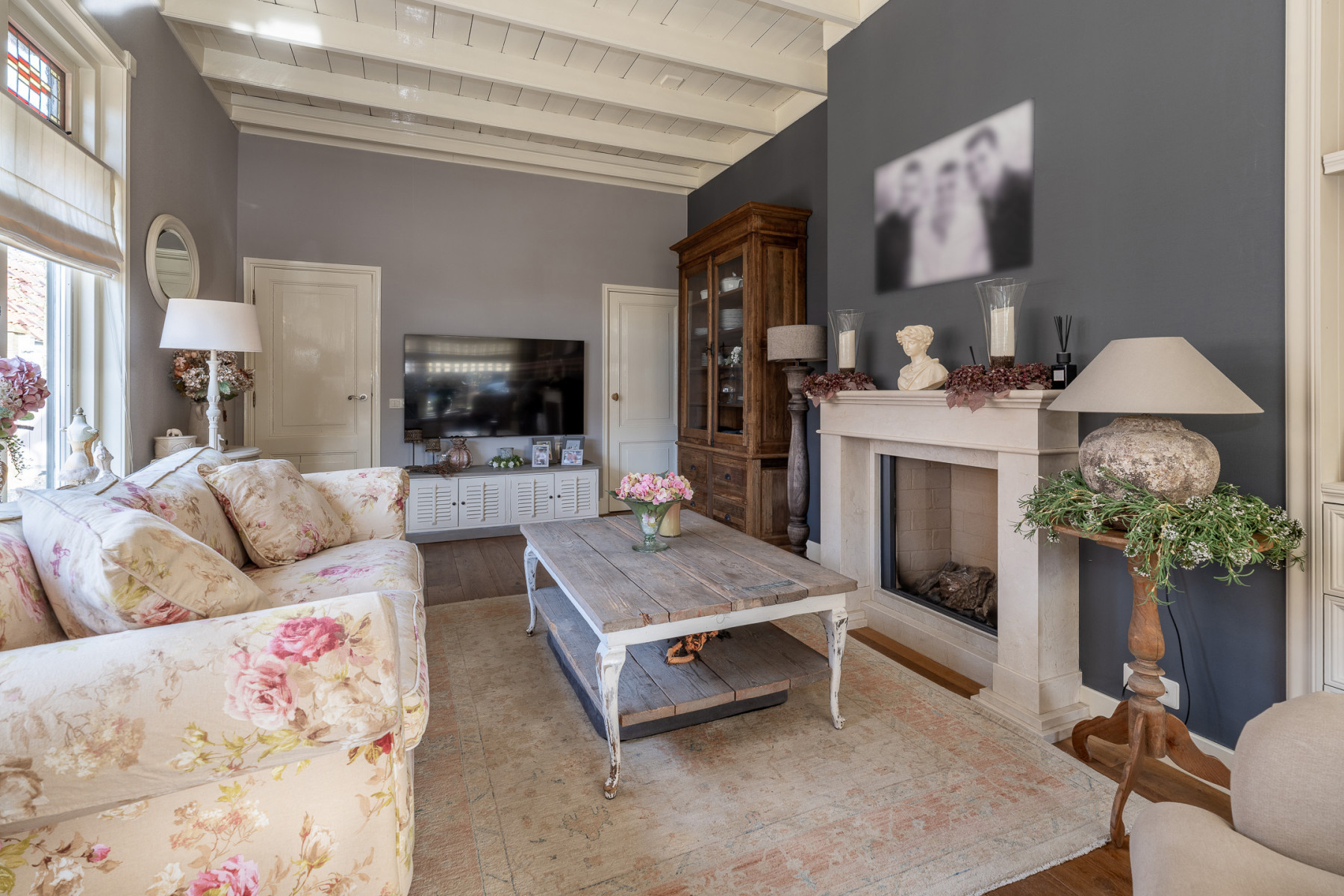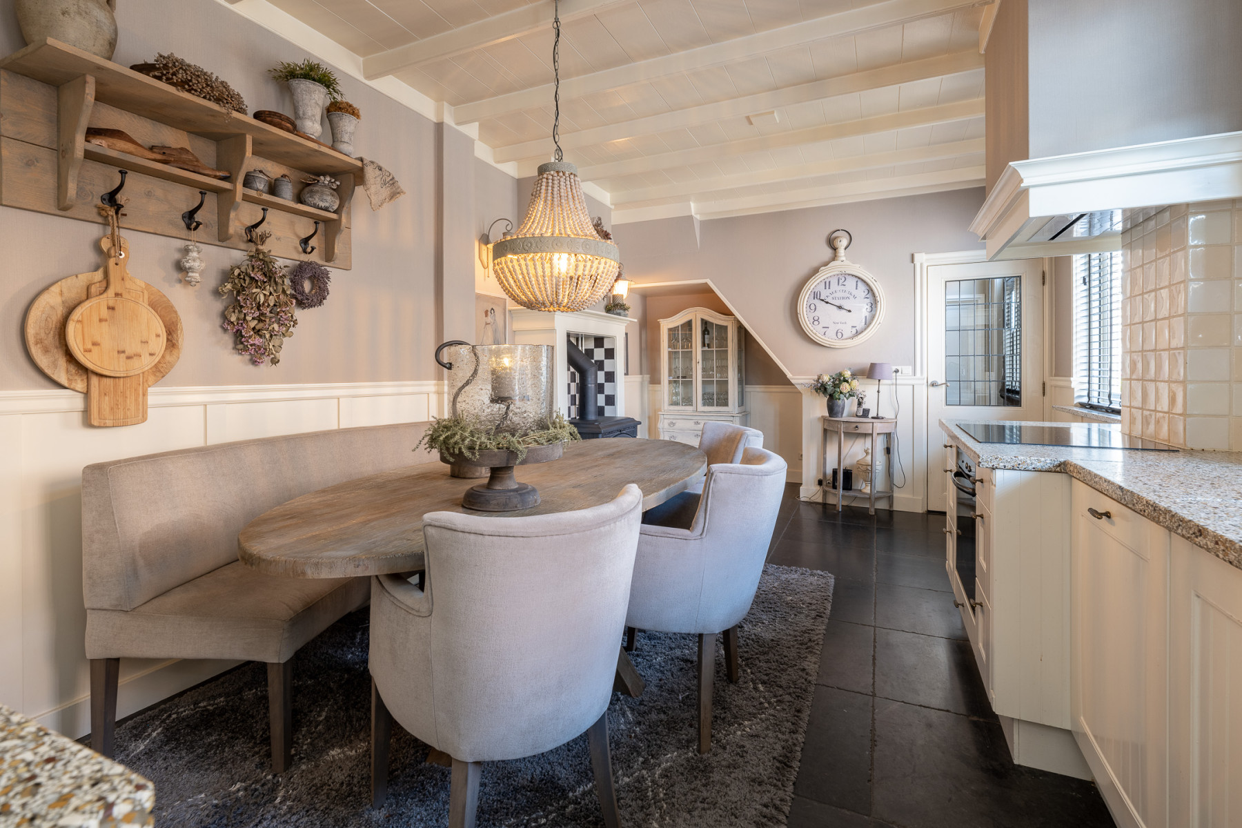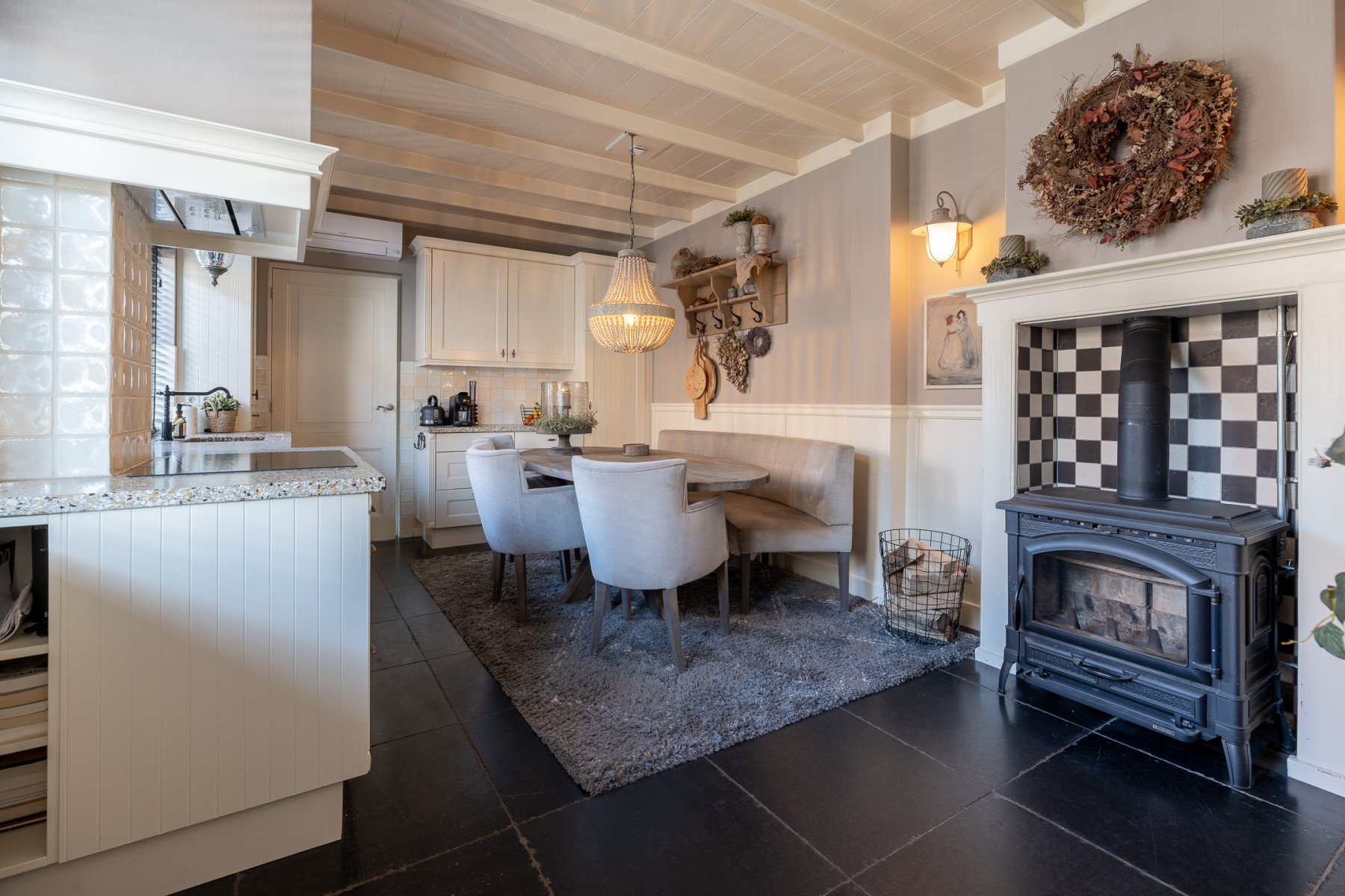 Genieten van een heerlijke maaltijd of gewoon even gezellig bijkletsen, in deze woonkeuken kan het allemaal. In deze ruimte wordt geleefd. De keuken zelf is in twee delen opgesteld, zo beschikt u hier over veel werk- en opbergruimte. Koken doet u op een 4-pits inductiekookplaat. Verder is de keuken voorzien van een afzuigkap, een oven, een koelkast en een Bosch vaatwasmachine (2025). Hier maakt u de lekkerste gerechten klaar. Is het wat kouder, zet dan lekker de houtkachel aan en geniet van een fijne warmte én sfeer. De airconditioning die kan verkoelen en verwarmen is een fijne bijkomstigheid, zo blijft het het hele jaar comfortabel. Ook in deze ruimte komen de karakteristieke elementen terug, zoals het balkenplafond en de glas-in-loodramen.