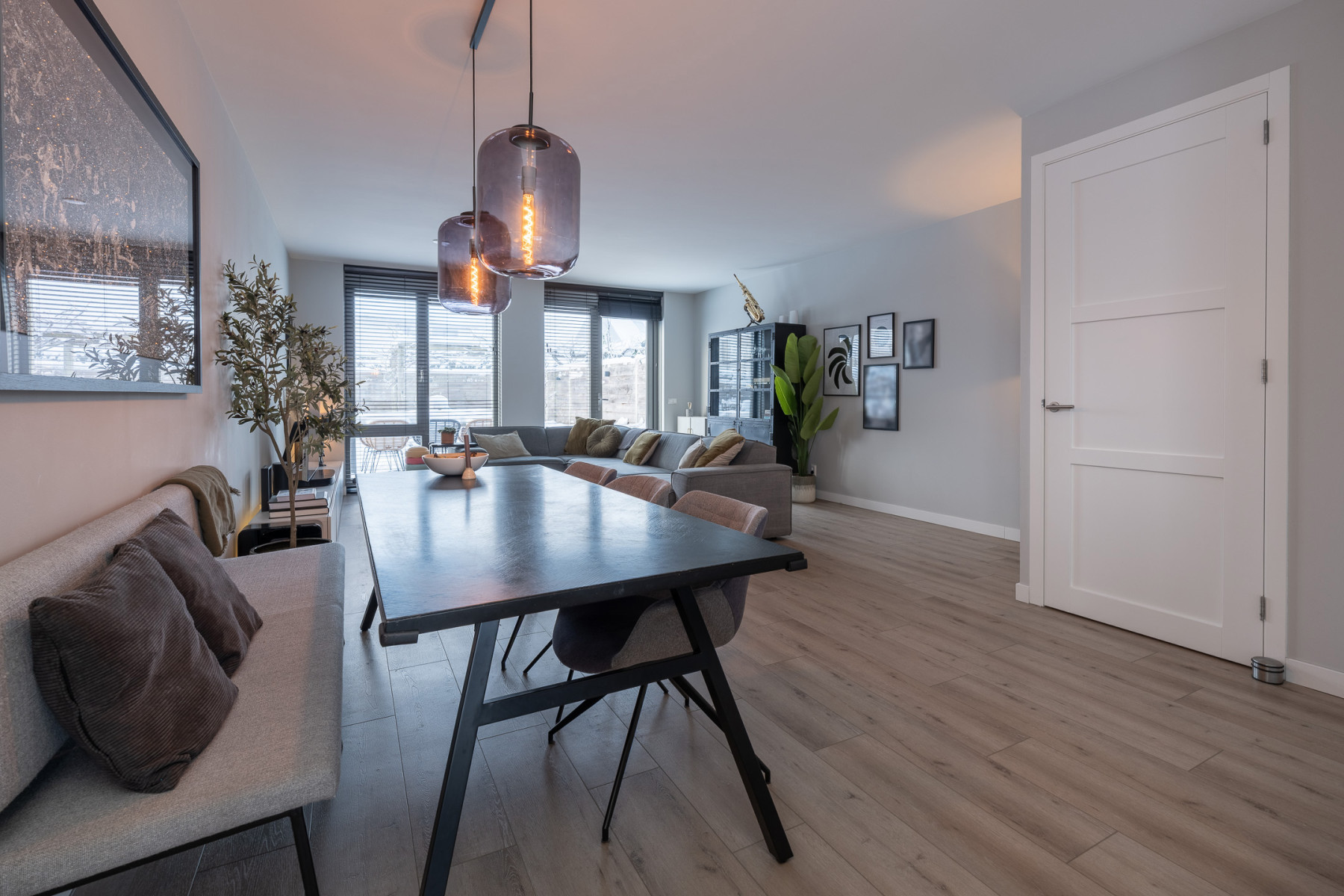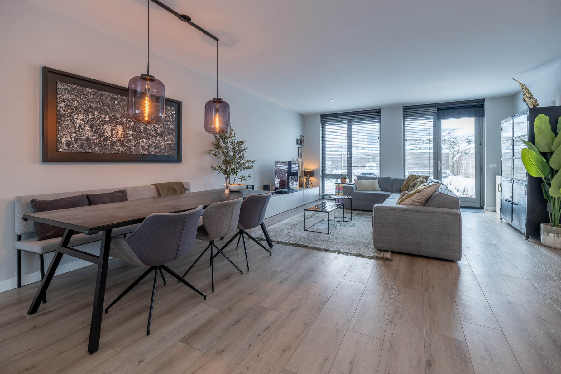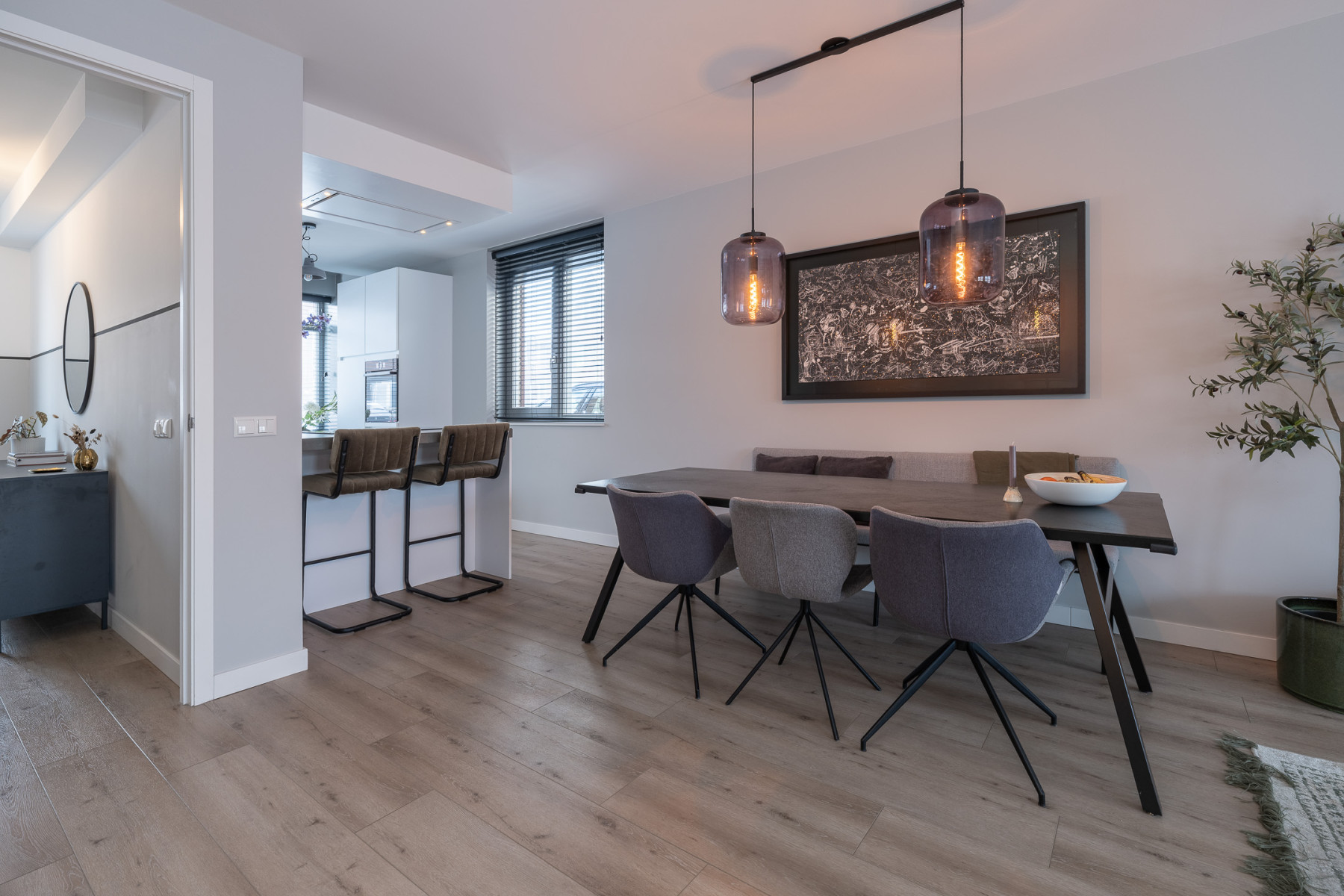 De woonkamer is een ruimte waar iedereen zich thuis voelt. U kunt hier een heerlijke zithoek creëren waarbij u leuk zicht heeft op de achtertuin, er zijn namelijk grote raampartijen aanwezig die zorgen voor veel licht. Er is hier gekozen voor een lichte afwerking met een houten PVC-vloer en gestucte plafonds wat het geheel een frisse en rustige uitstraling geeft. U treft aan de rechterzijde nog een praktische trapkast, handig voor voorraad of alles wat u uit het zicht wilt houden. Als u richting de keuken loopt vindt u nog plek voor een eethoek.