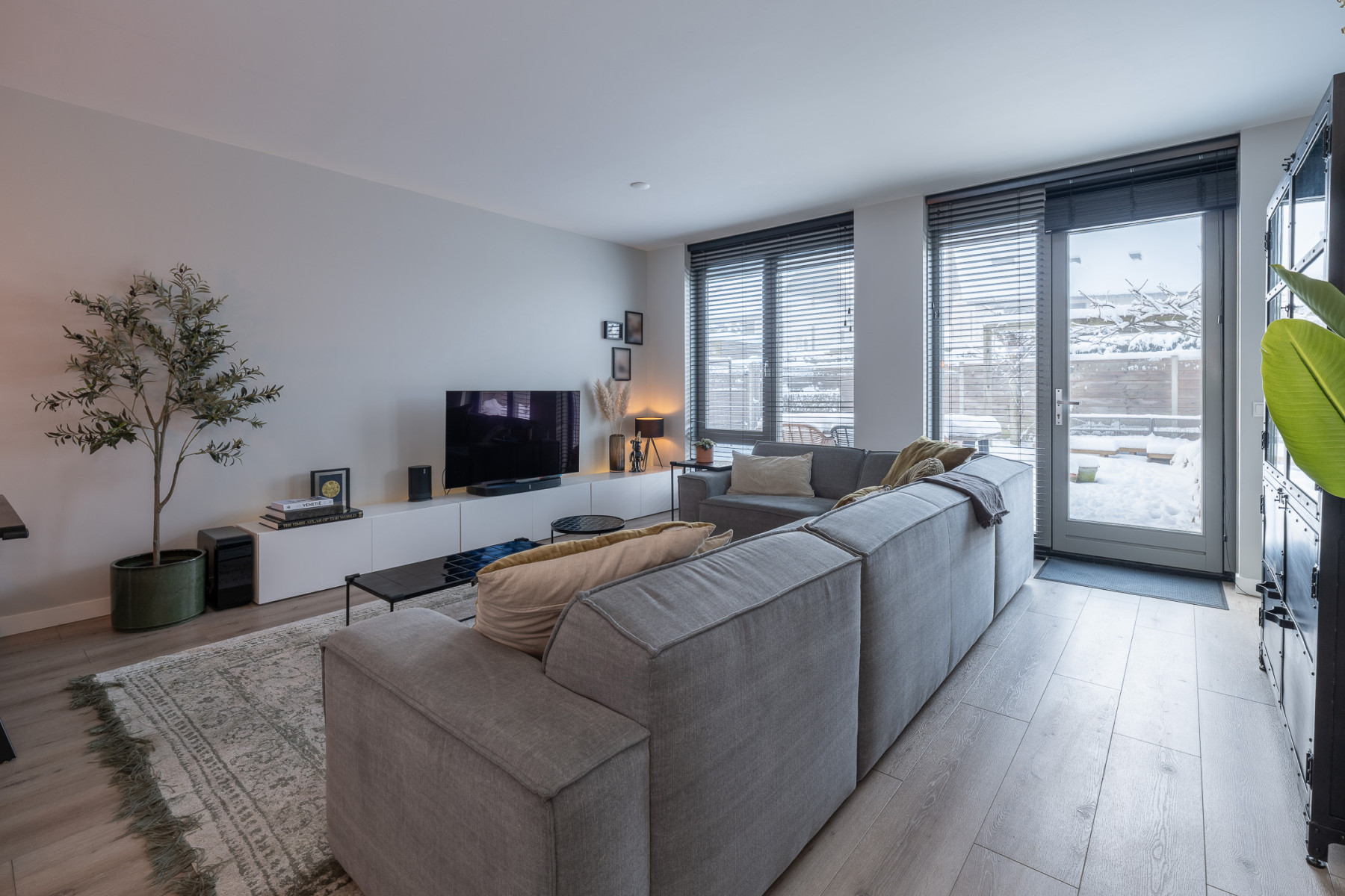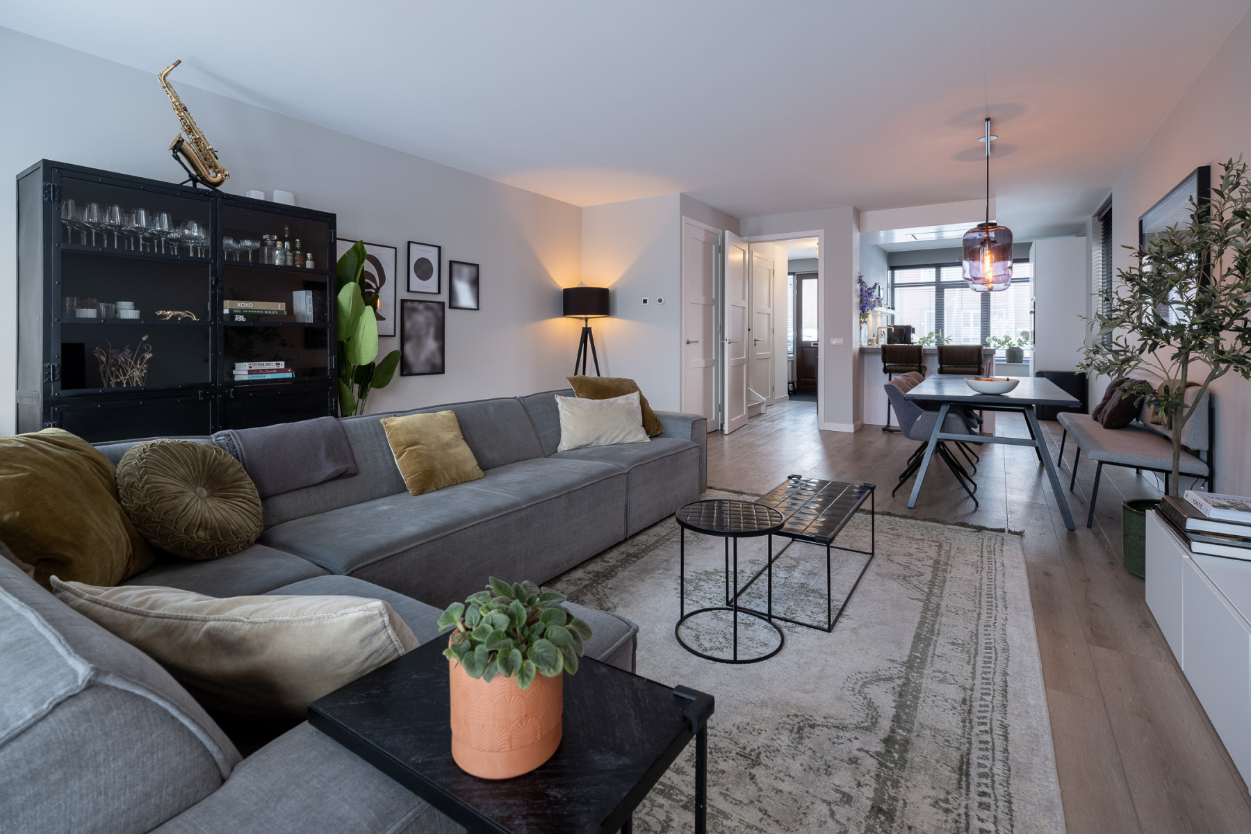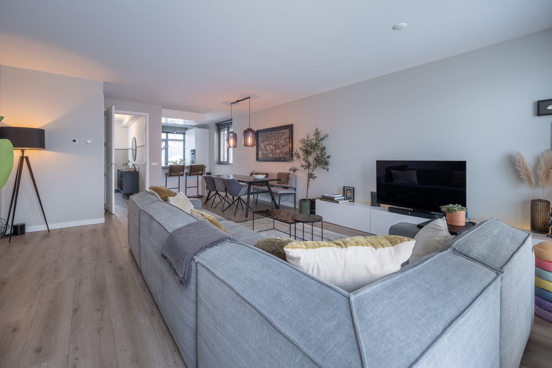 De woonkamer is een ruimte waar iedereen zich thuis voelt. U kunt hier een heerlijke zithoek creëren waarbij u leuk zicht heeft op de achtertuin, er zijn namelijk grote raampartijen aanwezig die zorgen voor veel licht. Er is hier gekozen voor een lichte afwerking met een houten PVC-vloer en gestucte plafonds wat het geheel een frisse en rustige uitstraling geeft. U treft aan de rechterzijde nog een praktische trapkast, handig voor voorraad of alles wat u uit het zicht wilt houden. Als u richting de keuken loopt vindt u nog plek voor een eethoek.