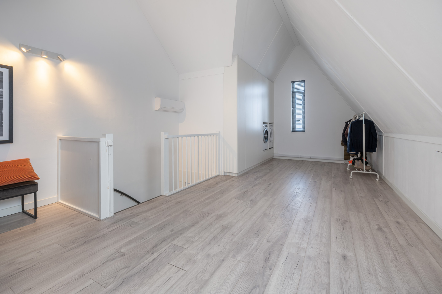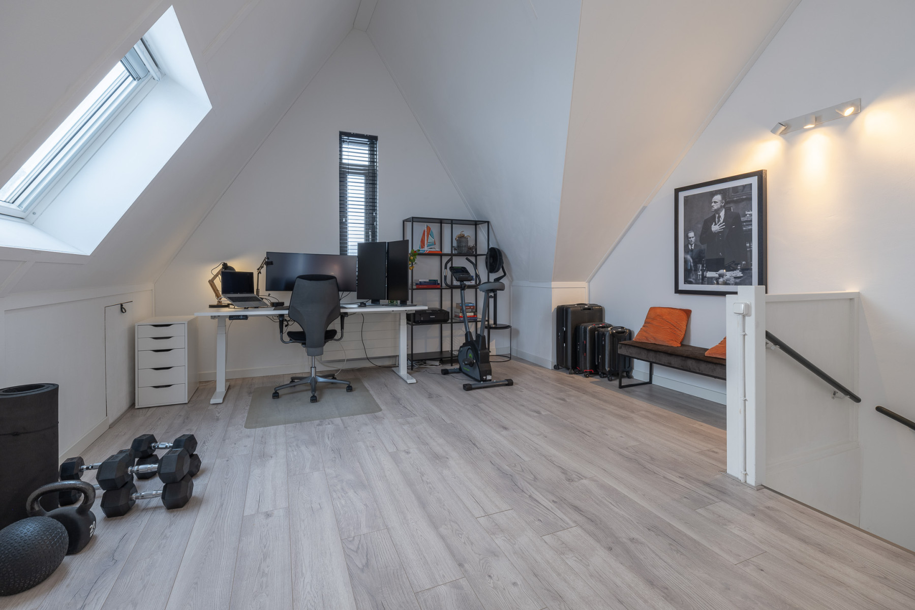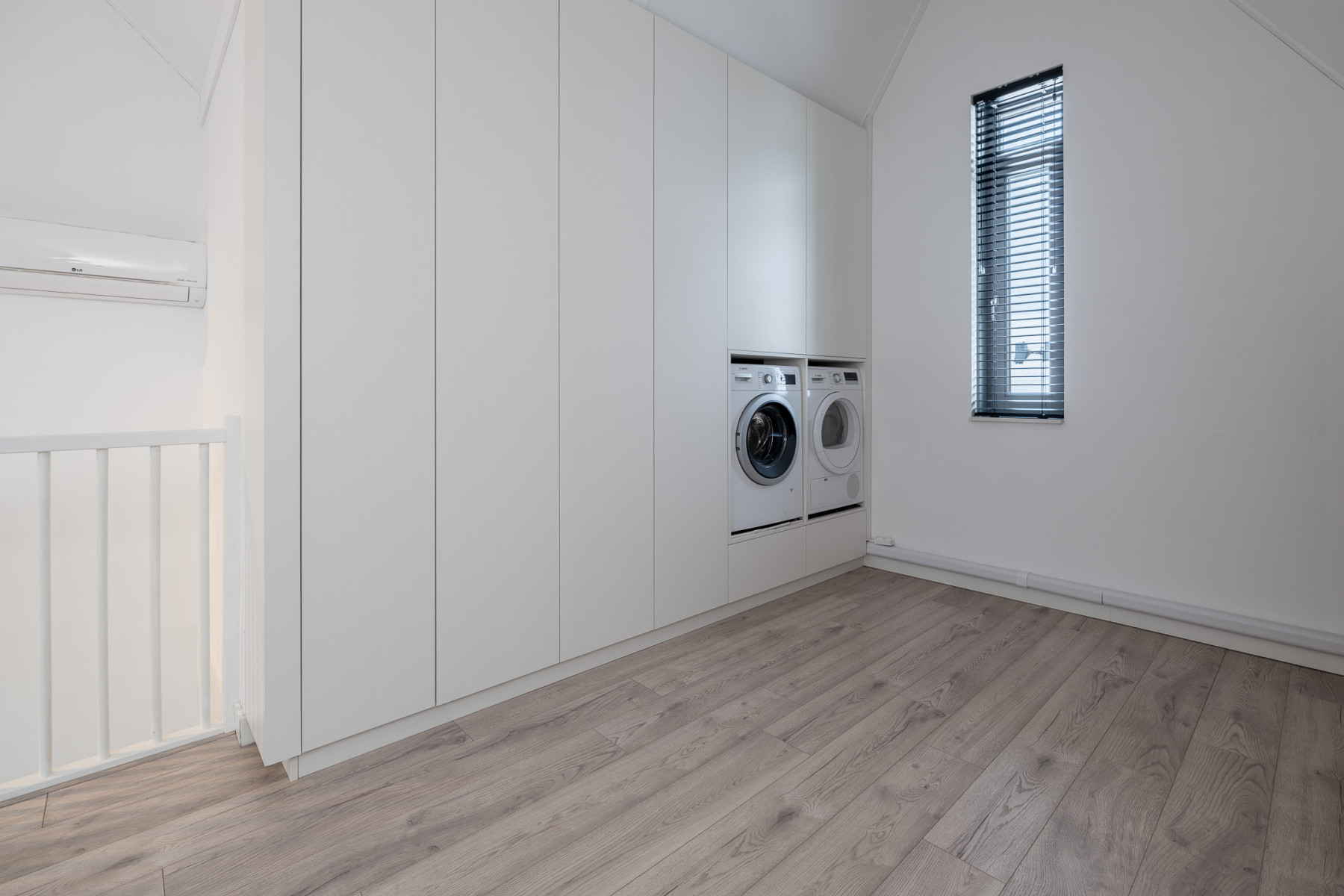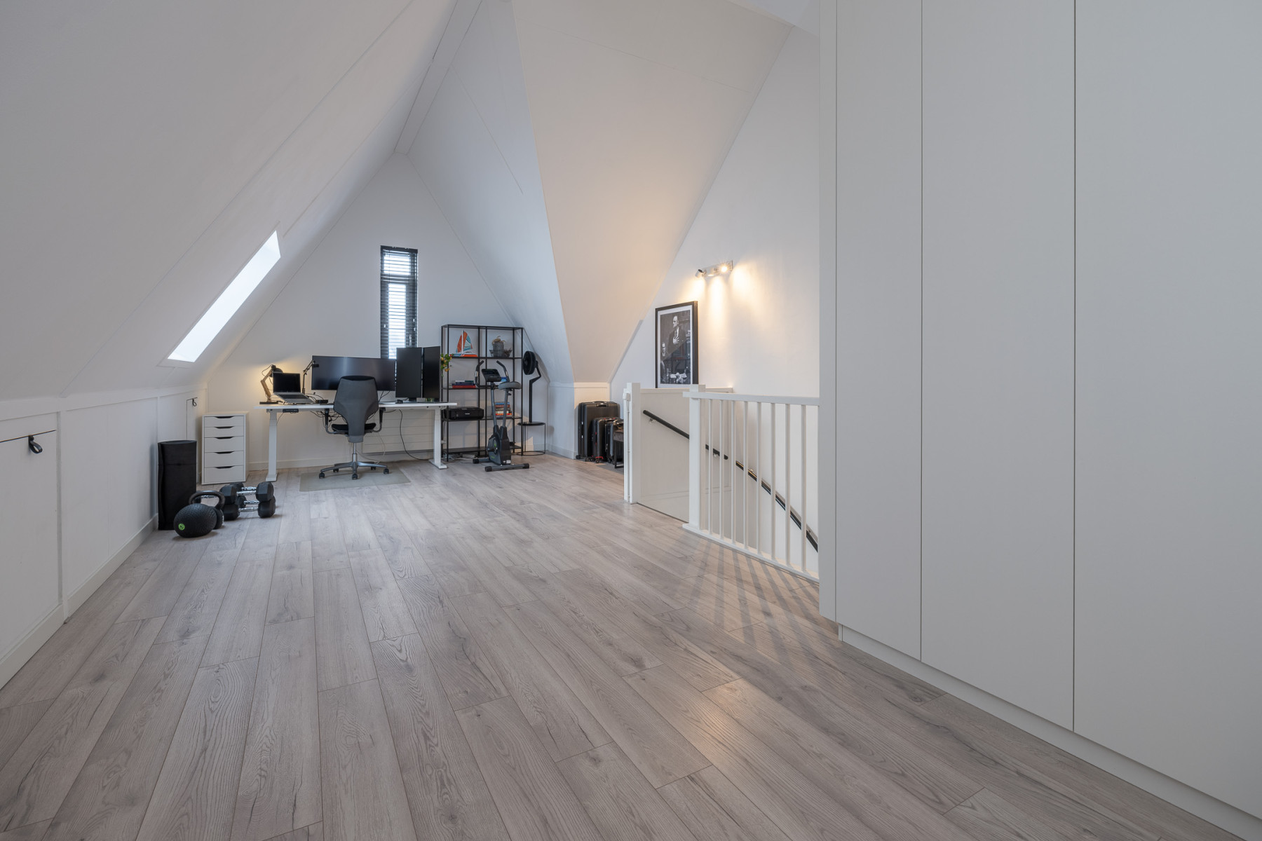 De tweede verdieping bestaat uit een royale ruimte die veel mogelijkheden biedt om het naar eigen wens in te richten. Deze ruimte beschikt over knieschotten en een praktische inbouwkast met de witgoedaansluiting. Ook staan in deze kast de opstelling van de cv-ketel en het WTW-systeem netjes uit het zicht geplaatst.