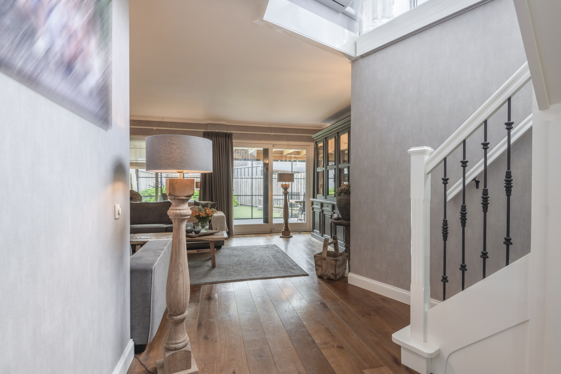 De glazen schuifpui aan de achterzijde zorgt voor een mooie verbinding met buiten. Vanuit hier loopt u direct door naar de overkapping in de achtertuin. Ideaal om zowel in de zomer als in het voor- en najaar van het buitenleven te genieten.
