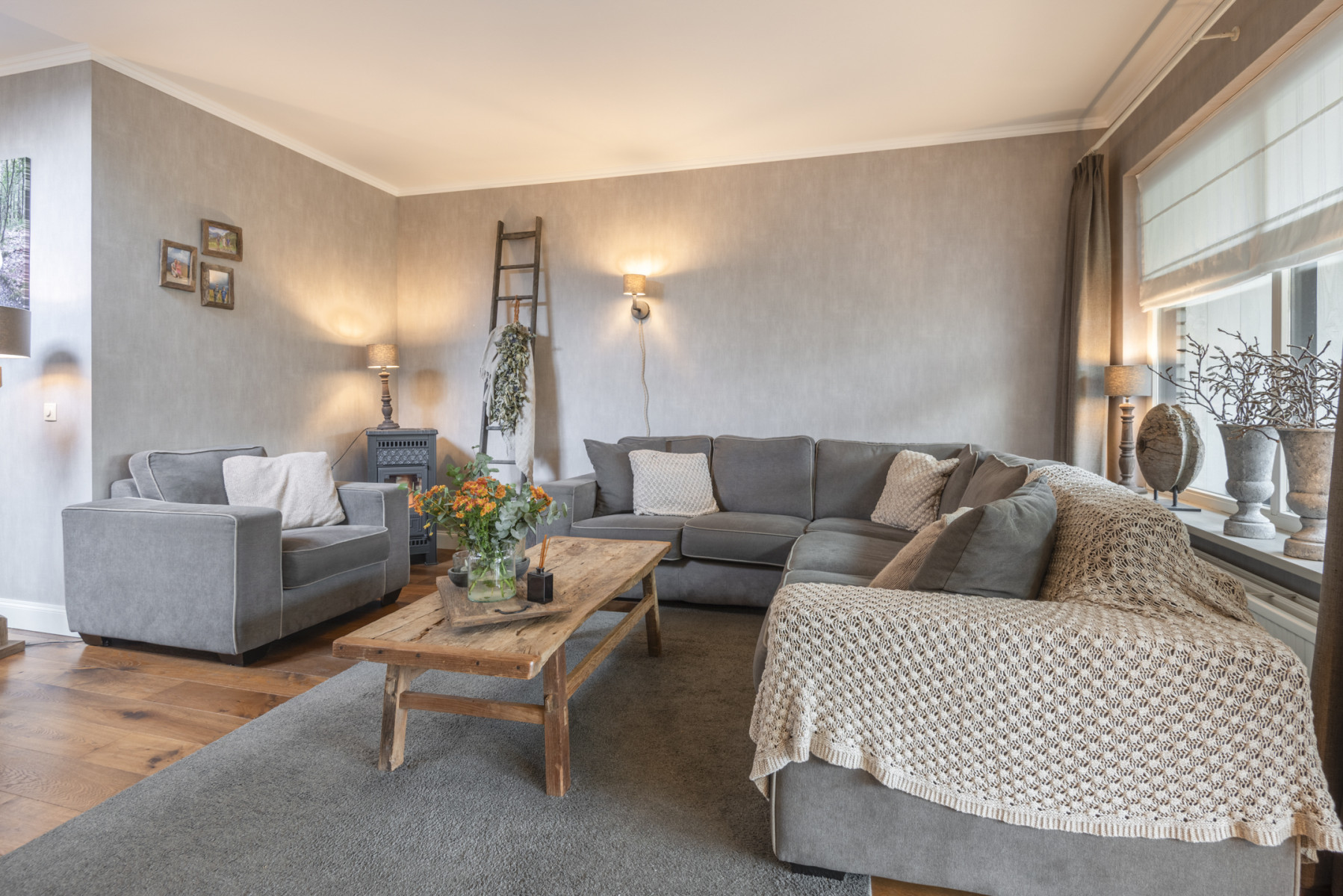 De woonkamer heeft een warme en verzorgde uitstraling. De eiken parketvloer geeft het geheel een stijlvolle basis, terwijl het gestucte plafond, net als de rest van deze verdieping zorgt voor een nette afwerking. Centraal in de woonkamer bevindt zich een pelletkachel, die niet alleen warmte biedt, maar ook voor een gezellige sfeer zorgt tijdens de koudere maanden.