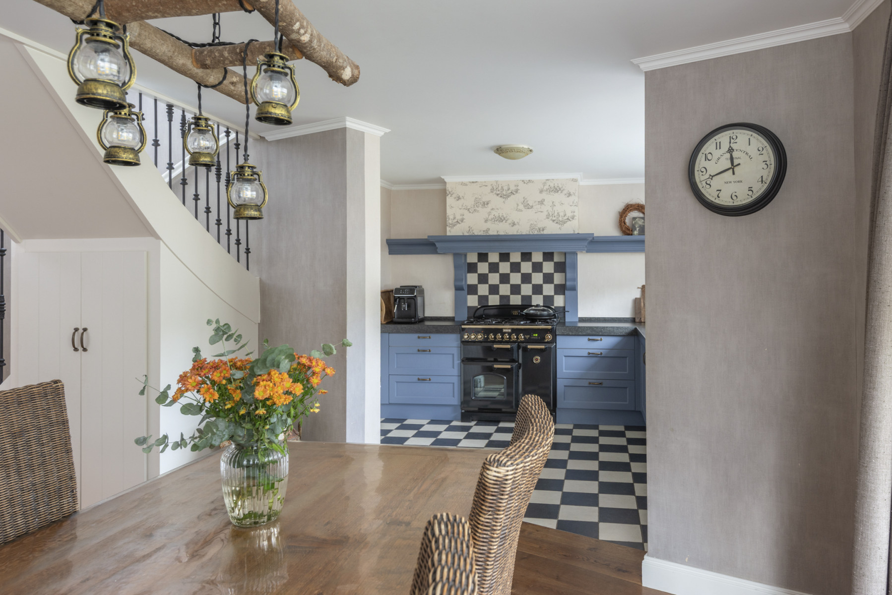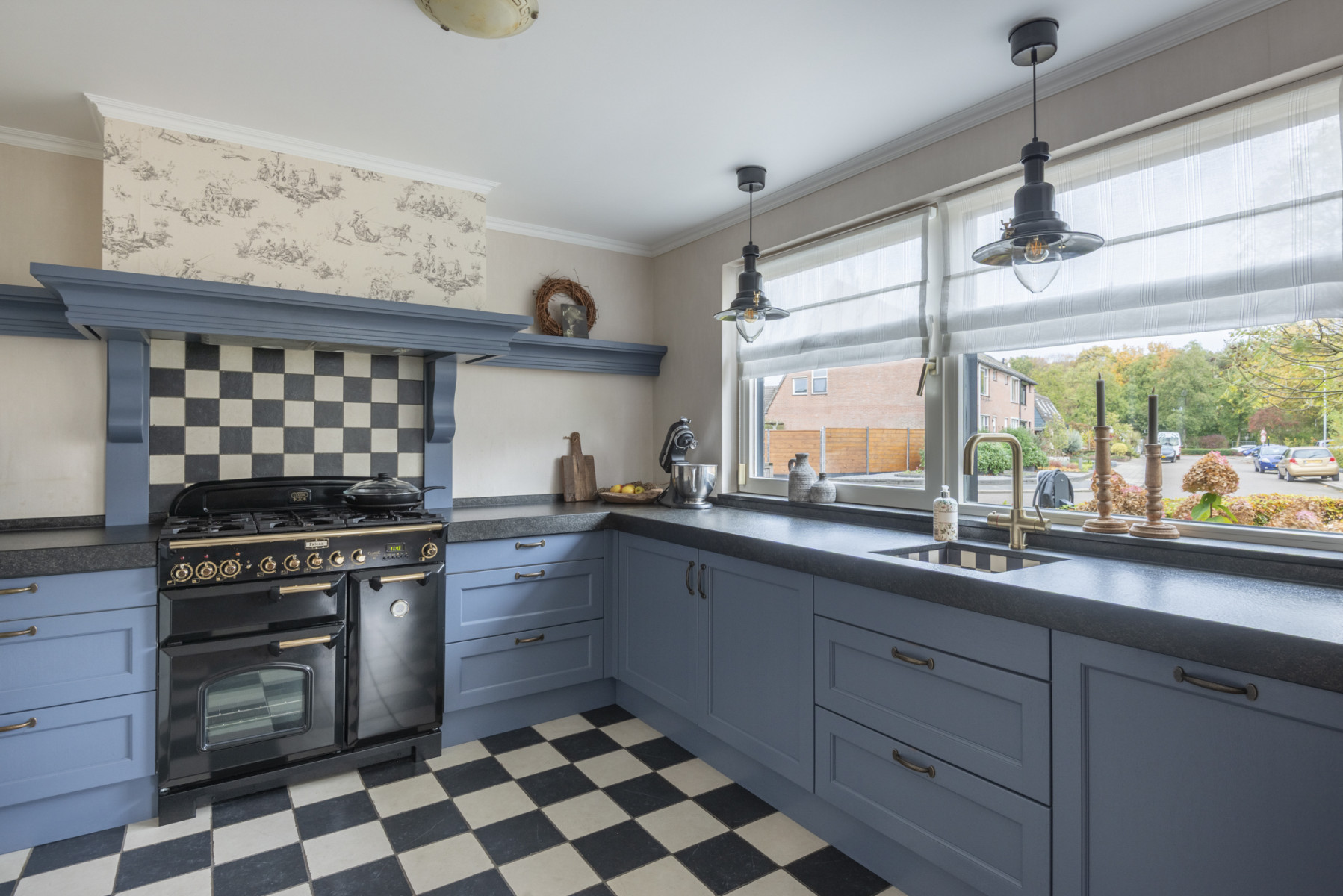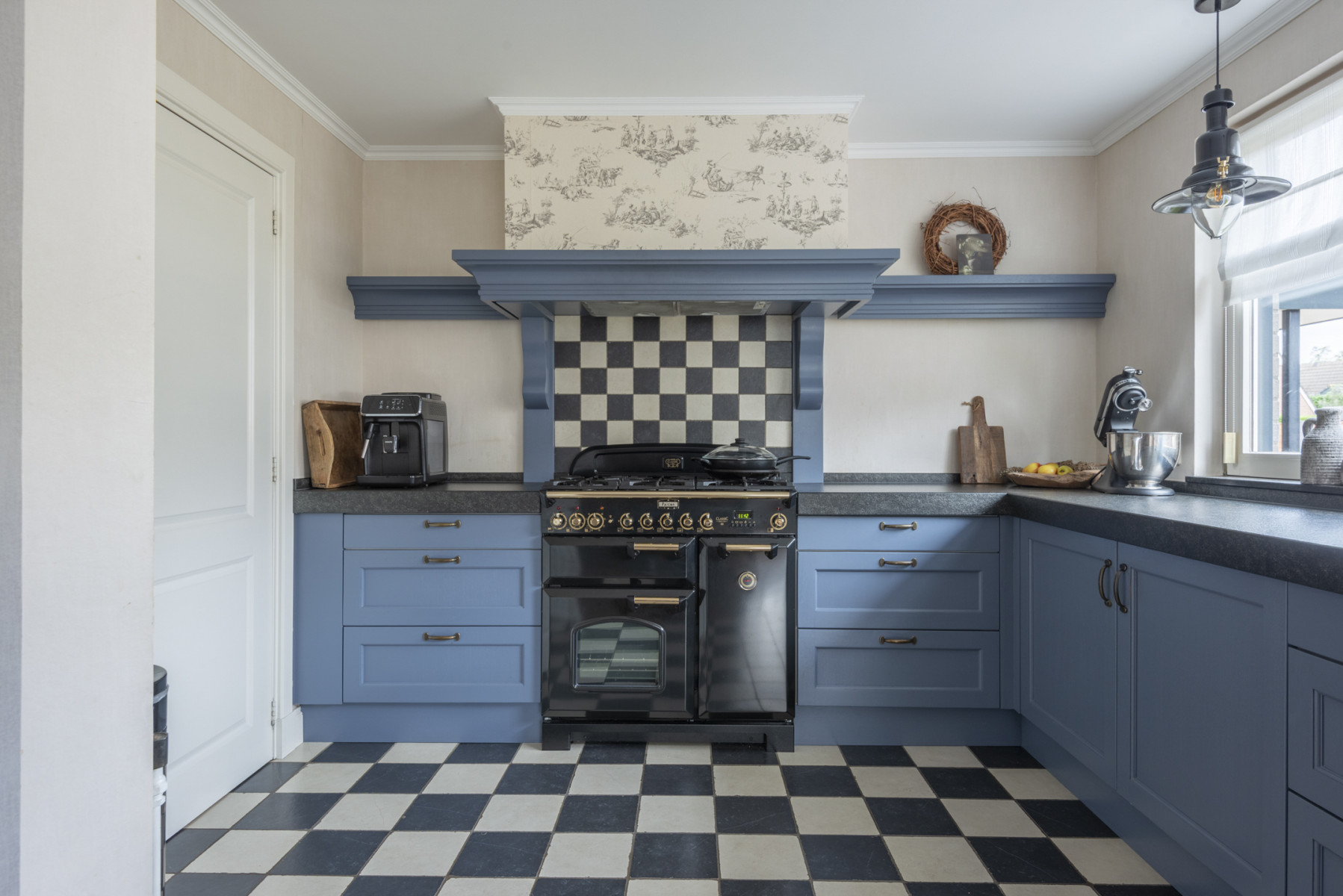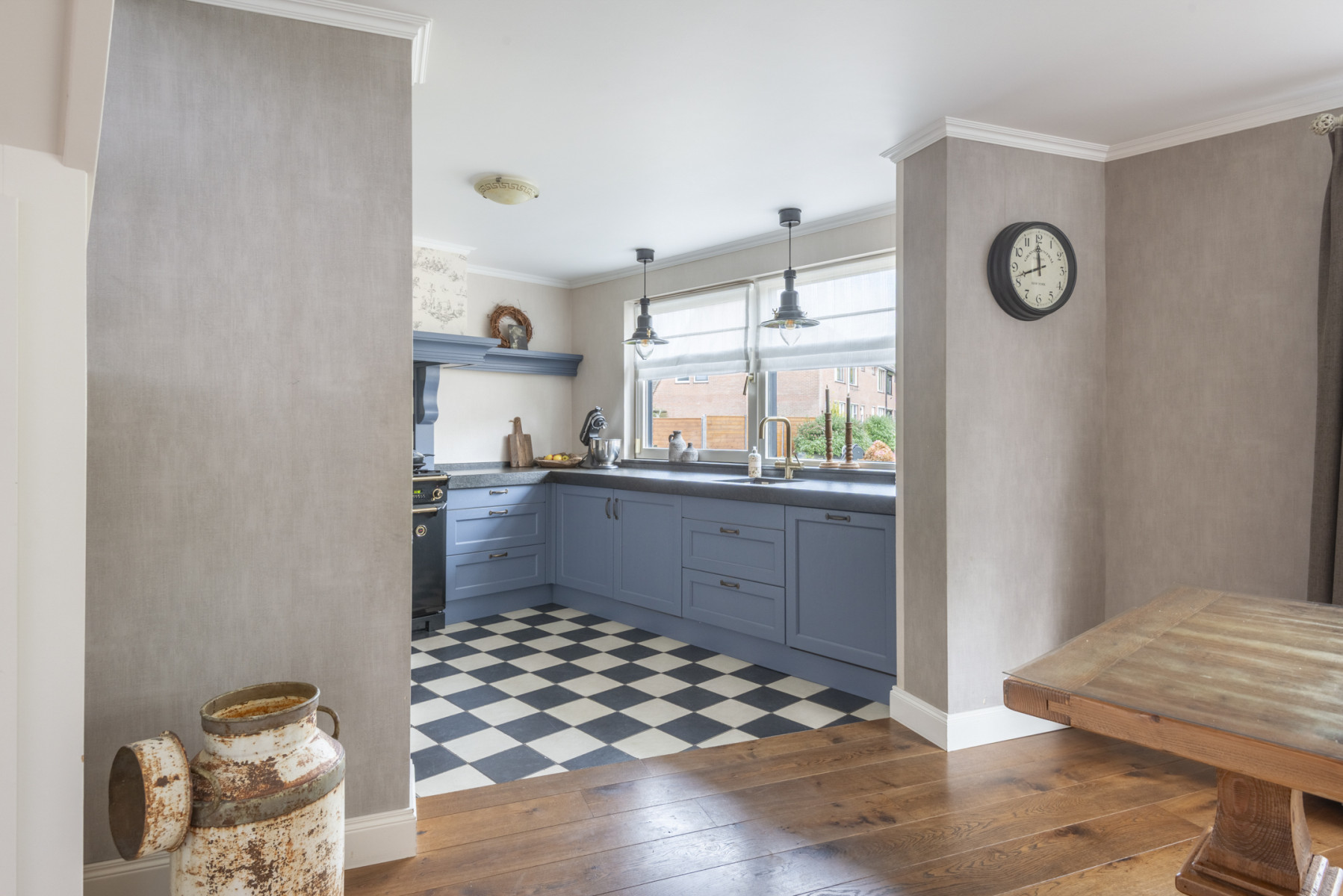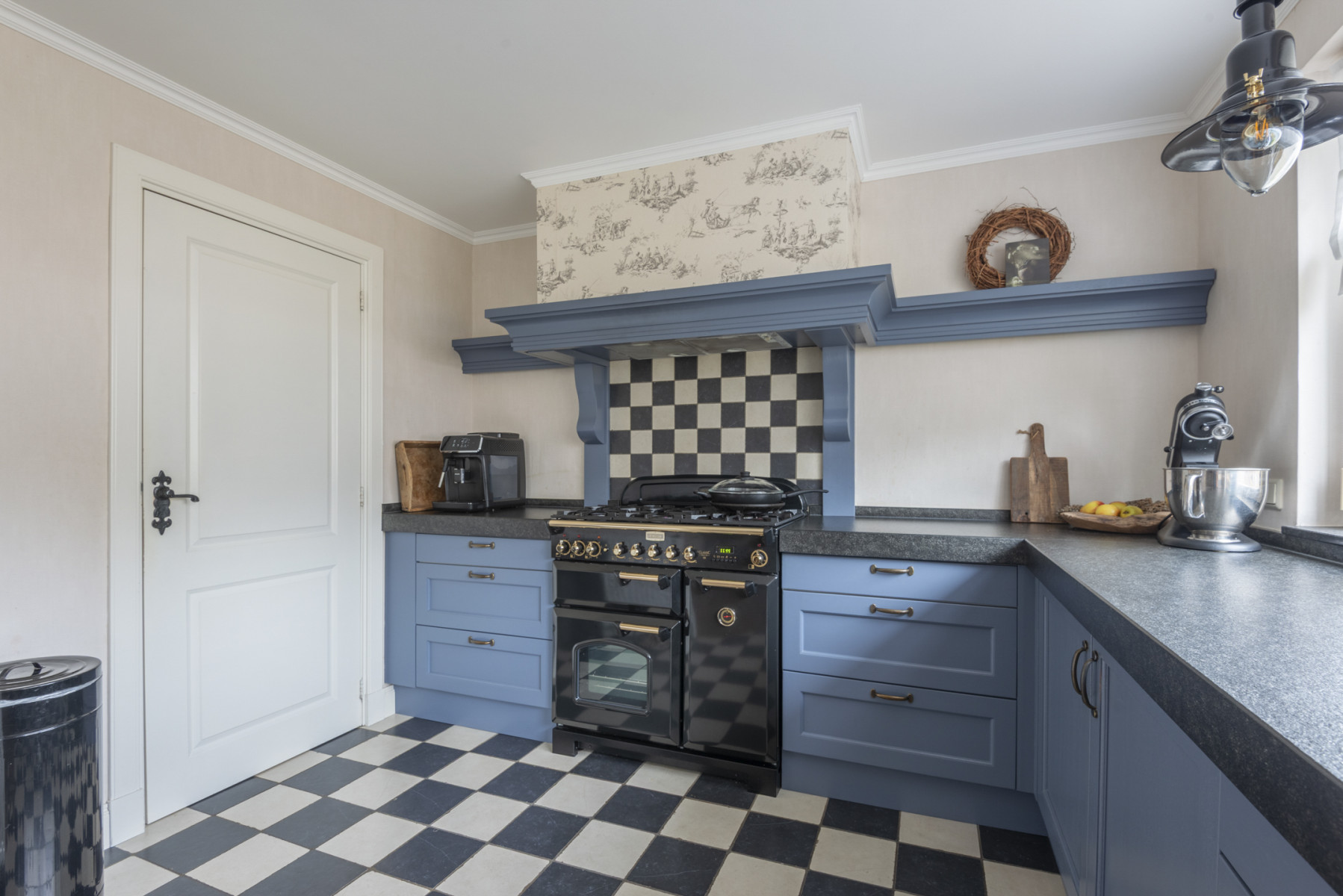 De keuken is aan de voorzijde van de woning gelegen en heeft een nette en verzorgde afwerking. Het is geheel is praktisch ingedeeld en voorzien van een Falcon fornuis met vijf pitten, met daarboven een afzuigkap. Daarnaast beschikt de keuken over een vaatwasser, een koelkast, een kokendwaterkraan en maar liefst twee ovens en een grill, ideaal voor de kookliefhebber.
