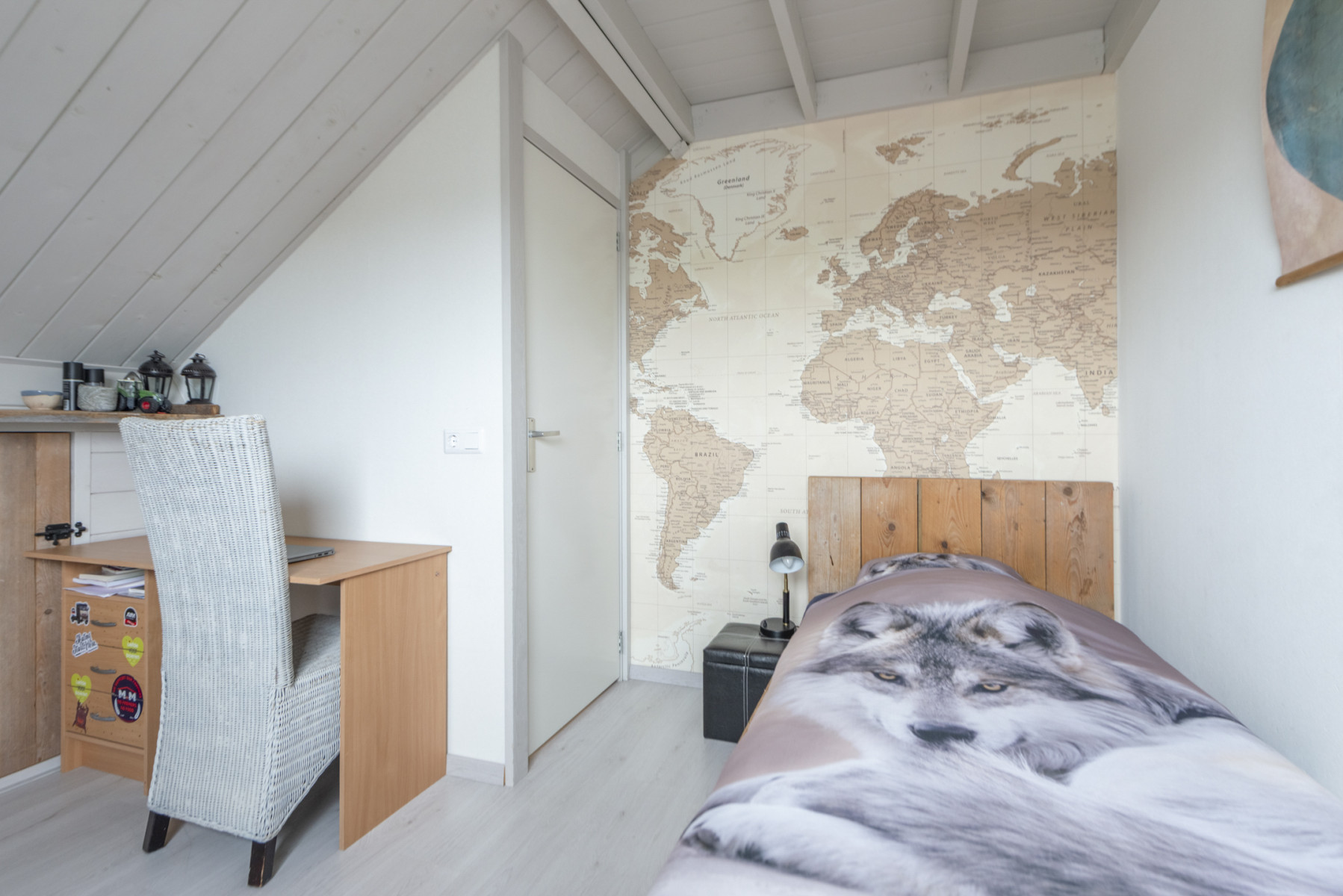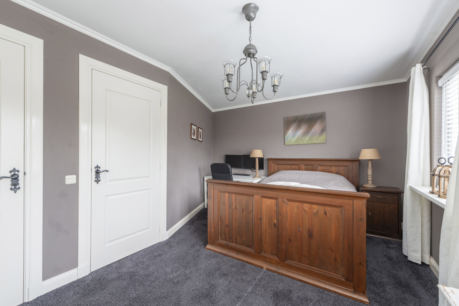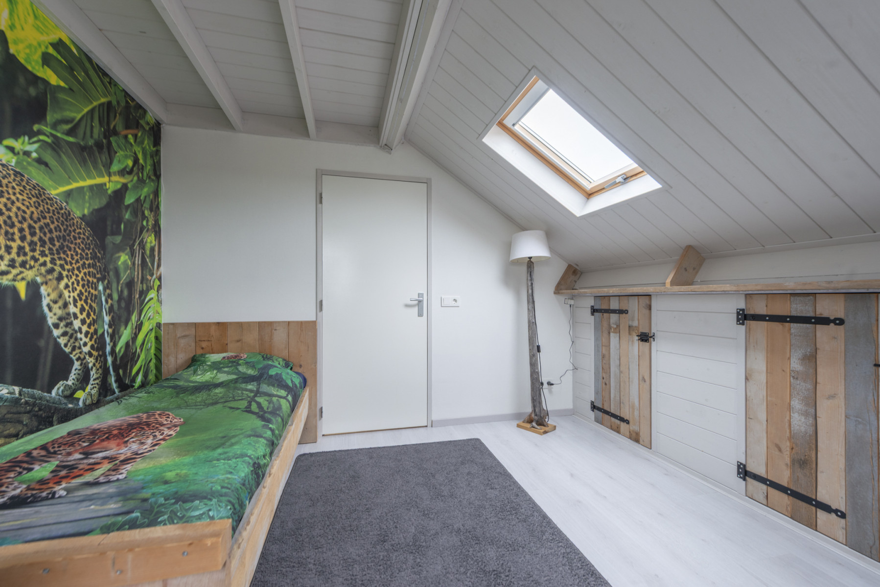 De tweede verdieping biedt aan de voorzijde een ruime slaapkamer, met knieschotten en een dakraam dat zorgt voor een fijne lichtinval. Het karakteristieke balkenplafond zorgt voor een sfeervolle en gezellige uitstraling in de kamer. Aan de achterzijde bevindt zich een tweede keurig afgewerkte slaapkamer met knieschotten en een handmatig rolluik.
