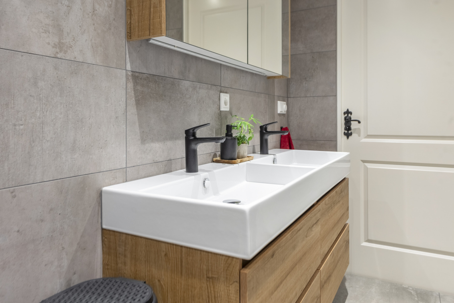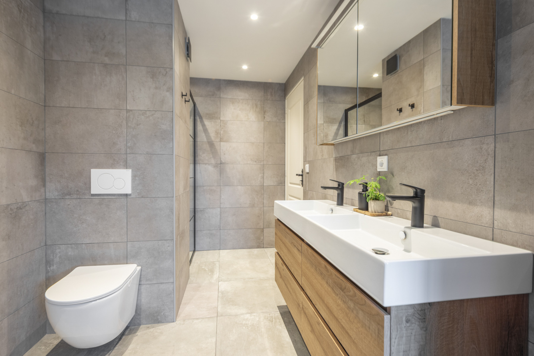 Toilet, dubbele wastafel, wastafelmeubel, inloopdouche en vloerverwarming