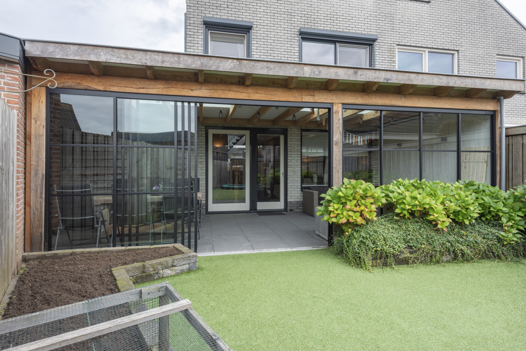 Via de glazenschuifpui in de woonkamer bereikt u de overkapping met een glazen wand. De sfeervolle ruimte is dankzij de lichtkoepel heerlijk licht en biedt mogelijkheid om het hele jaar door van het buitenleven te genieten. De tuin is verzorgd aangelegd met diverse beplanting en kunstgras, wat zorgt voor een onderhoudsvriendelijke uitstraling.