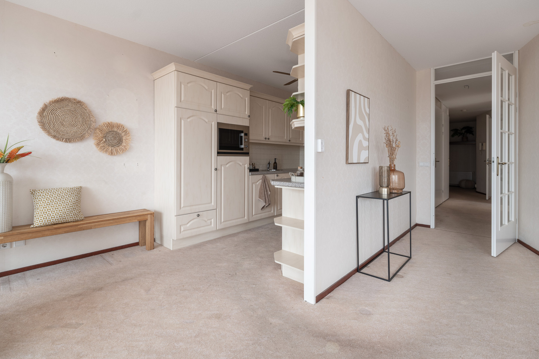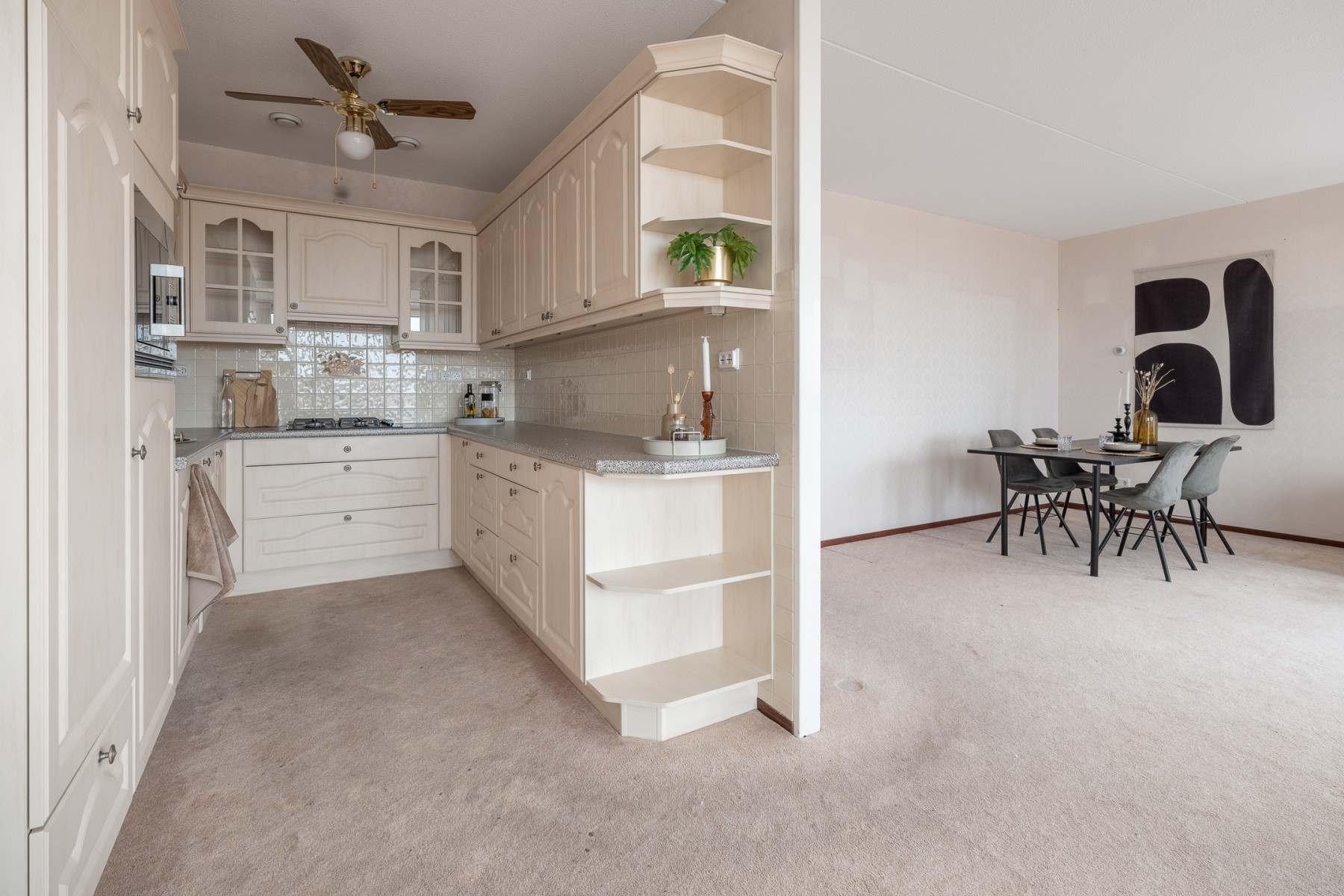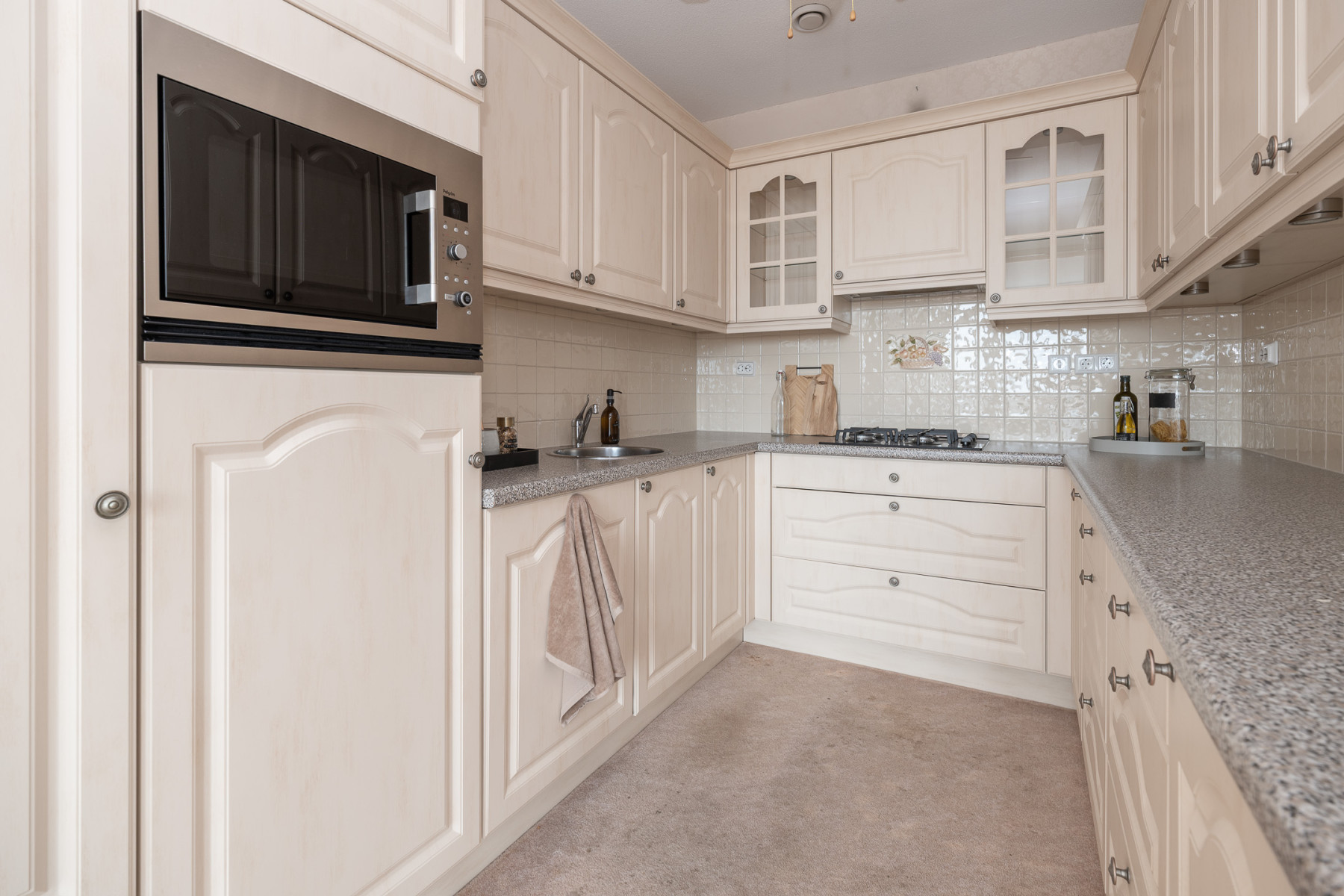 De halfopen keuken is praktisch ingedeeld en beschikt over veel opbergruimte. Daarnaast bevindt zich hier een koelkast met vriesvak, een 4-pits gaskookplaat met daarboven een keurig weggewerkte afzuigkap, een vaatwasser en een combimagnetron. Dankzij de slimme indeling is het een fijne ruimte om te koken en in contact te blijven met de woonkamer.