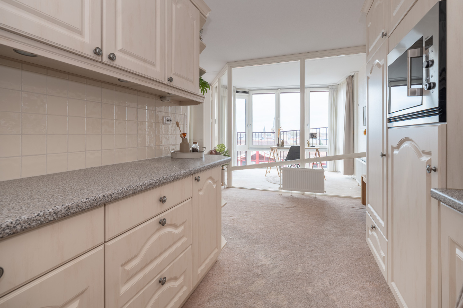 Zodra u de woonkamer betreedt, merkt u meteen de aangename lichtinval door de royale raampartijen. Daarnaast is er in deze ruime woonkamer plaats voor een zithoek en een eethoek. Vanuit de woonkamer heeft u toegang tot de serre. U geniet van het uitzicht op het centrum van Barneveld, daarnaast is het een veelzijdige ruimte die perfect dient als zit- of werkplek en het appartement extra wooncomfort biedt.
