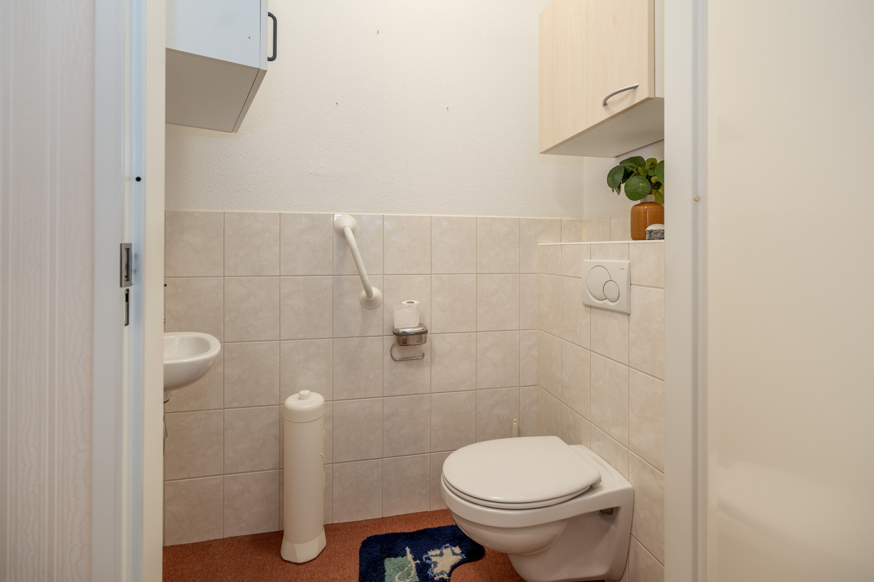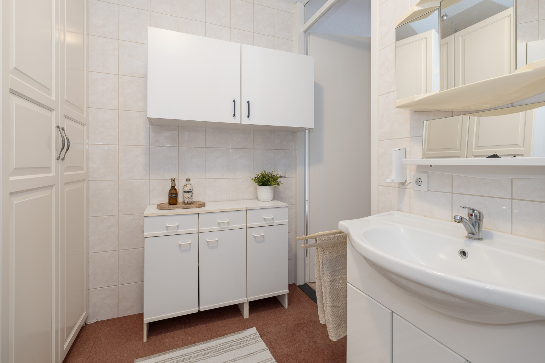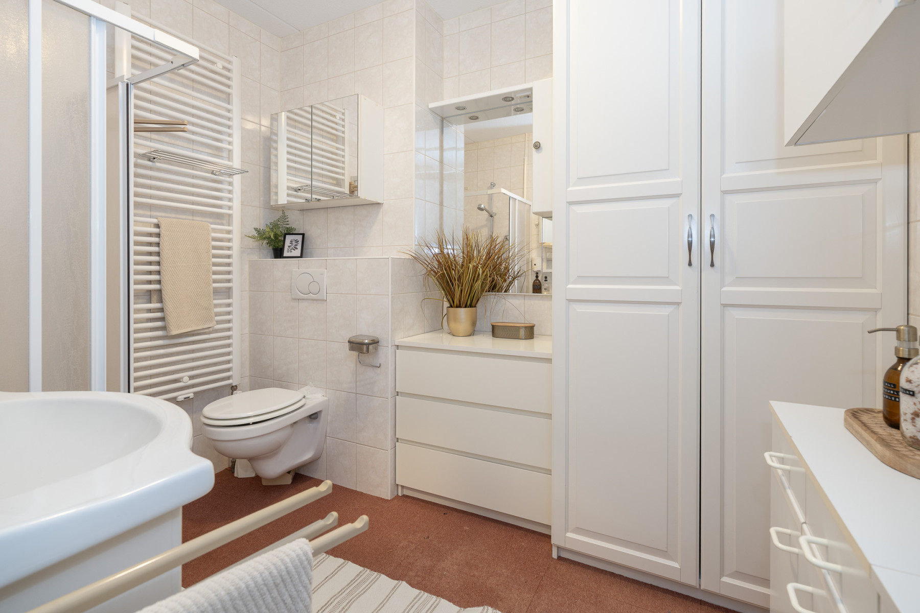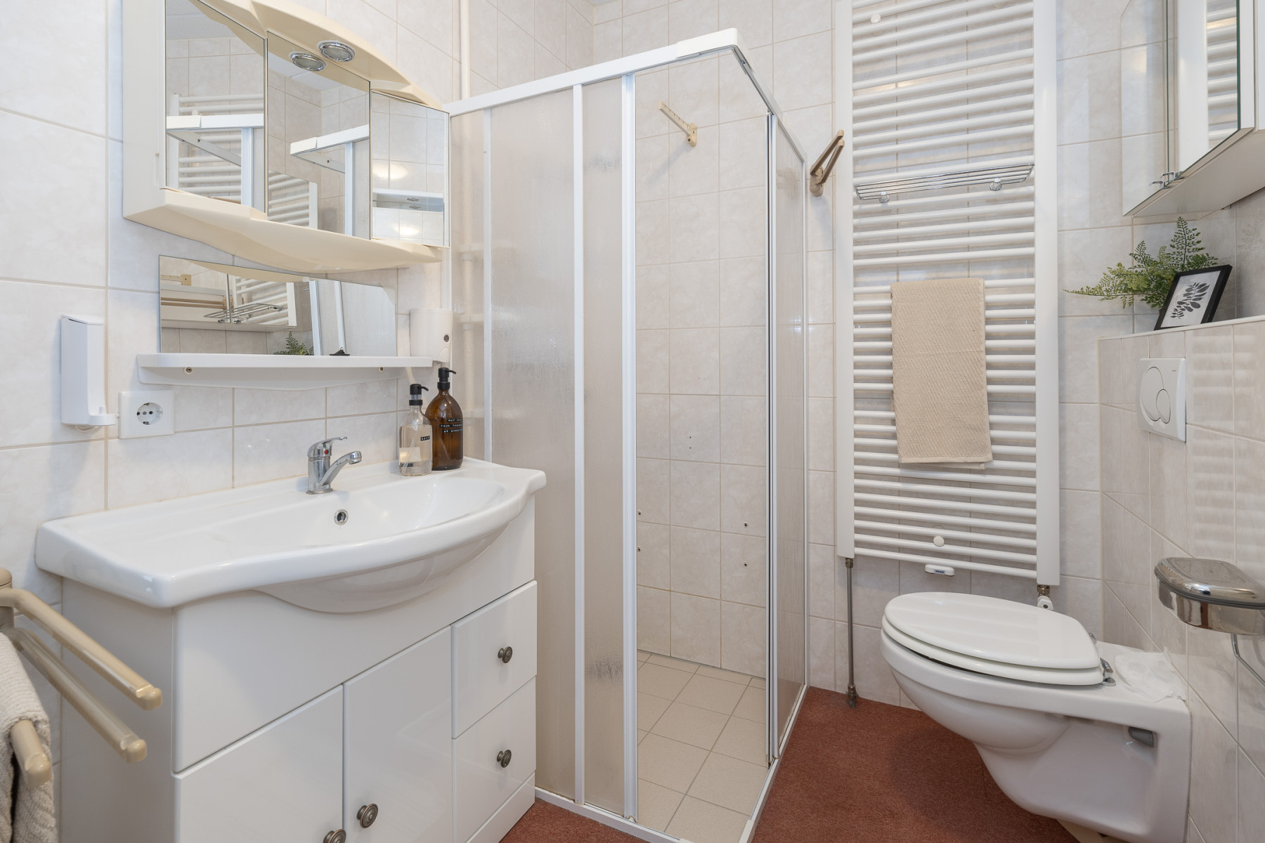 De badkamer is compleet ingericht en van veel gemakken voorzien. Zo beschikt deze over een douchecabine, een wastafelmeubel met een enkele wastafel en een tweede toilet. Daarnaast zorgt de designradiator voor een aangename temperatuur en zijn er vaste opbergkasten aanwezig, waardoor u uw spullen netjes kunt opbergen.
