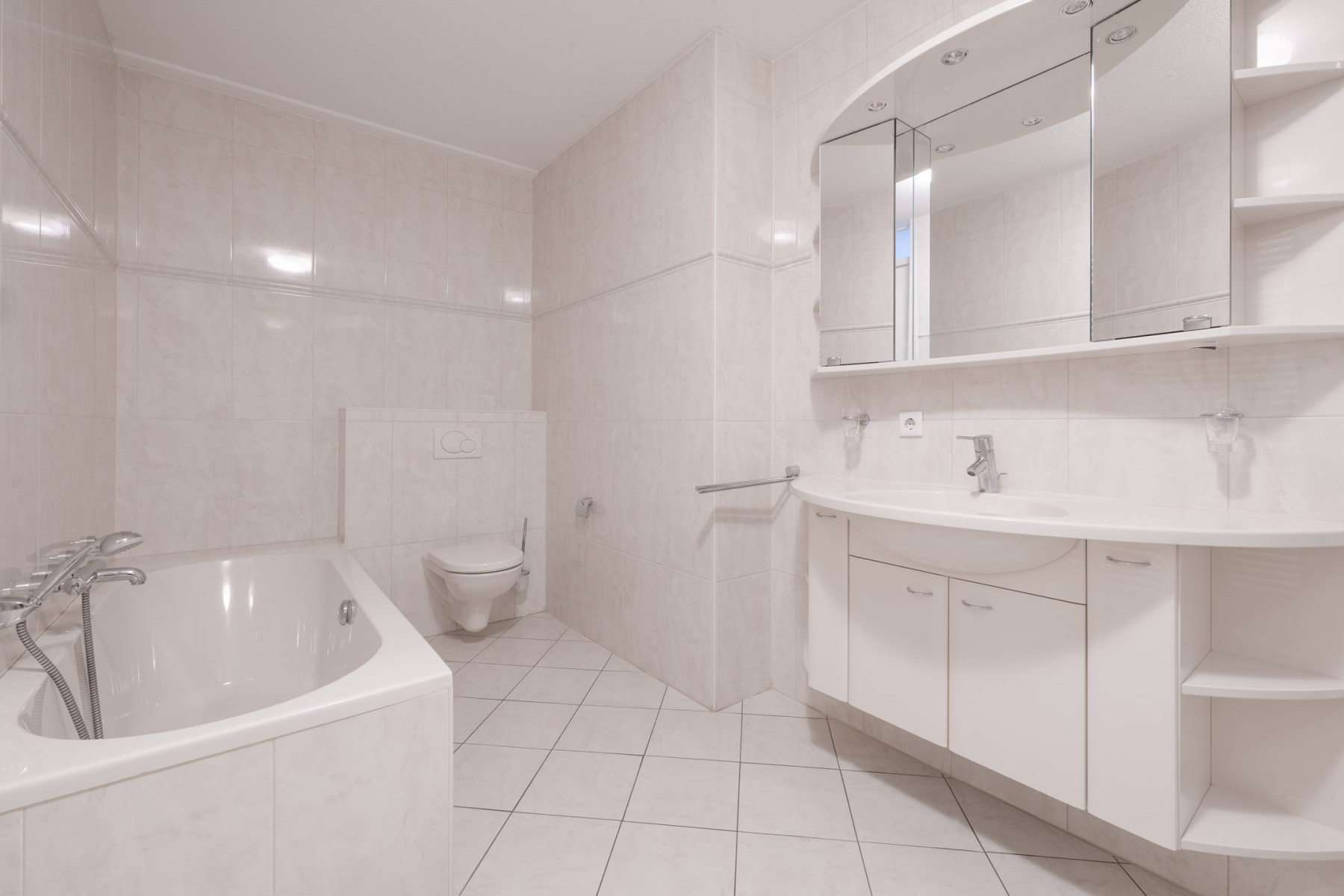 Ligbad, toilet, bidet, wastafel, wastafelmeubel, inloopdouche, vloerverwarming en douche