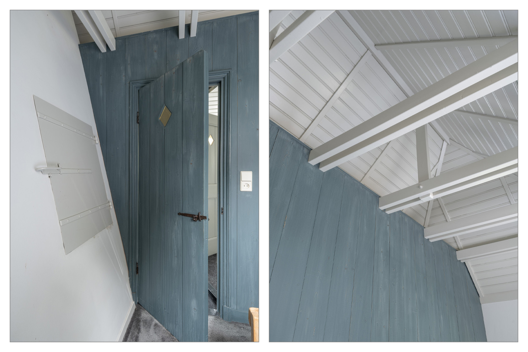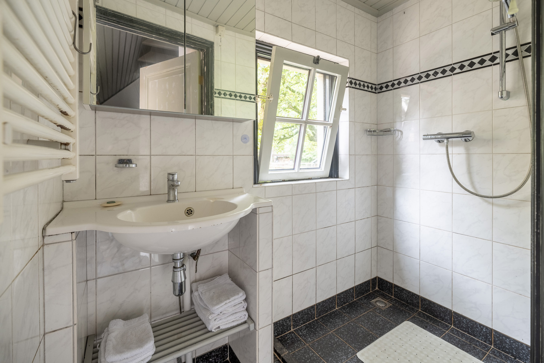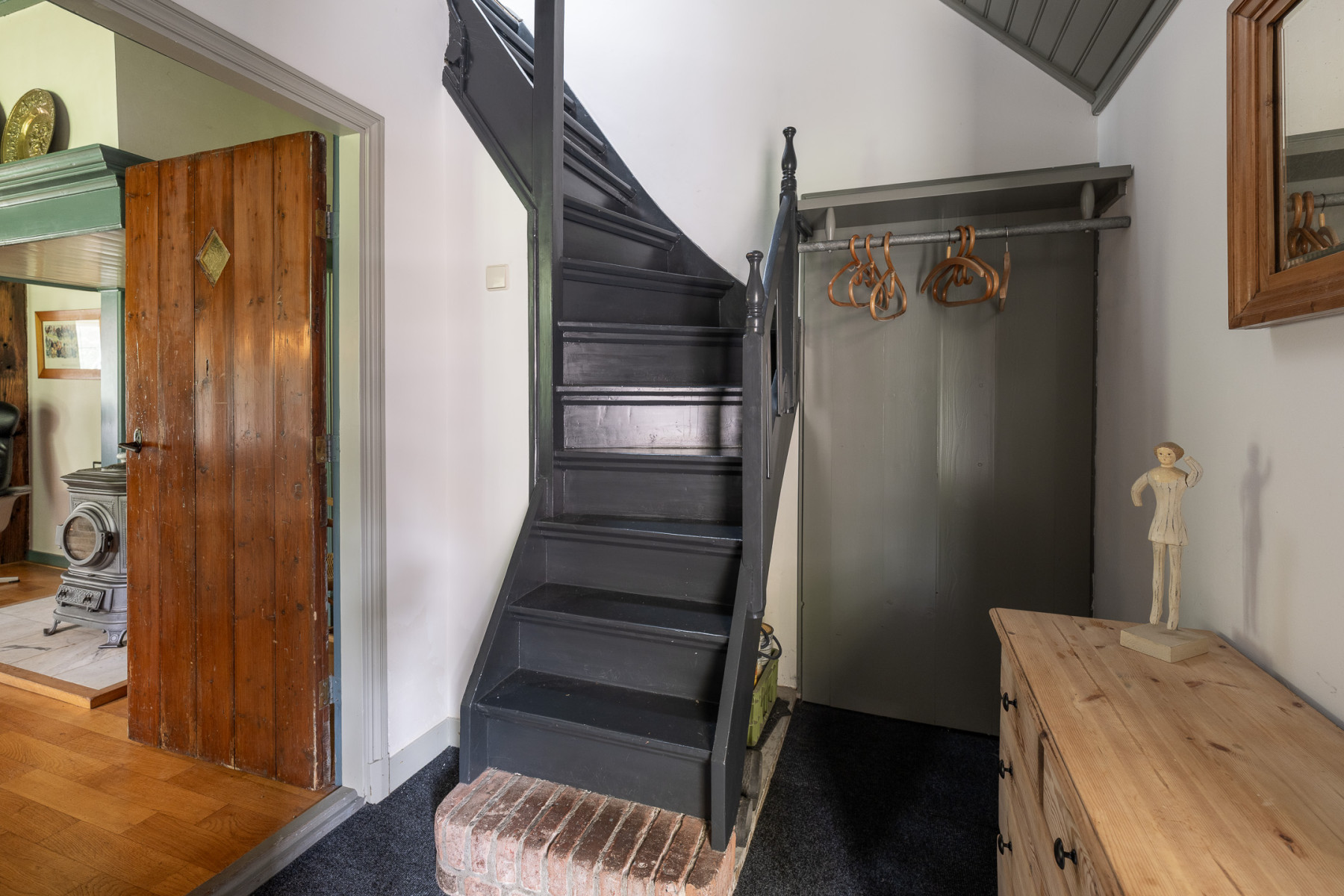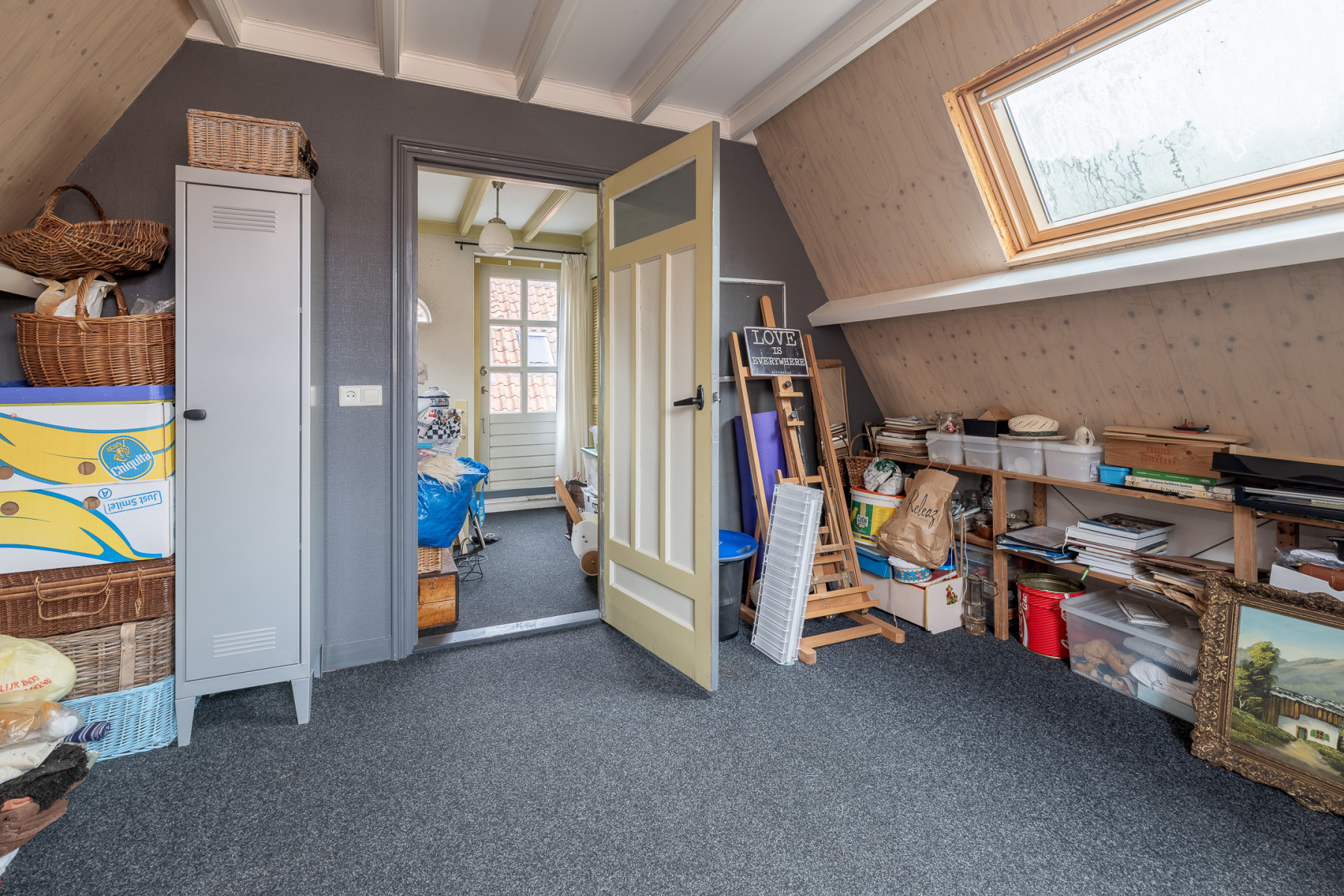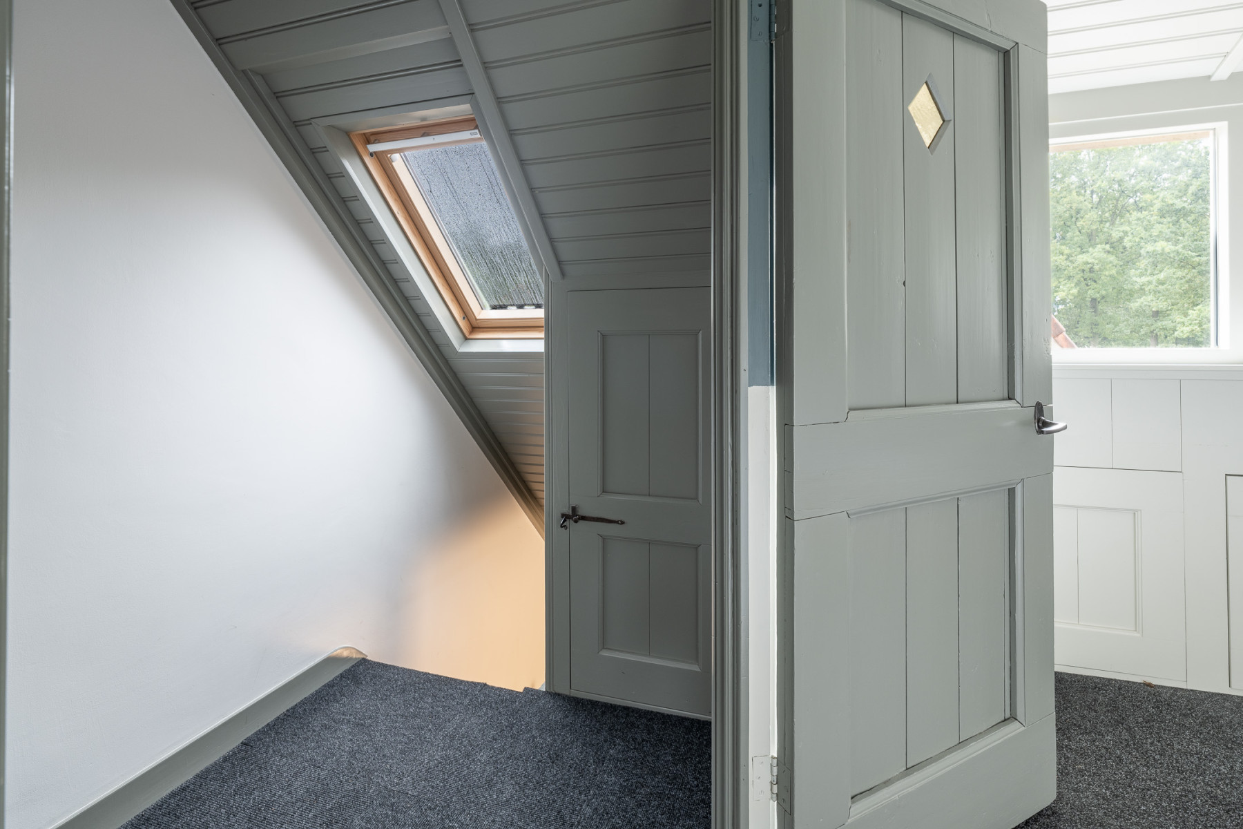 Via een vaste trap bereiken we de eerste verdieping. Op de overloop vinden we een Velux dakraam en een vaste kast. Daarnaast geeft de overloop u toegang tot twee slaapkamers. Ook op deze verdieping komen de karakteristieke kenmerken terug zoals het balkenplafond, erg sfeervol. Eén kamer is voorzien van een dakkapel en bergruimte achter knieschot. Op de andere slaapkamer beschikt u over een vaste kast, 2 Velux dakramen en bergruimte achter knieschot.