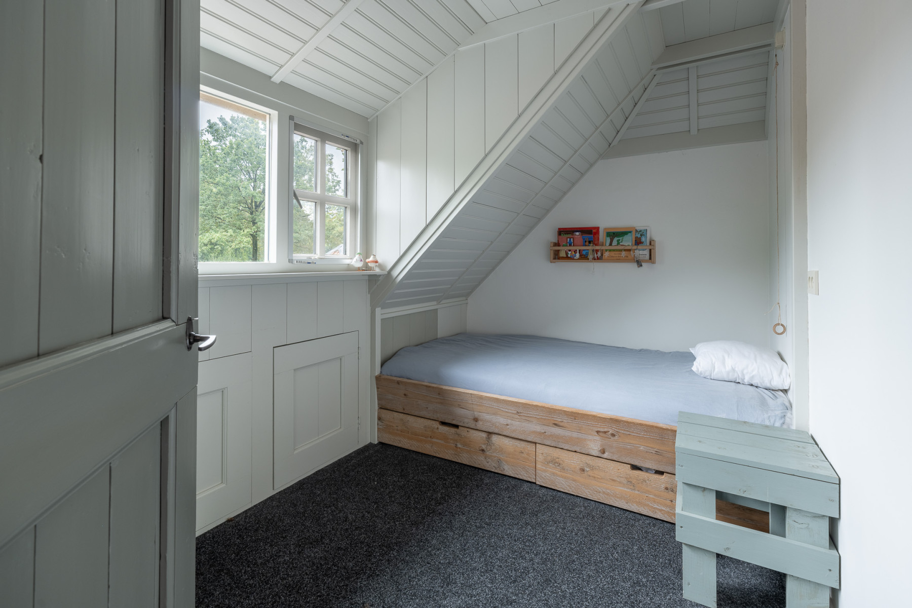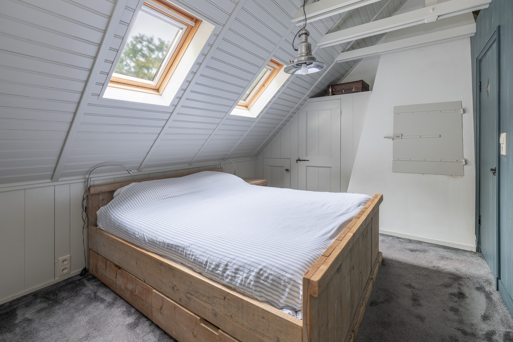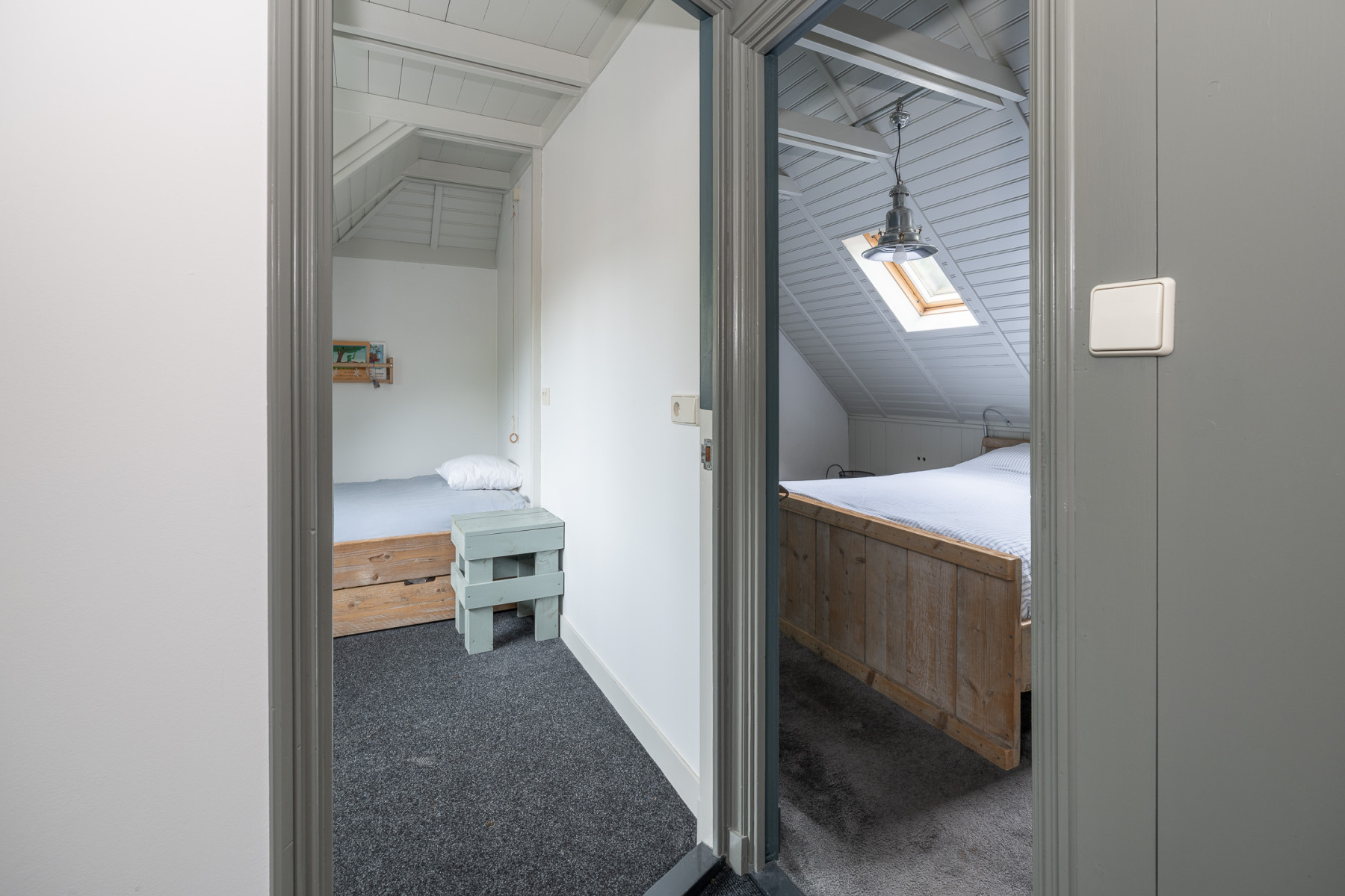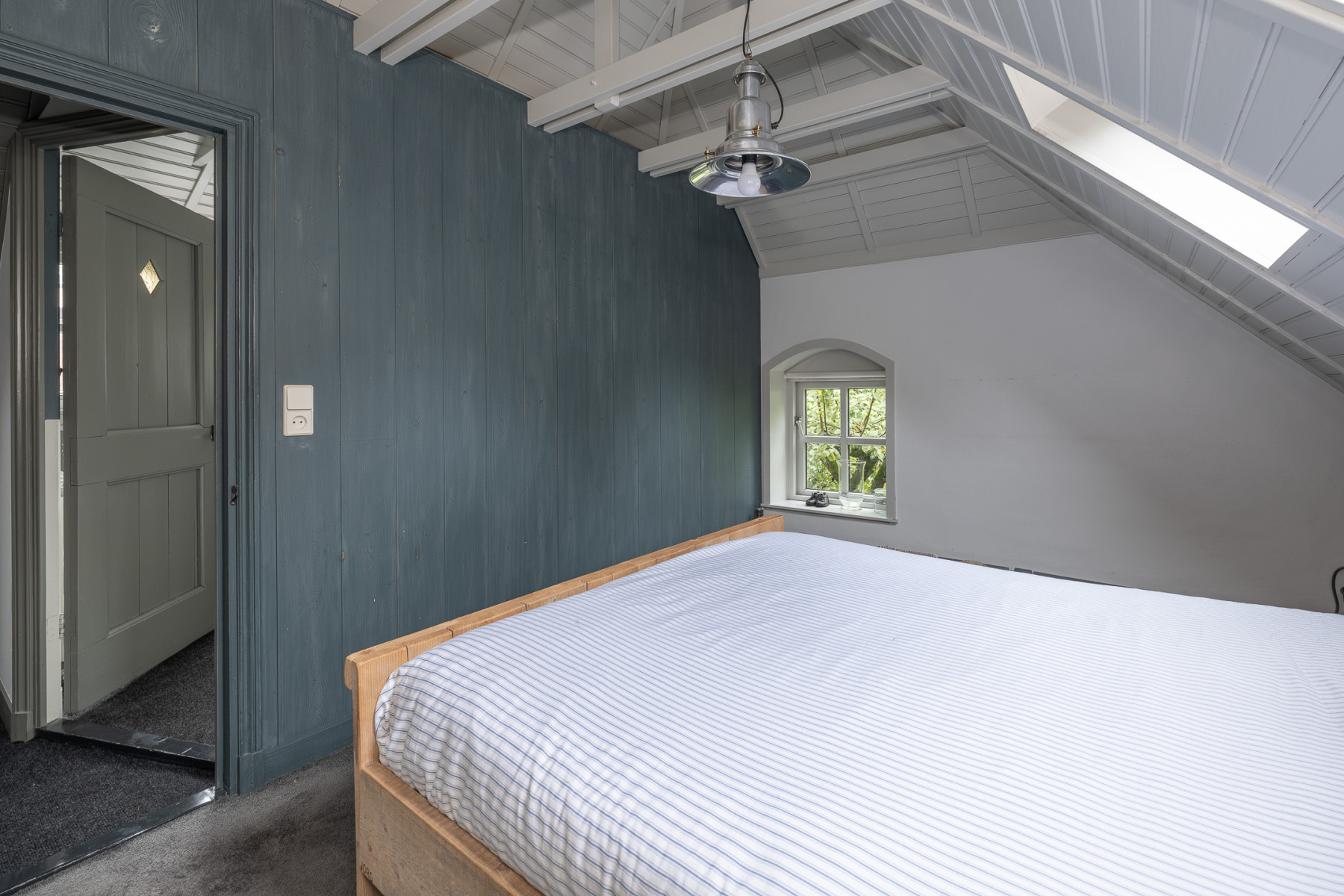 Vanuit de bijkeuken bereiken we tevens een verdieping. De overloop met een vaste kastenwand en een Velux dakraam brengt u bij een royale slaapkamer. De slaapkamer heeft een uitstekende maatvoering en is voorzien van een Velux dakraam en een raam met een handmatig bedienbaar rolluik. Verder krijgt u vanuit de overloop toegang tot het platte dak.