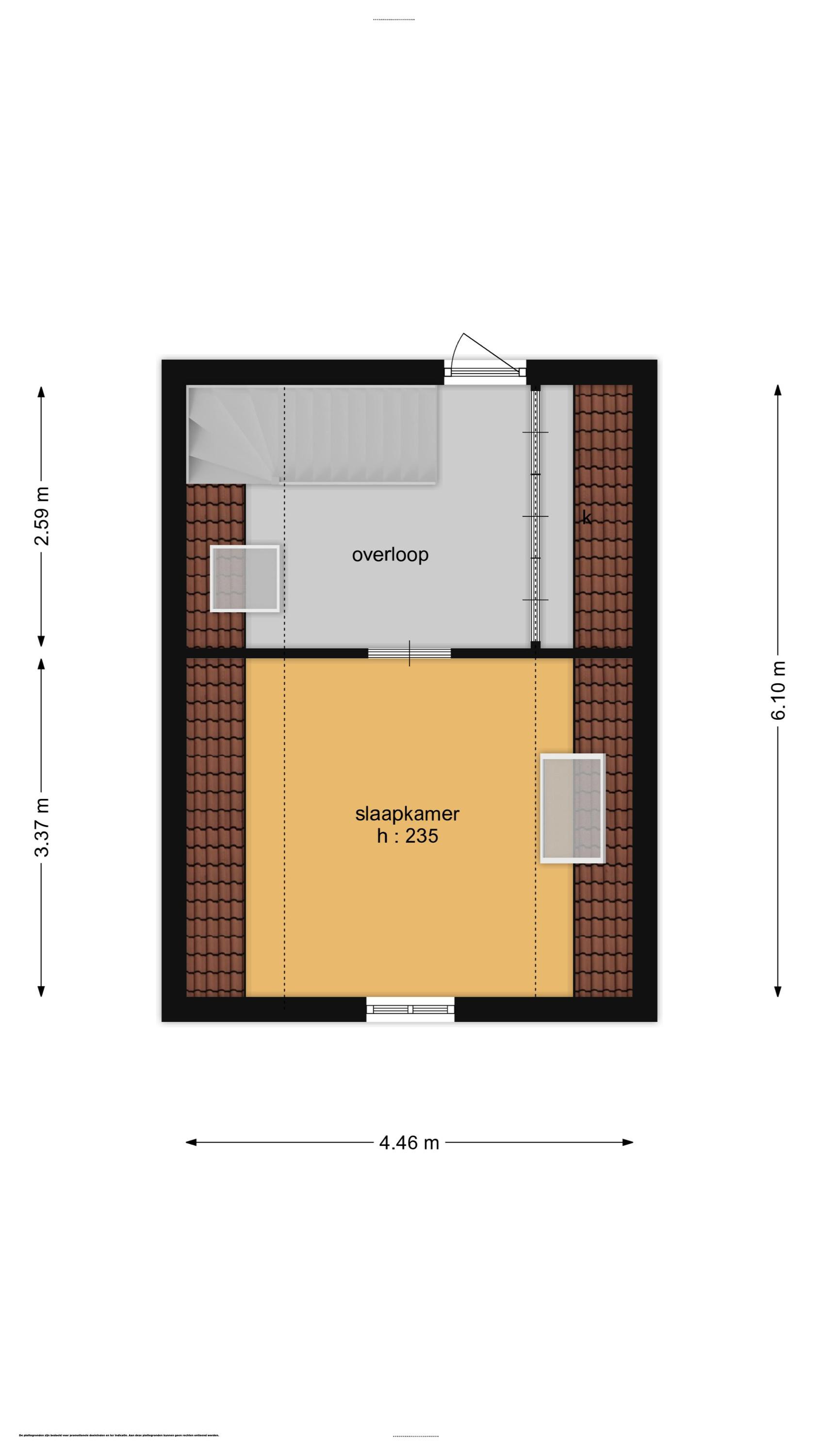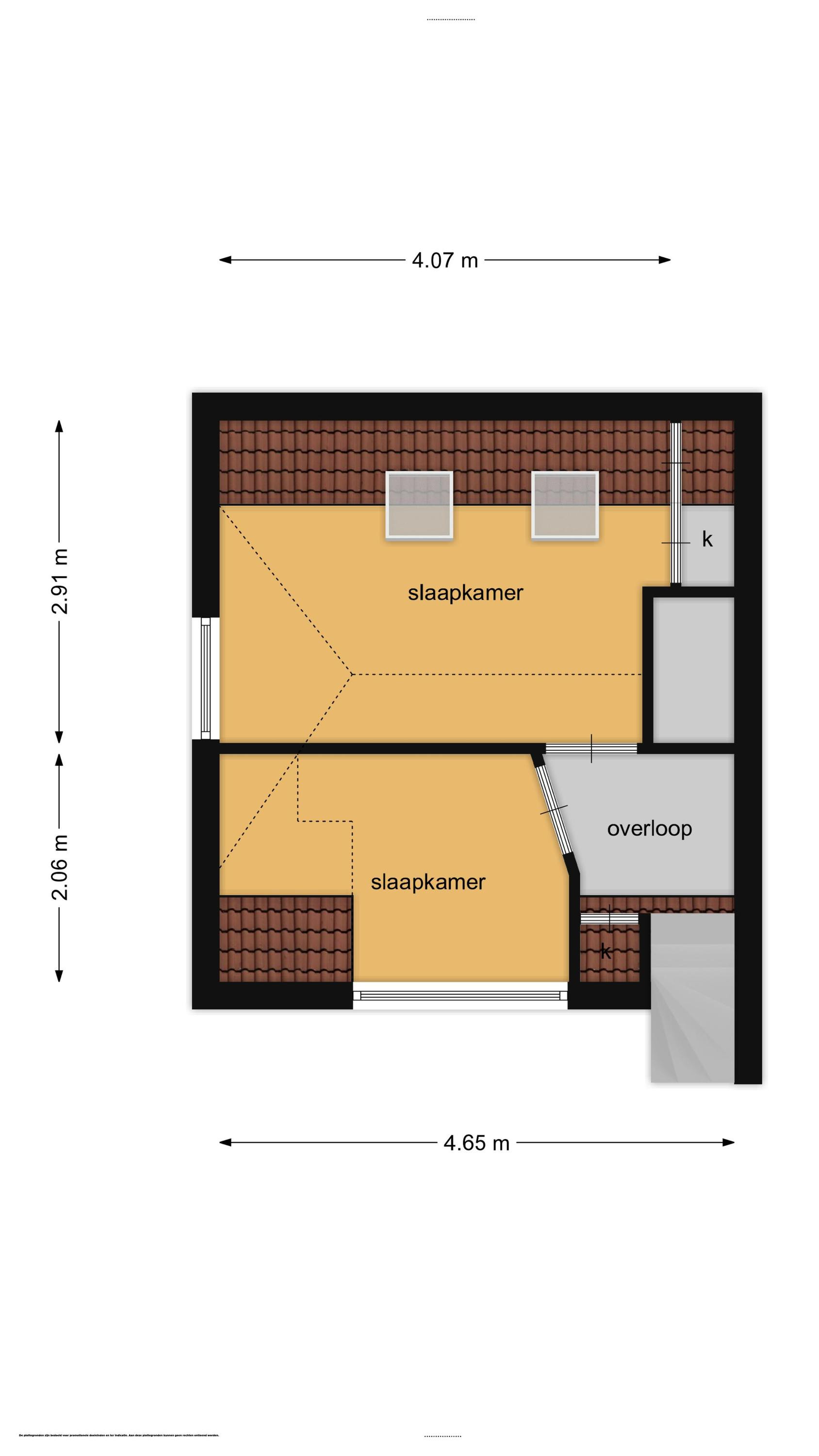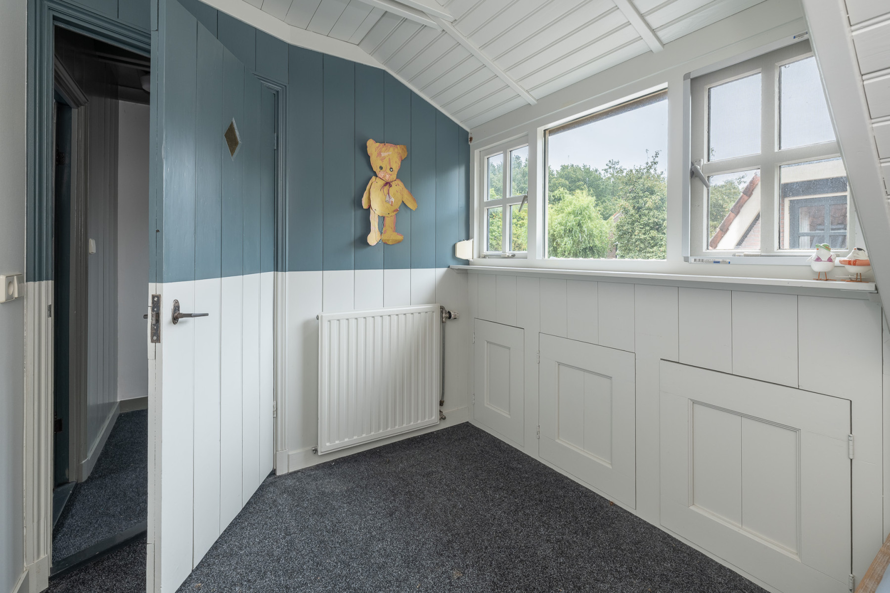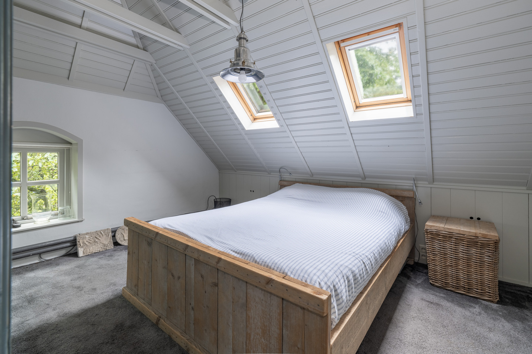 Vanuit de bijkeuken bereiken we tevens een verdieping. De overloop met een vaste kastenwand en een Velux dakraam brengt u bij een royale slaapkamer. De slaapkamer heeft een uitstekende maatvoering en is voorzien van een Velux dakraam en een raam met een handmatig bedienbaar rolluik. Verder krijgt u vanuit de overloop toegang tot het platte dak.