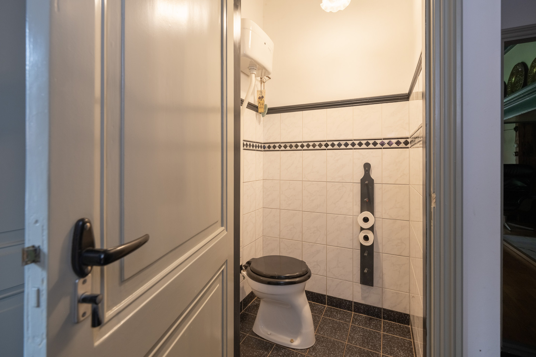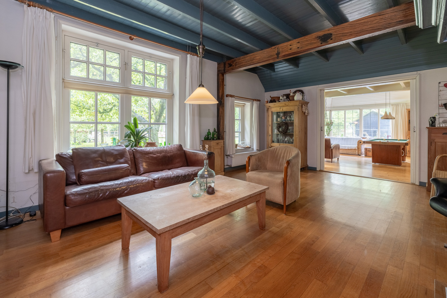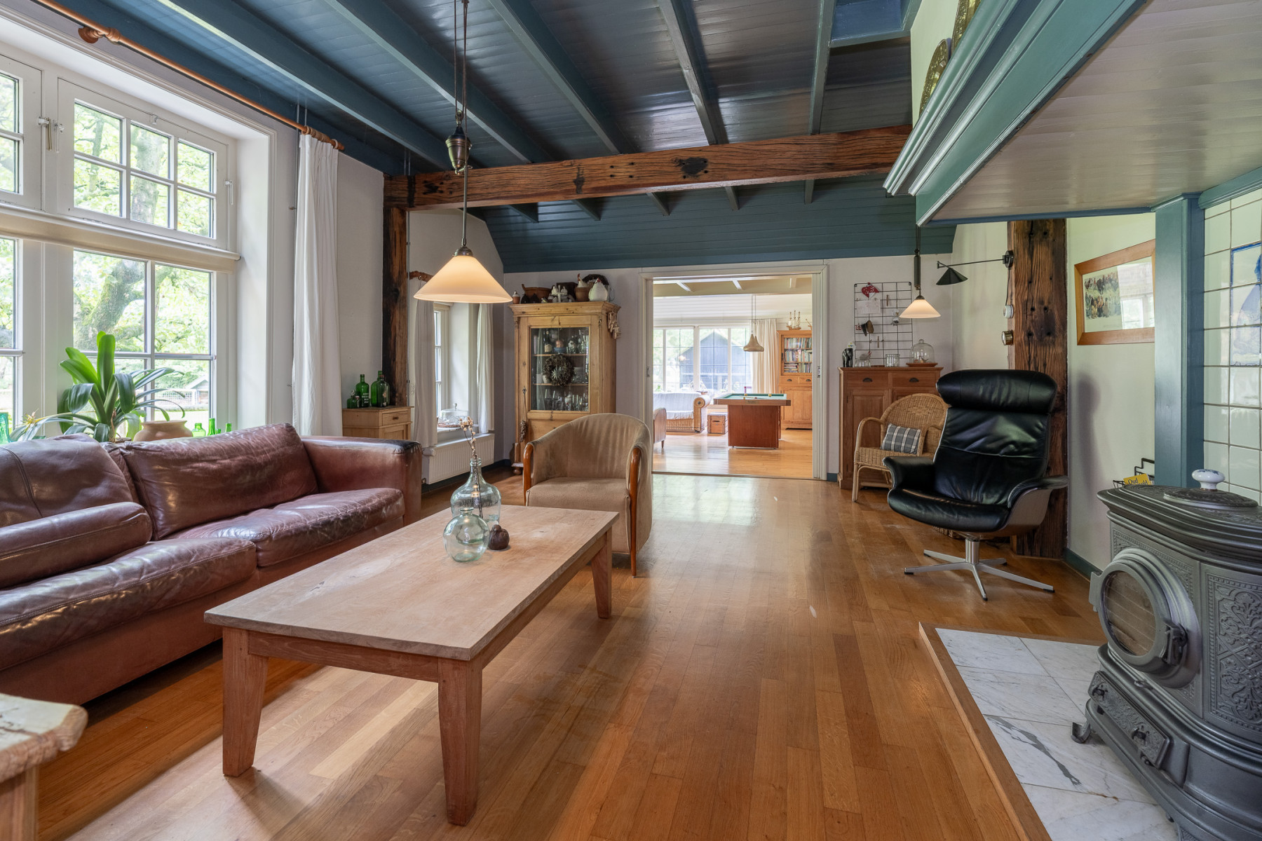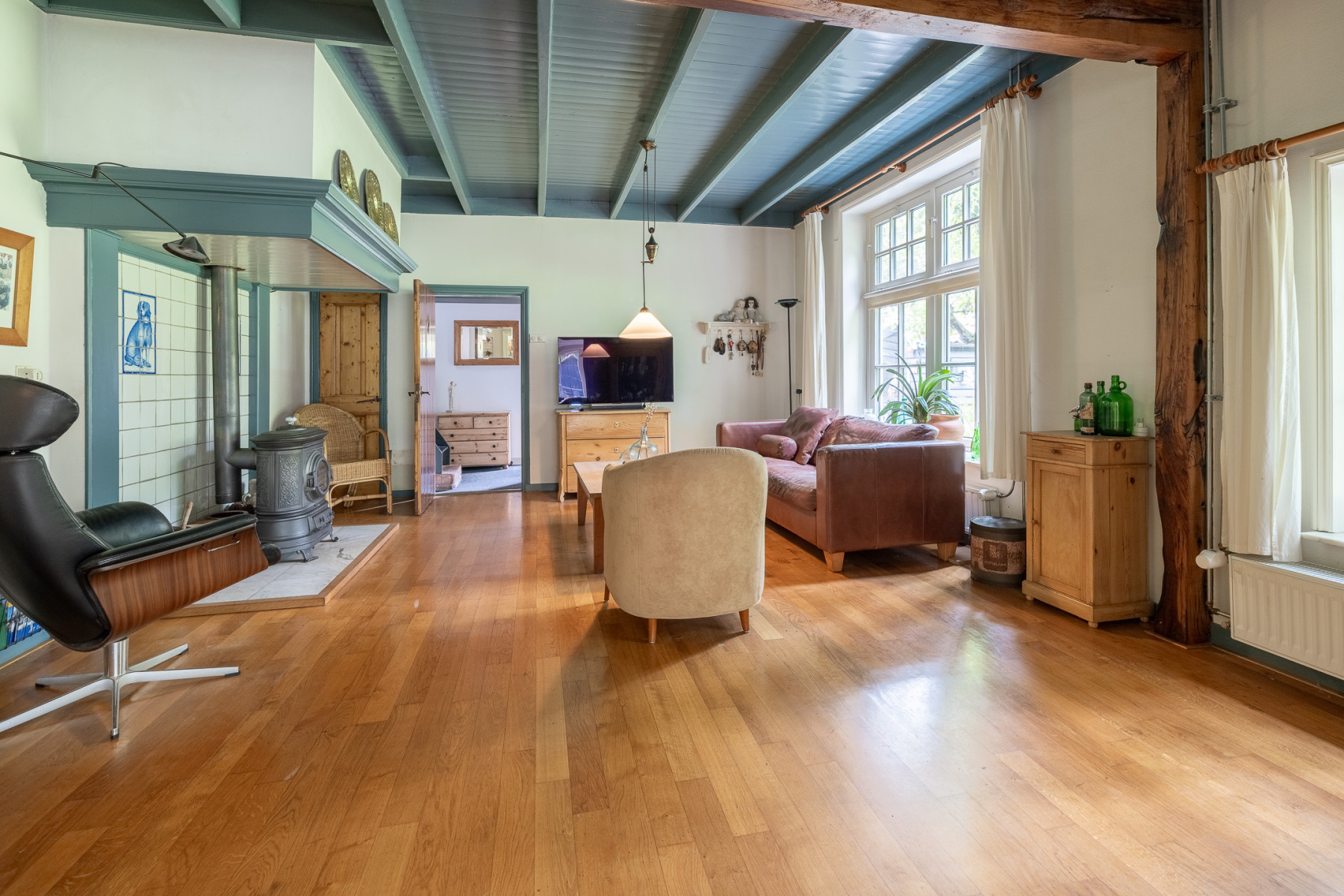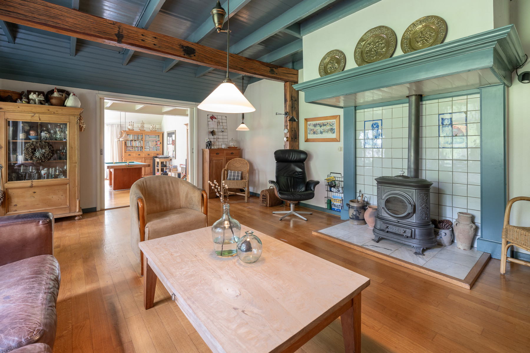 In deze ruime woonkamer komt sfeer en karakter samen. Het eerste wat opvalt zijn de authentieke kenmerken zoals de houten balken en het hoge plafond. De grote ramen zorgen voor veel lichtinval en een mooi uitzicht op het groen in de tuin. Midden in de kamer staat een gezellige houtkachel, afgewerkt met klassieke tegels. Een fijne plek om tijdens koudere dagen te genieten van de warmte en de sfeer. In de kamer is er voldoende ruimte voor het plaatsen van een royale zithoek. De kamer-en-suitedeuren verbinden deze ruimte met de zijkamer.