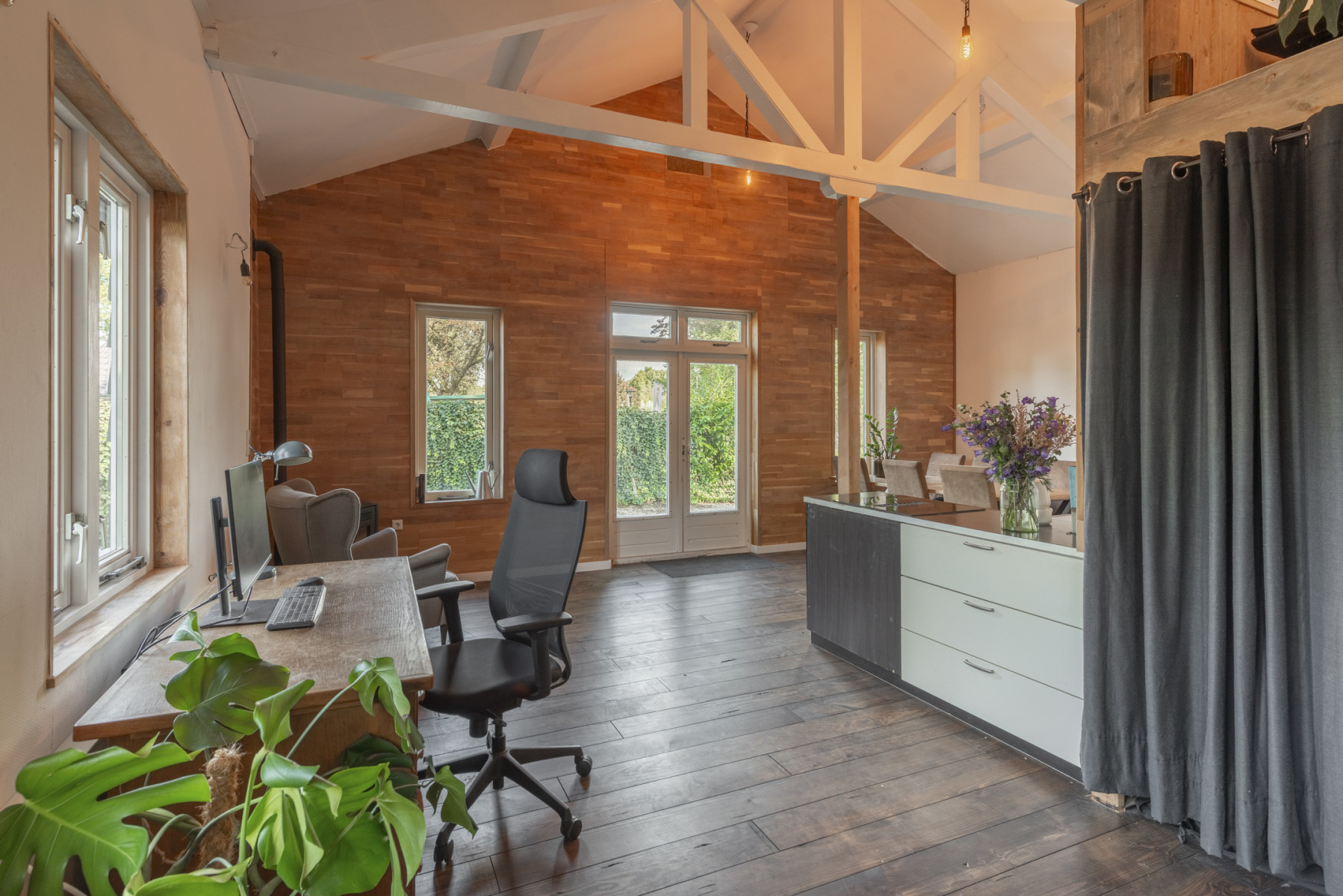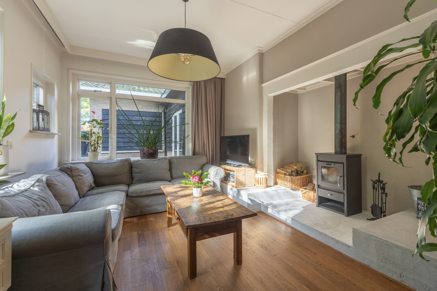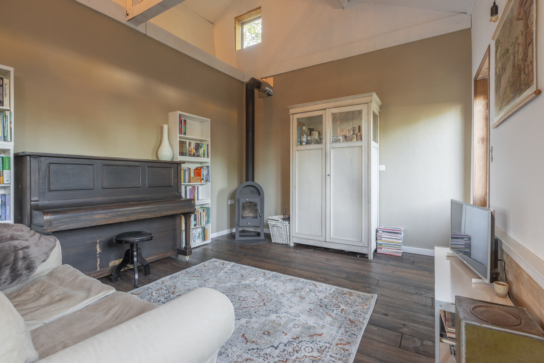 De woonkamer is een fijne ruimte waar u met het gezin, familie of vrienden kunt samenkomen. Er is voldoende plek voor een gezellige zithoek. Door de vele raampartijen valt er veel daglicht naar binnen en tevens zorgt dit voor een leuk uitzicht op de tuin. De ruimte is afgewerkt met een lichte kleurstelling en een houtenvloer. Er is een mooie schouw gecreëerd waar u een kachel kunt plaatsen, zodat het binnen zitten nog eens extra aantrekkelijk wordt gemaakt. De openslaande deuren geven u toegang tot het terras. Bij mooi weer kunt u deze fijn open zetten.