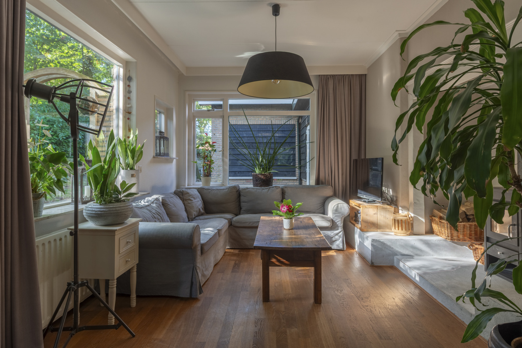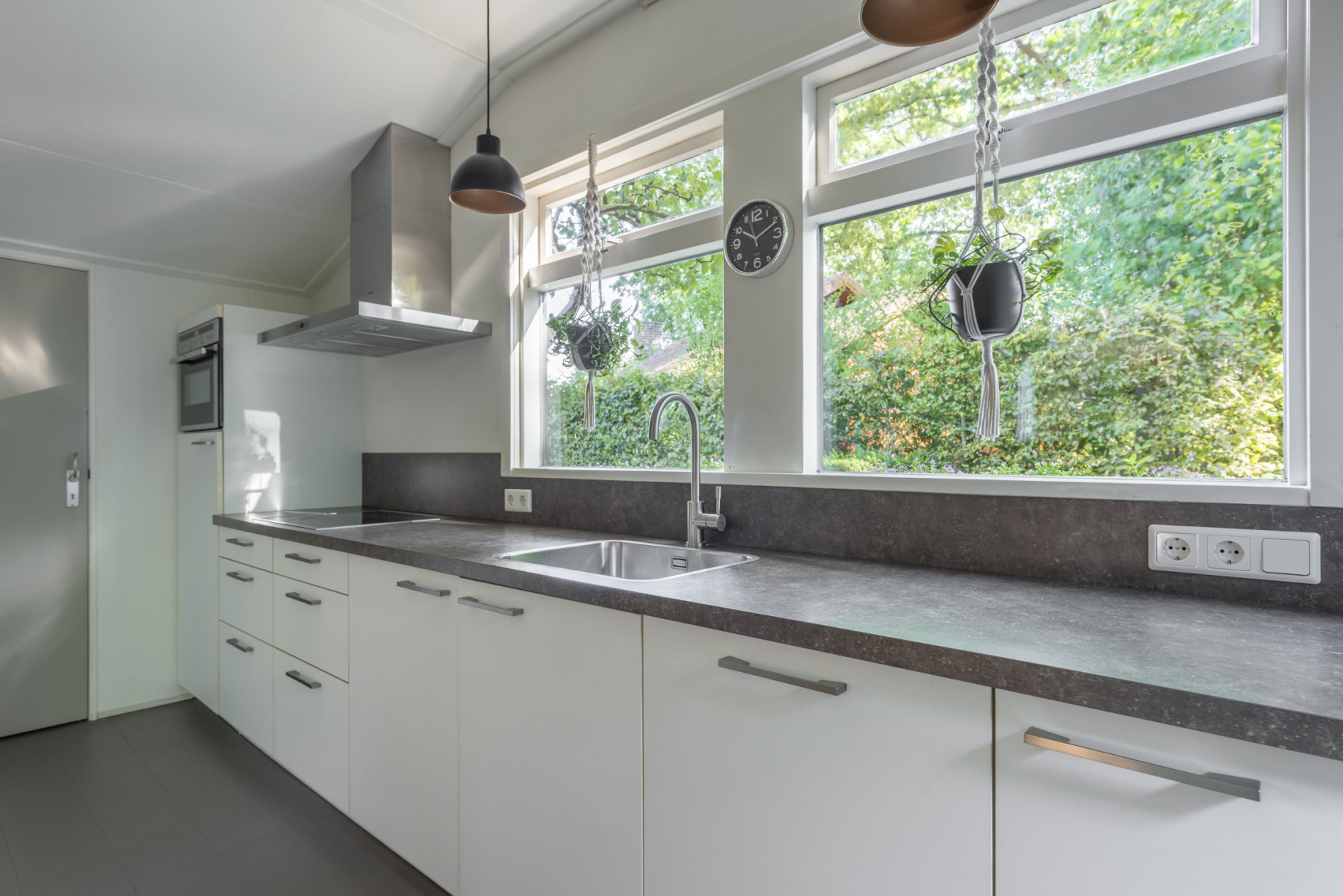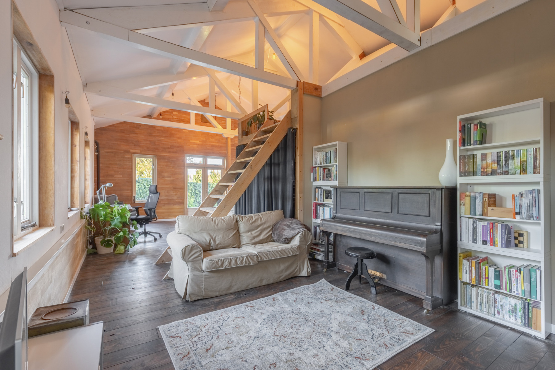 De woonkamer is een fijne ruimte waar u met het gezin, familie of vrienden kunt samenkomen. Er is voldoende plek voor een gezellige zithoek. Door de vele raampartijen valt er veel daglicht naar binnen en tevens zorgt dit voor een leuk uitzicht op de tuin. De ruimte is afgewerkt met een lichte kleurstelling en een houtenvloer. Er is een mooie schouw gecreëerd waar u een kachel kunt plaatsen, zodat het binnen zitten nog eens extra aantrekkelijk wordt gemaakt. De openslaande deuren geven u toegang tot het terras. Bij mooi weer kunt u deze fijn open zetten.