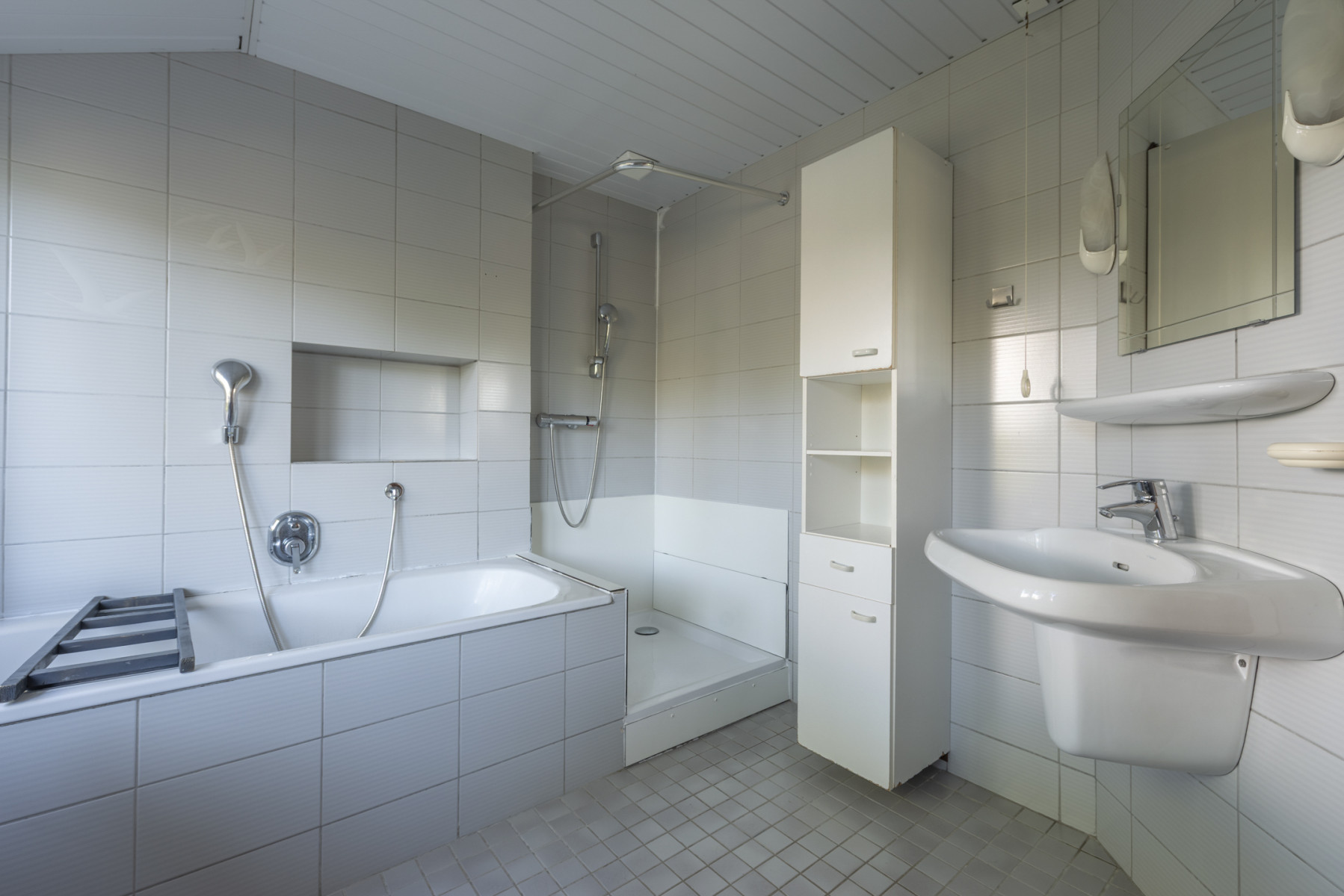 De badkamer heeft een lichte kleurstelling en in de ruimte vindt u alle gemakken. Zo beschikt u hier over een ligbad, een inloopdouche, een wastafel en een toilet.