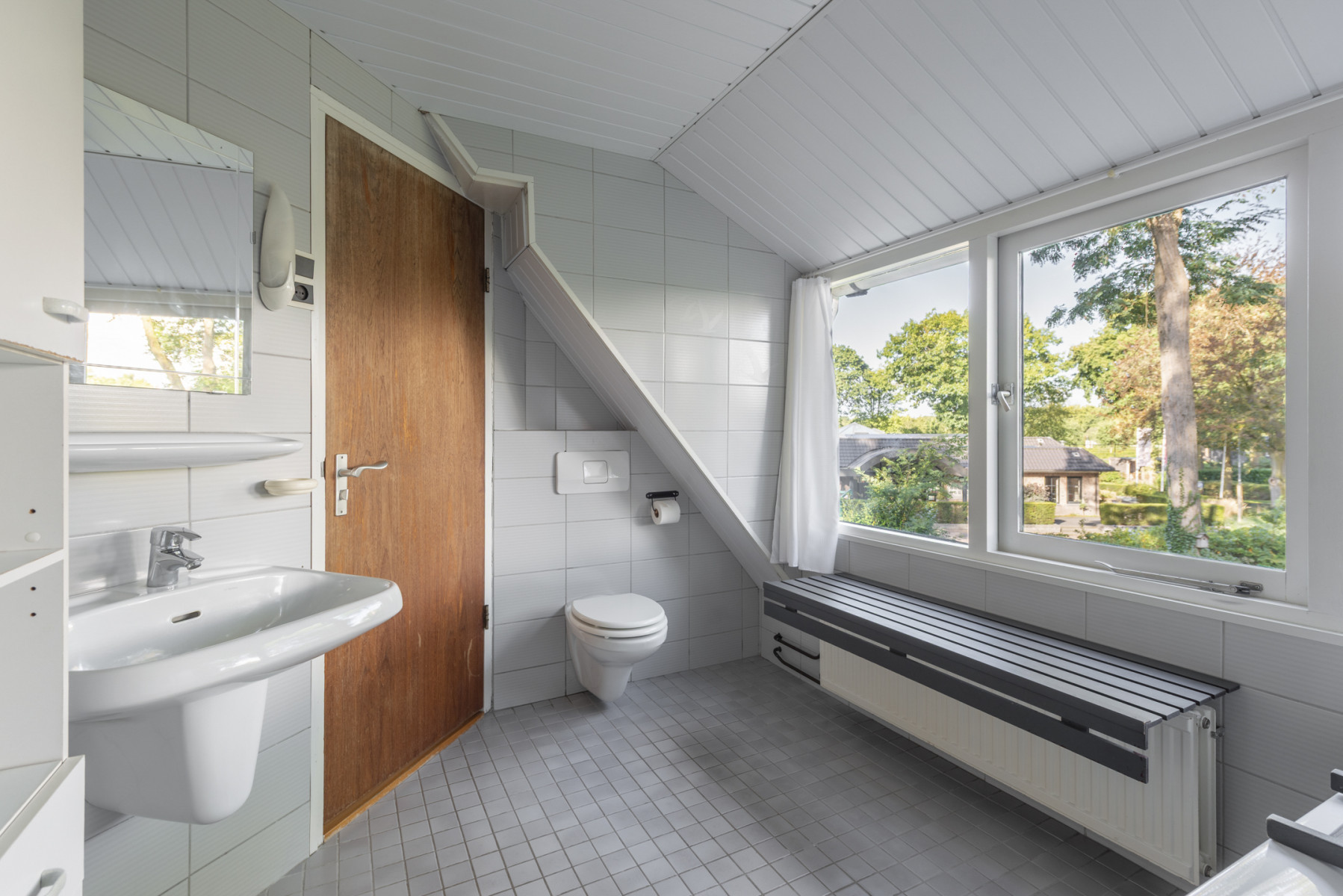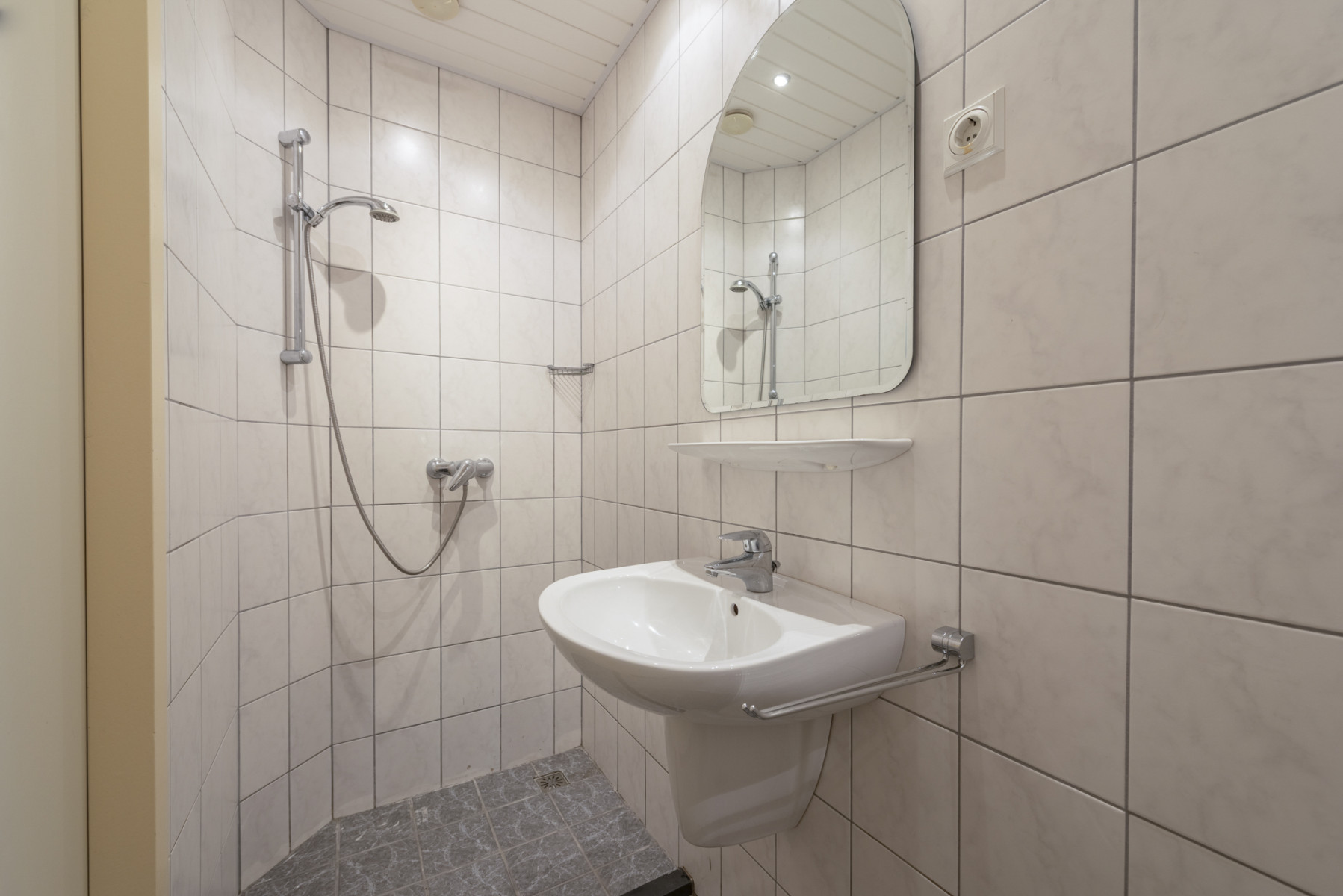 Op de begane grond bevindt zich tevens een badkamer. De badkamer is voorzien van een inloopdouche, een wastafel en een toilet.