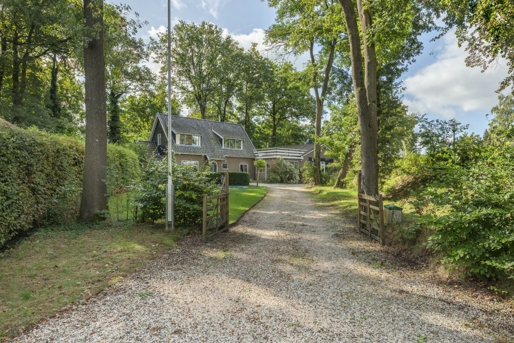 Aan de voorzijde bevindt zich een groot stuk gazon, diverse bomen en beplanting en een eigen oprijlaan van grind met een toegangshek.
