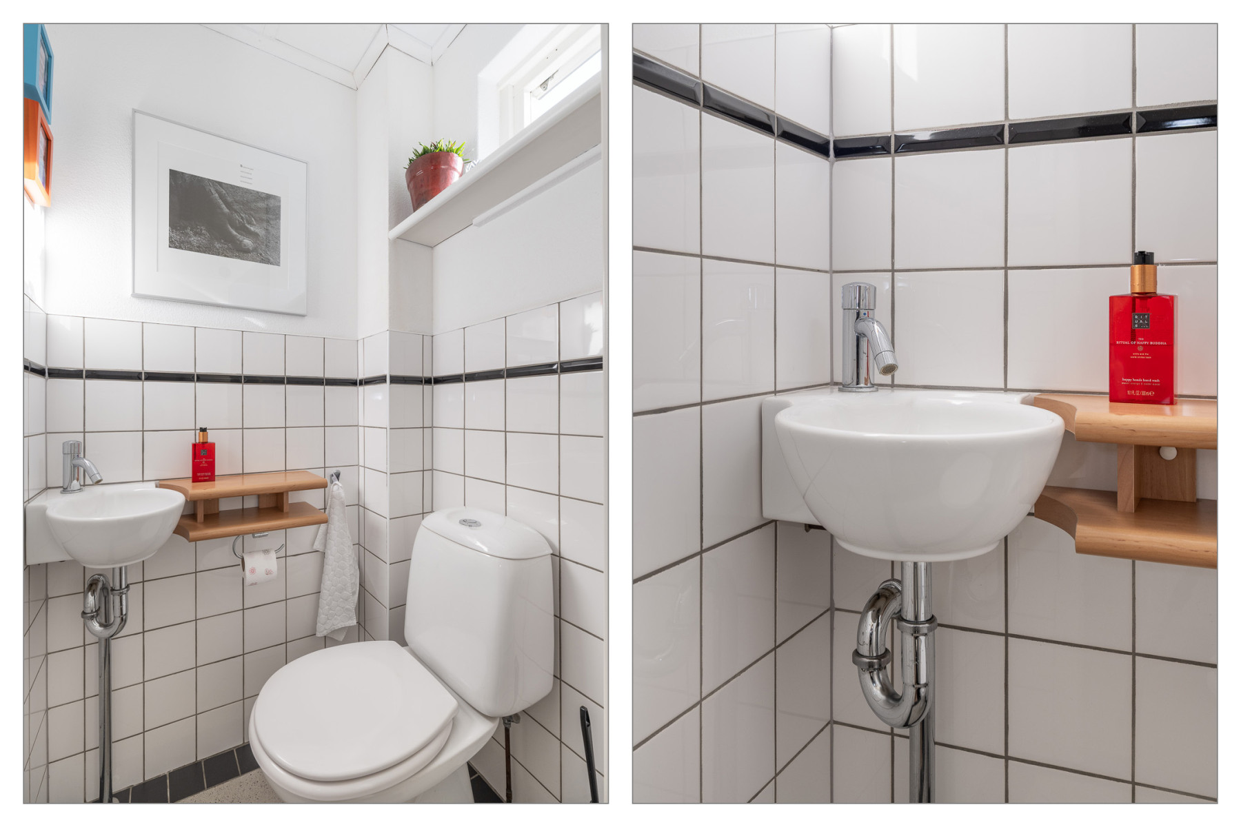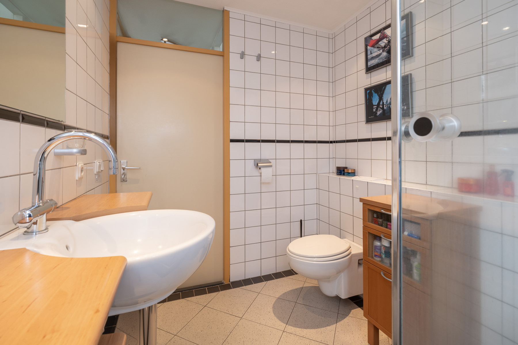 De badkamer is compleet en functioneel ingericht, voorzien van een wastafelmeubel met een houten blad dat warm oogt en genoeg ruimte geeft voor dagelijkse spullen. Ook bevindt zich hier een toilet, een douchecabine met een verstelbare handdouche en een radiator. Daarnaast brengt het raam veel daglicht naar binnen.