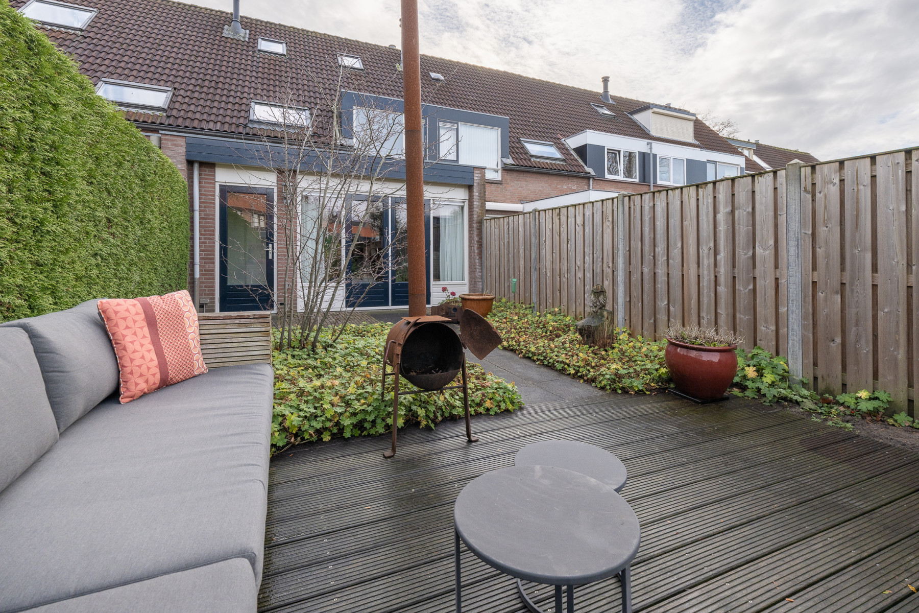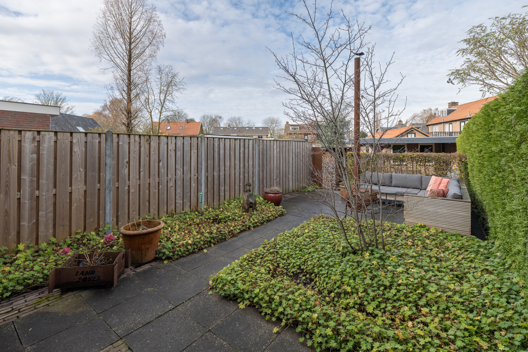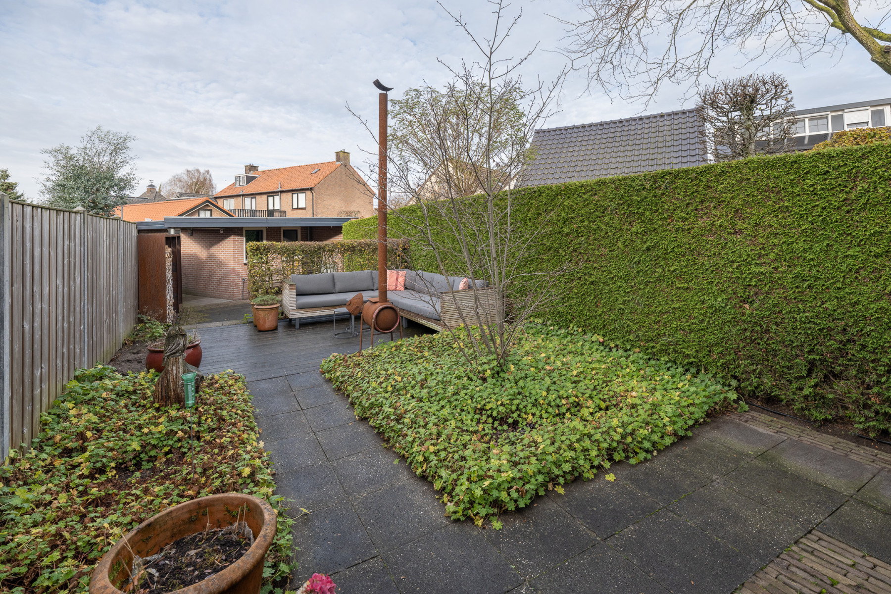 De achtertuin is een heerlijke plek om te ontspannen. De hoge hagen geven veel privacy, zodat u hier ongestoord kunt genieten. Het houten terras vormt een fijne plek om een zithoek te creëren. De diepe tuin heeft een fijne mix van groen en bestrating. De beplanting zorgt voor kleur en leven, terwijl de tegels het geheel strak en praktisch maken.