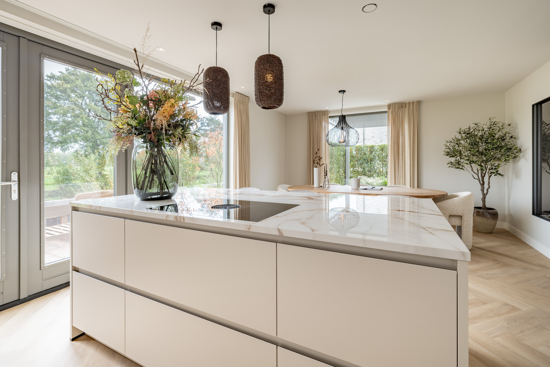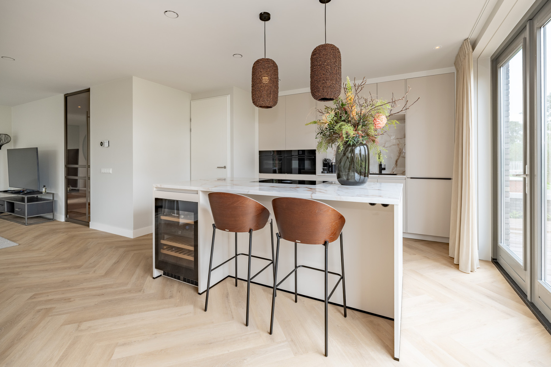 Bij het zien van deze moderne, open keuken verschijnt er direct een glimlach op uw gezicht: strak afgewerkt, met een luxe marmerlook aanrechtblad en greeploze kasten. Centraal in de ruimte staat het ruime kookeiland, voorzien van een Bora 4-pits inductiekookplaat, een wijnklimaatkast en een gezellig barretje aan de andere zijde, ideaal voor een snelle lunch of een drankje tijdens het koken. Verder beschikt de keuken over een combi-oven, een stoomoven, vaatwasser, Quooker-kraan, inbouw zeeppomp en een koel-vriescombinatie. Kortom; van alle gemakken voorzien!