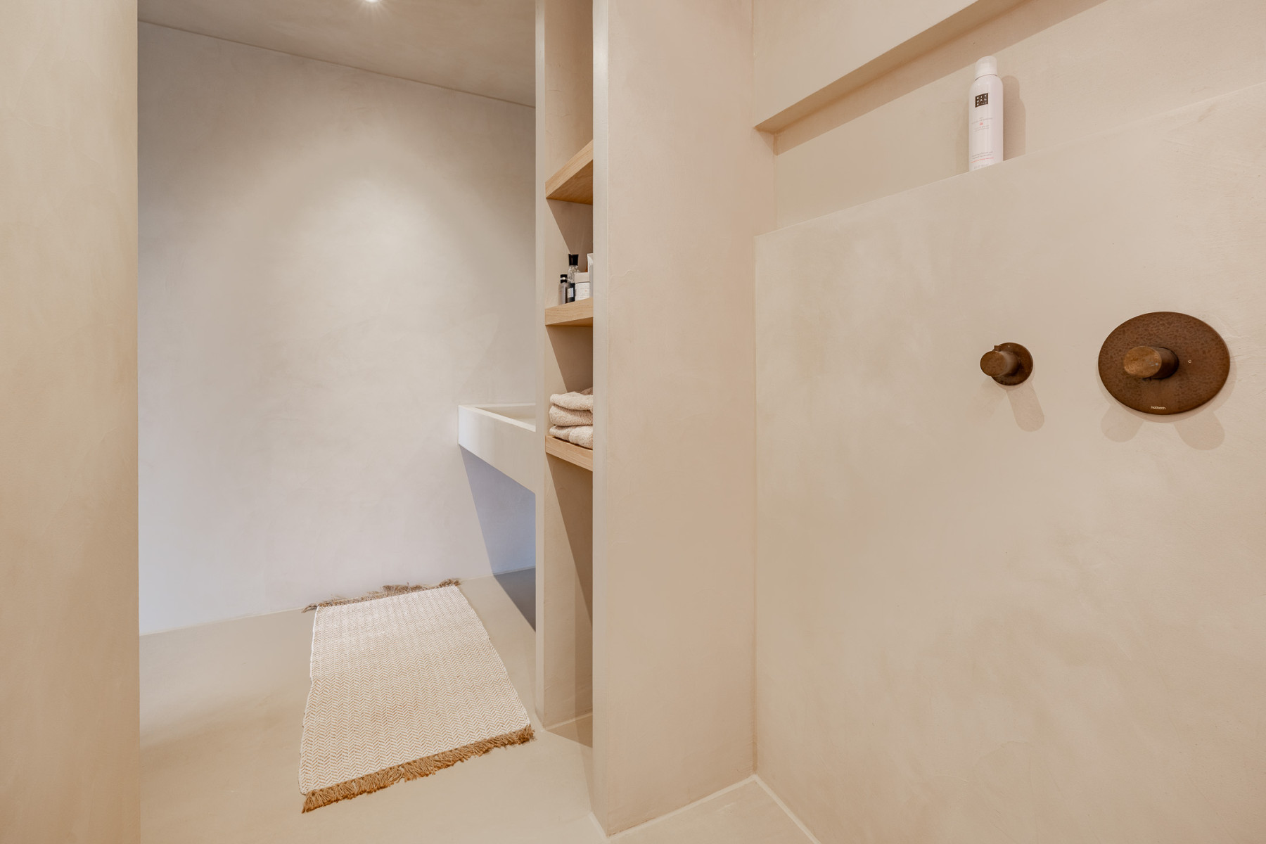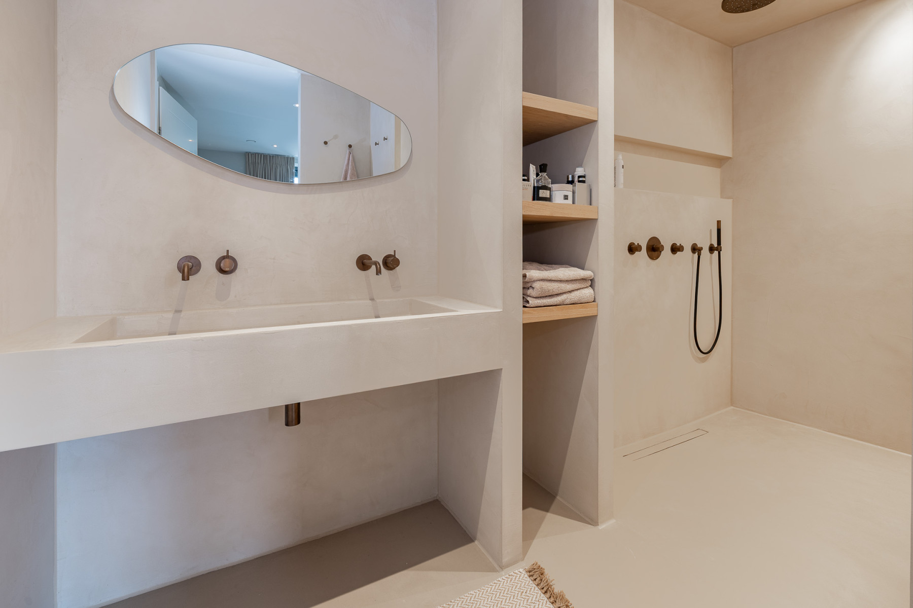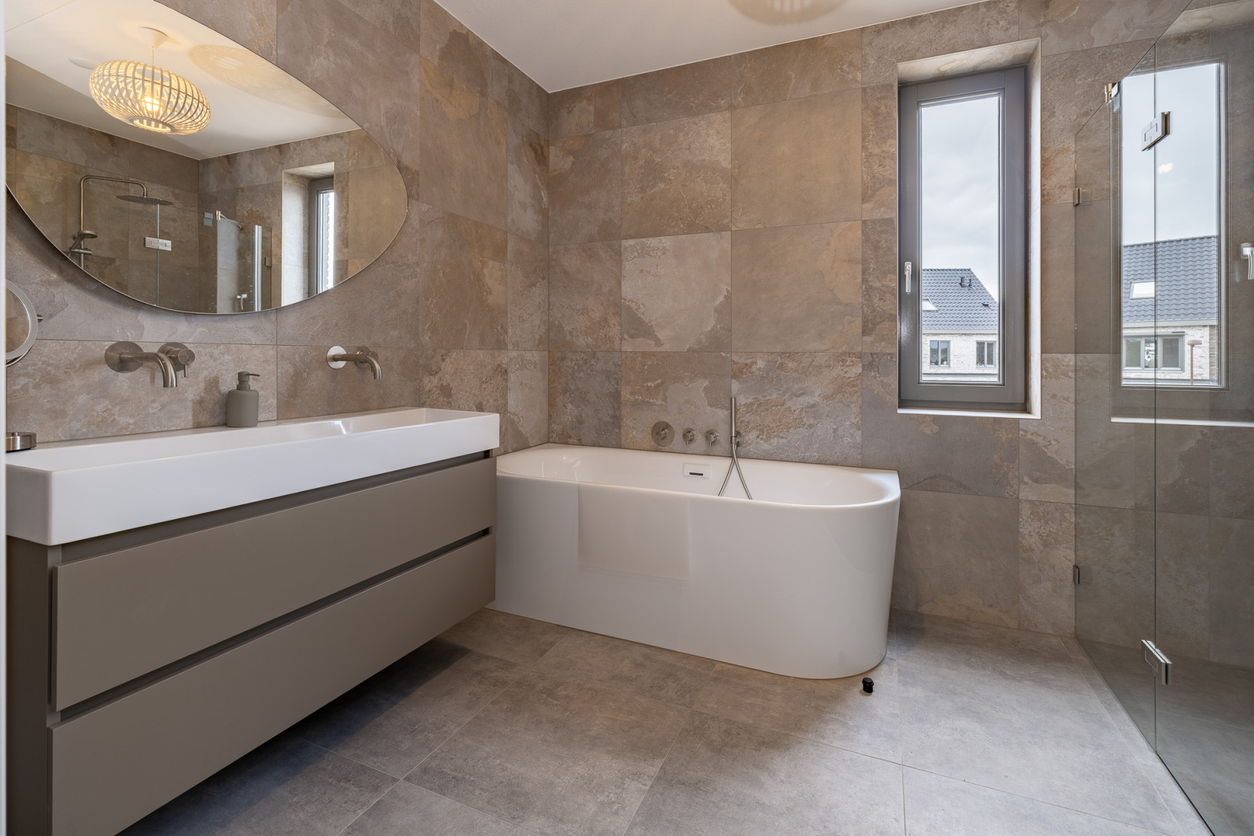 Toilet, dubbele wastafel, inloopdouche, vloerverwarming, ligbad, douche en wastafelmeubel