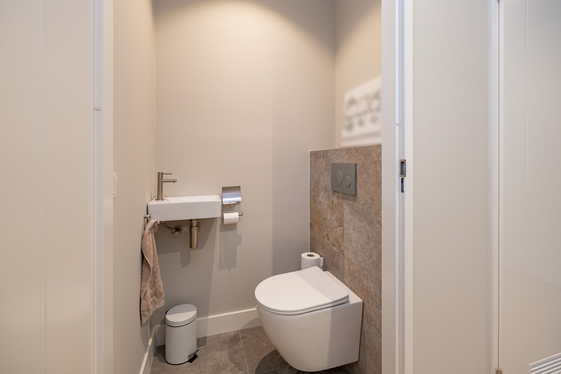 Via de voordeur stapt u binnen in een ruime en verzorgde hal. De stijlvolle PVC-visgraatvloer valt direct op en geeft de ruimte een luxe uitstraling. In de hal bevinden zich een nette vastenkastwand met garderobe voor het opbergen van uw spullen, de meterkast, een vaste kast met technische installatie en een modern afgewerkt toiletruimte. Een fijne binnenkomst die direct de sfeer van de woning weergeeft.