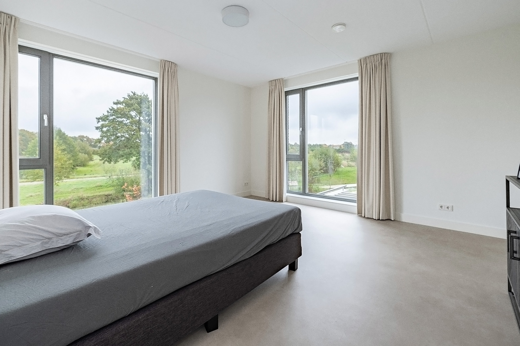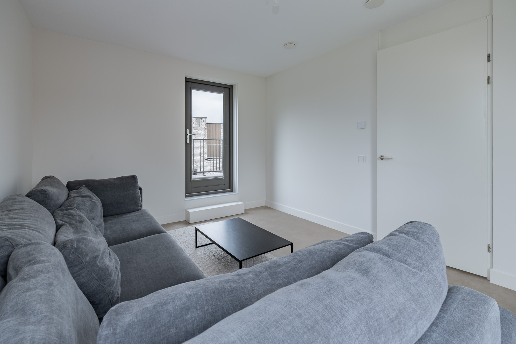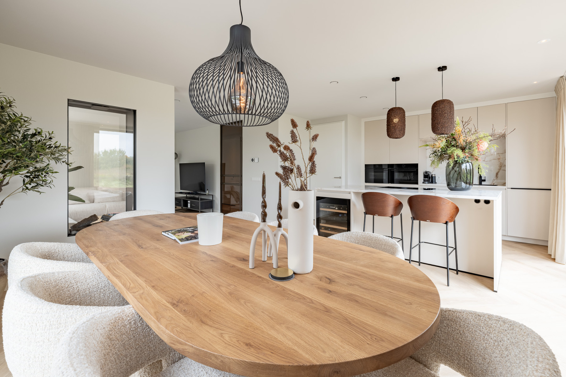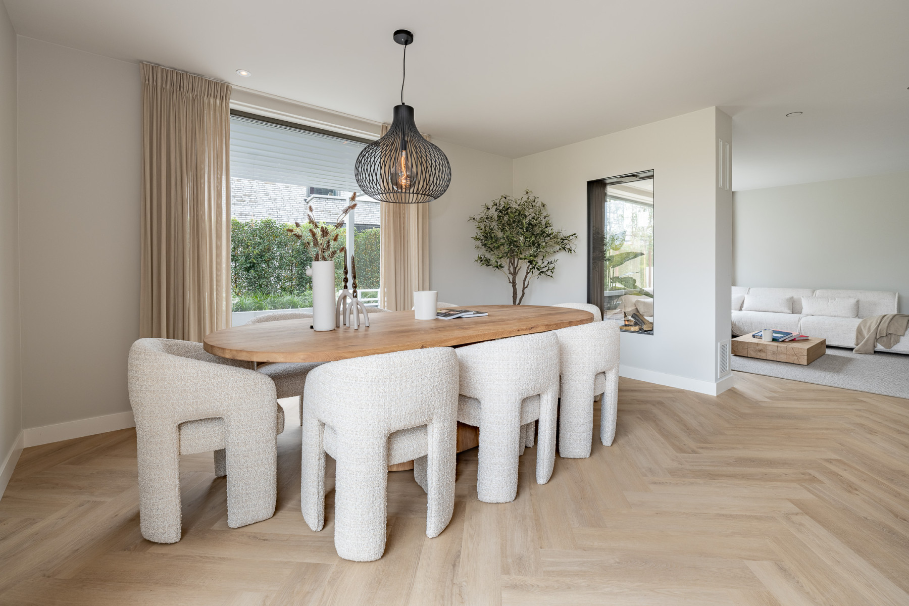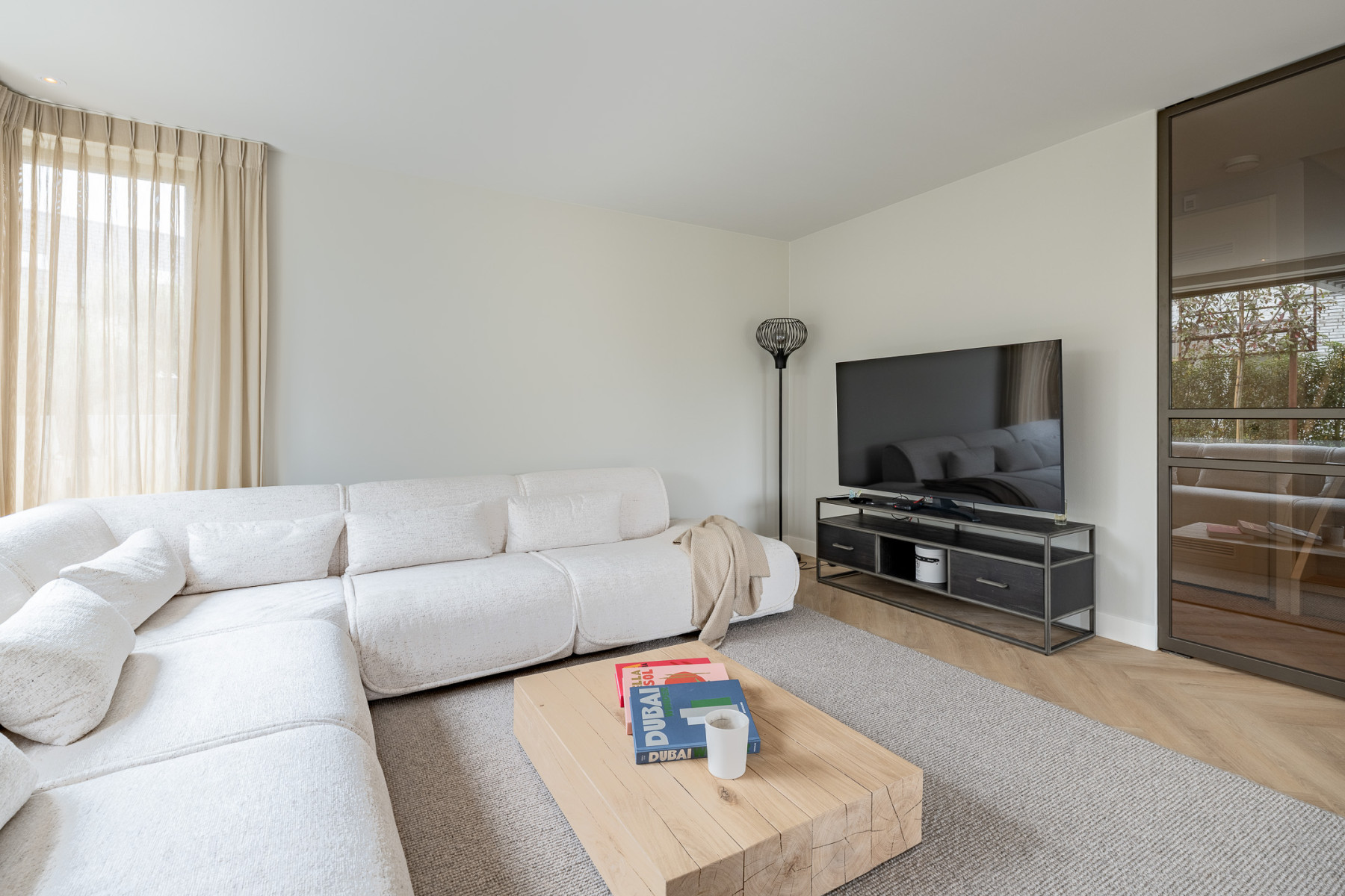 Via een stijlvolle bronzen stalen taatsdeur stapt u de woonkamer binnen. Net als de rest van de verdieping is de afwerking hier strak en modern, met lichte kleuren, een gestuukt plafond en subtiel geïntegreerde spotverlichting. Blikvanger is de doorkijk gashaard, die niet alleen sfeer brengt, maar ook een mooie verbinding vormt tussen de woonkamer en de keuken. Grote raampartijen zorgen voor veel natuurlijk licht en een vrij uitzicht op de tuin. Via de deur stapt u zo het terras op, ideaal voor de lange zomeravonden. De gehele begane grond is volledig voorzien van comfortabele vloerverwarming.