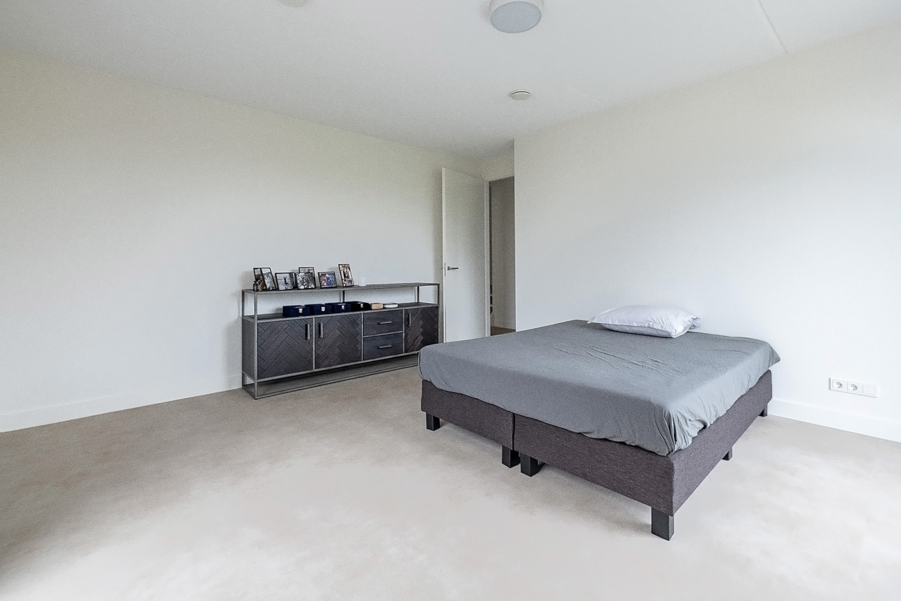 Via de hal bereikt u een ruime slaapkamer op de begane grond. De kamer is voorzien van een vaste kastenwand met ruimte voor uw kleding en accessoires. Een extra pluspunt is de deur naar het terras, waardoor u op een zonnige ochtend zo naar buiten stapt. Aangrenzend vindt u de stijlvolle badkamer, uitgerust met een wastafelmeubel met twee kranen en een ruime inloopdouche met regendouche.