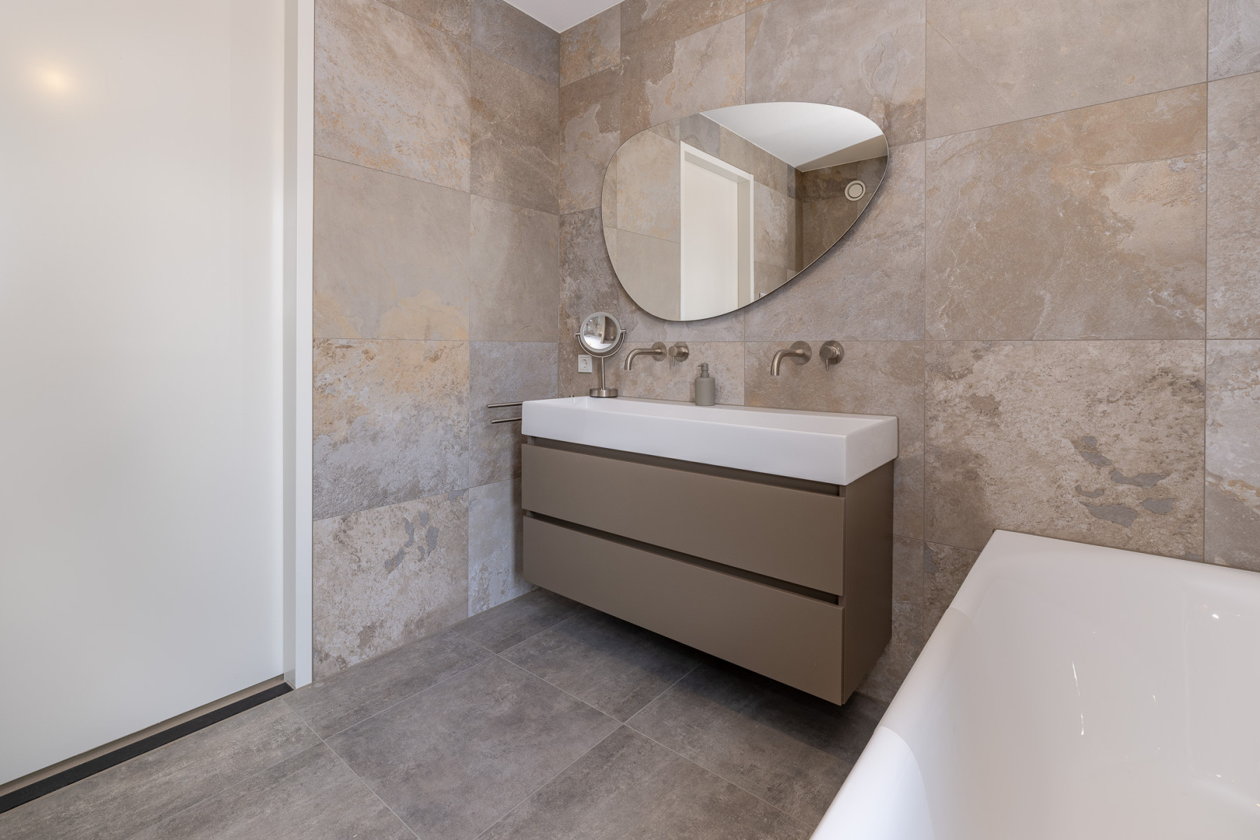 De badkamer is stijlvol en modern ingericht met mooi betegelde muren en vloeren, wat zorgt voor een harmonieus geheel. U vindt er een wastafelmeubel met twee kranen en een verlichte spiegel, ideaal voor het hele gezin. Daarnaast is de ruimte voorzien van een ligbad, een ruime inloopdouche met regendouche en een toilet. Voor extra comfort is de badkamer uitgerust met vloerverwarming, waardoor het altijd prettig warm aan uw voeten blijft.
