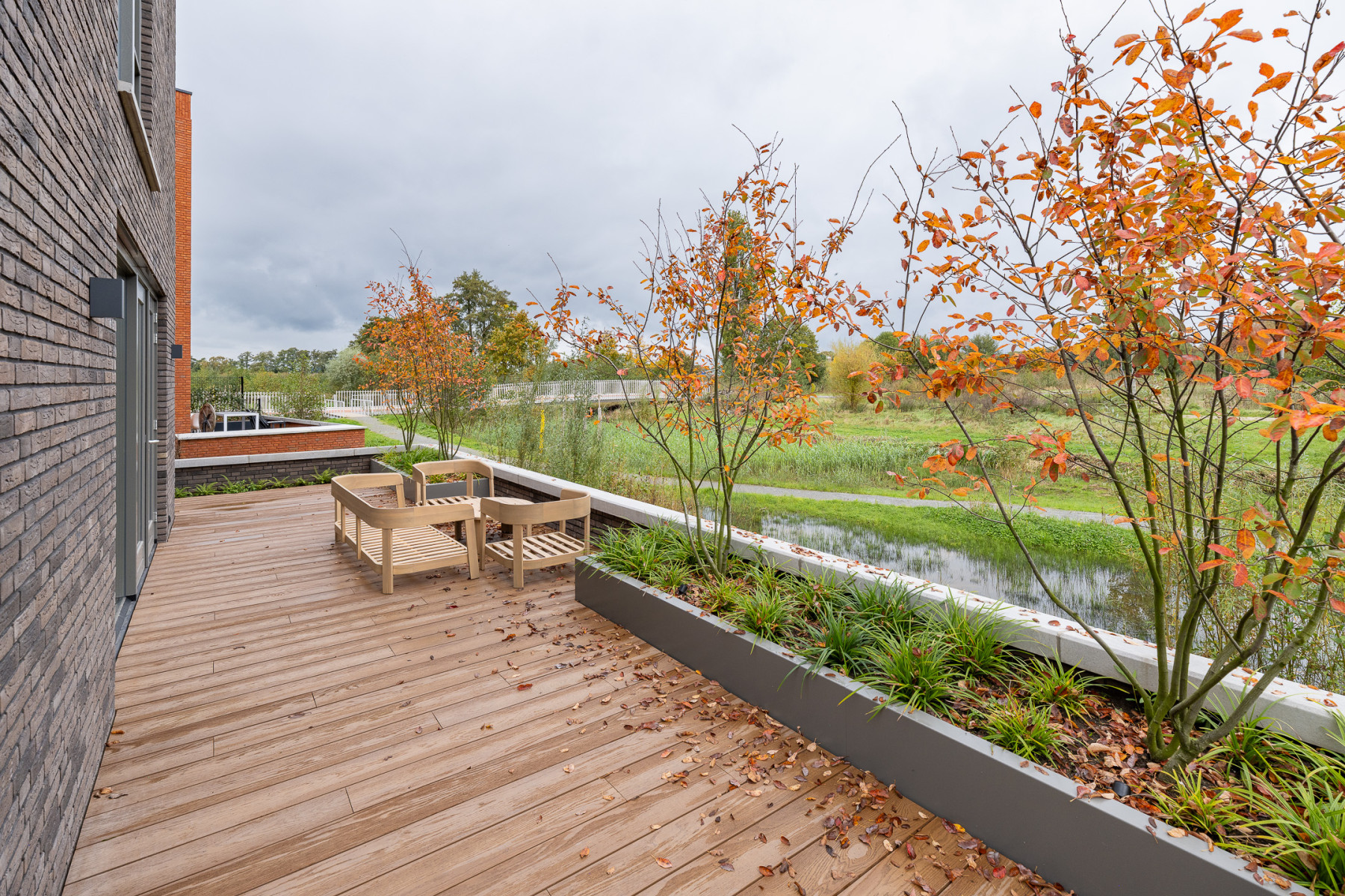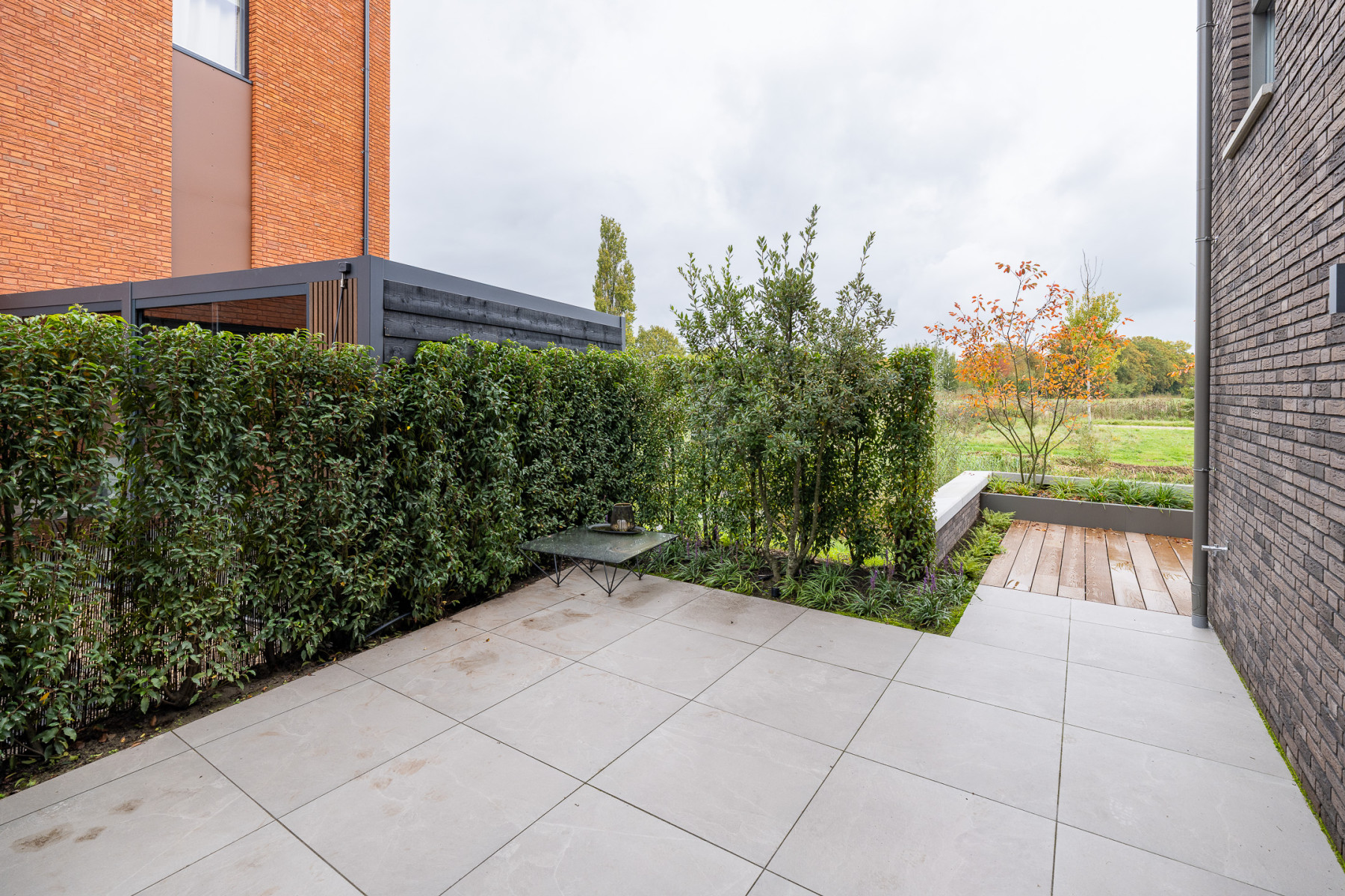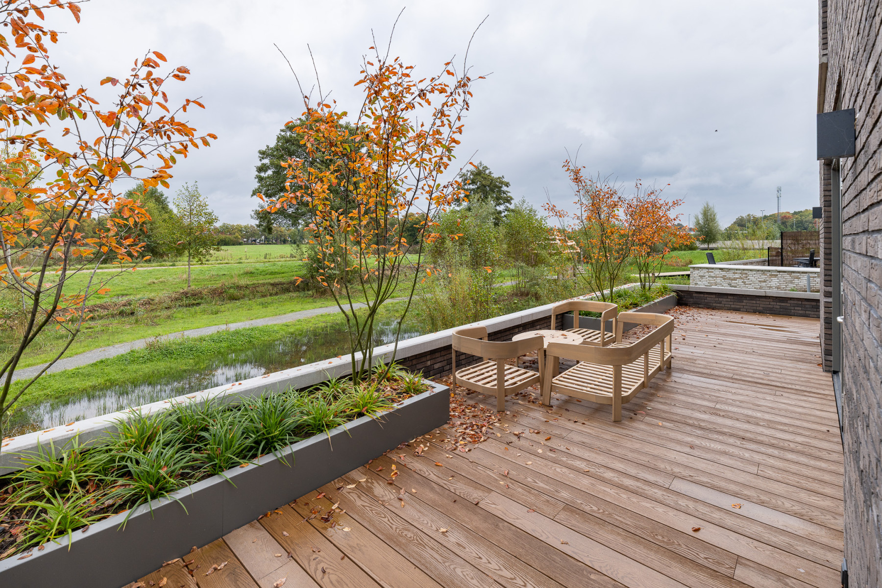 Rondom de woning zijn meerdere fijne zithoeken gecreëerd. Aan de zijkant van de tuin vindt u een sfeervol terras met overkapping, voorzien van een elektrisch zonnescherm en ingebouwde spotverlichting, een heerlijke plek om beschut te zitten, ook in de avonduren. Vanuit de achtertuin kijkt u op een rustige en natuurlijke omgeving uit. Ook hier is ruimte voor een comfortabele zithoek om in alle rust te genieten van het buitenleven.