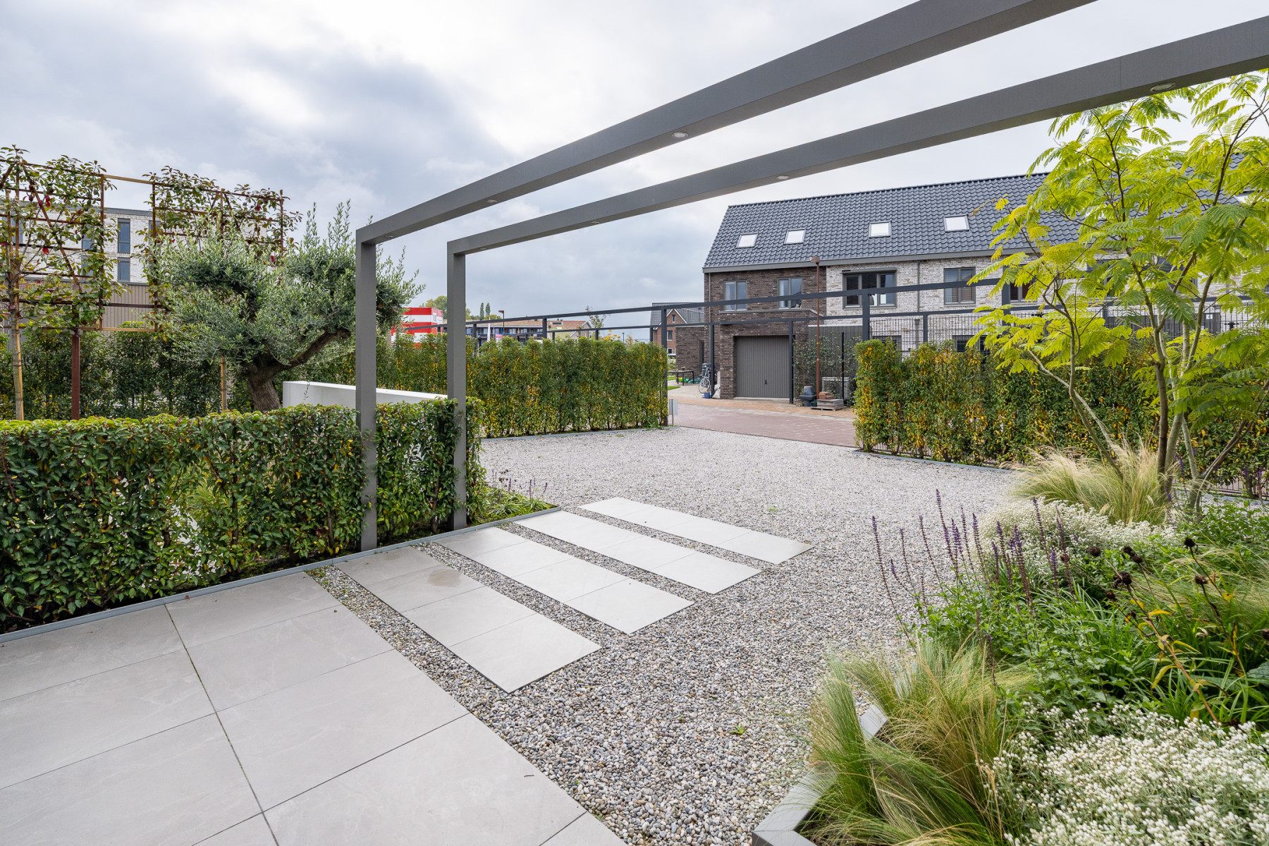 Bij aankomst valt een ruime oprit op, met plek voor twee a drie auto's. Aangrenzend bevindt zich een ruime aangebouwde berging, ideaal voor het opbergen van fietsen, tuingereedschap of andere spullen. De voortuin is strak aangelegd met beplanting en staptegels die leiden naar de voordeur.
