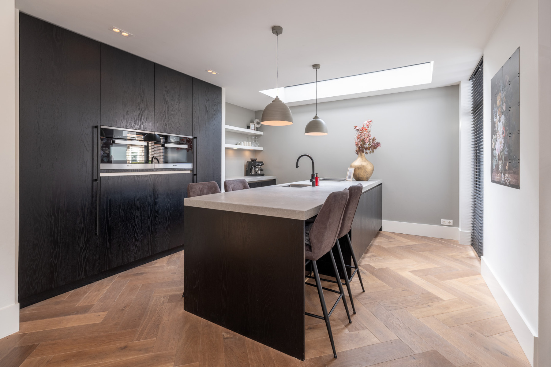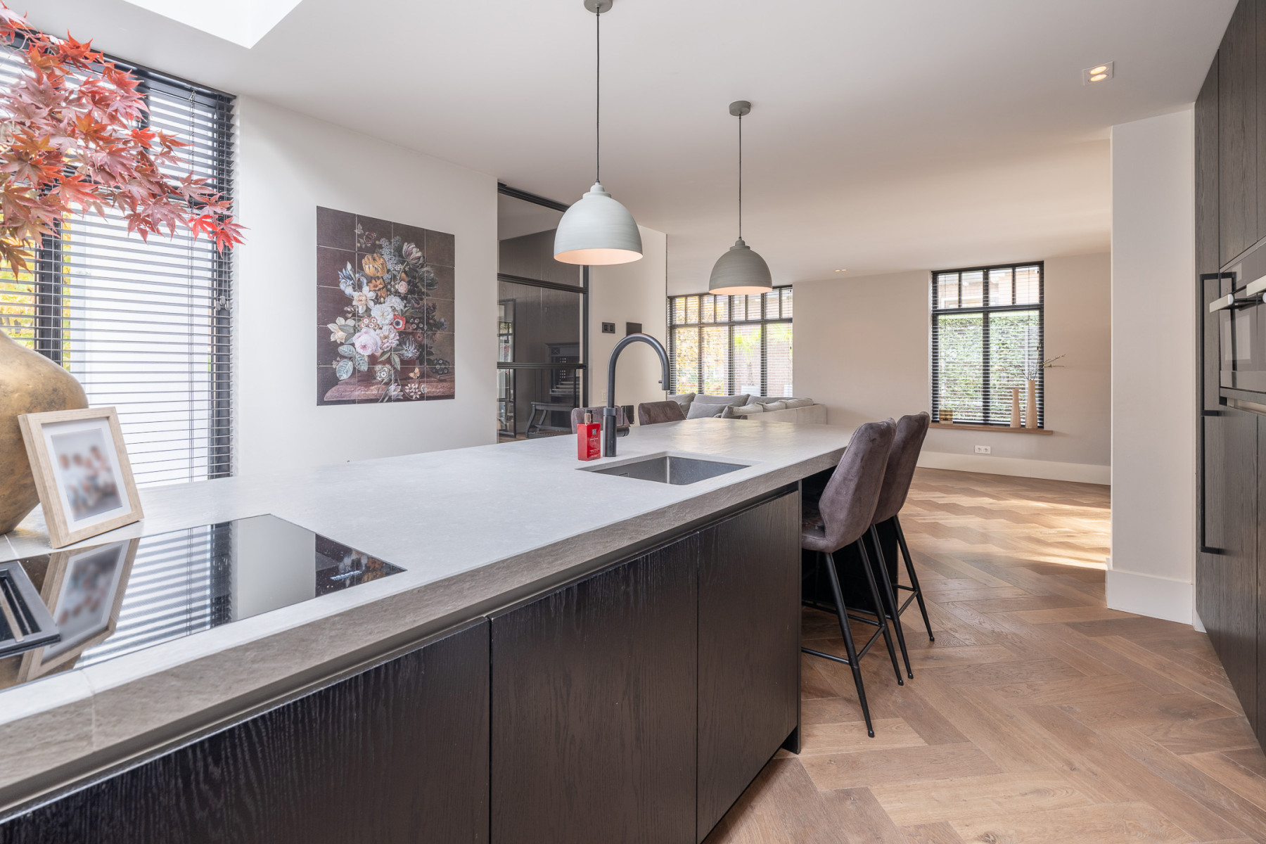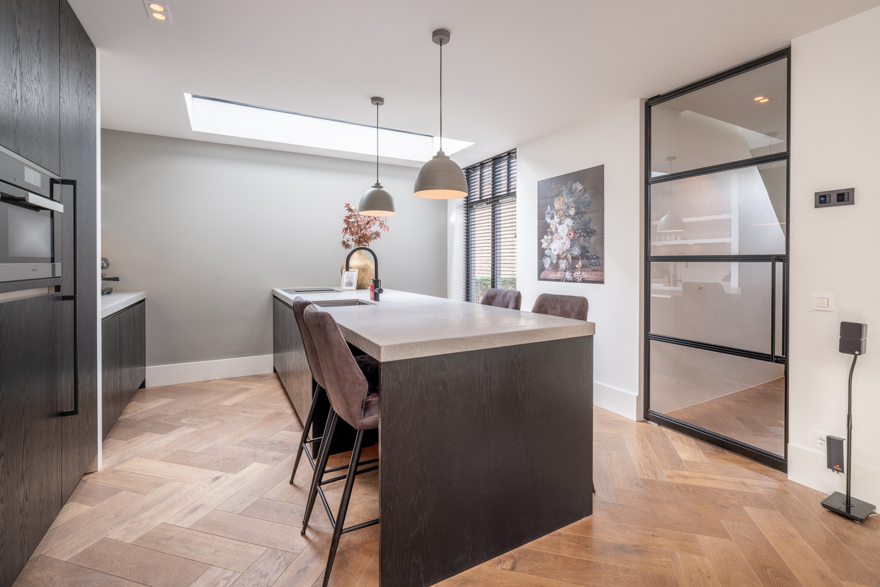 Aan alles is hier gedacht, zo vindt u een inbouw combi oven, een stoomoven, een inductieplaat met geïntegreerde afzuiging én nog een Quooker kookkraan. Net zoals de rest van de begane grond is de keuken voorzien van inbouwspots. Tijdens het koken kijkt u mooi uit over de straat en geniet u van de lichtstraat die voor veel lichtinval zorgt. En nog een leuke extra: de fijne bar waar u heerlijk kunt aanschuiven.