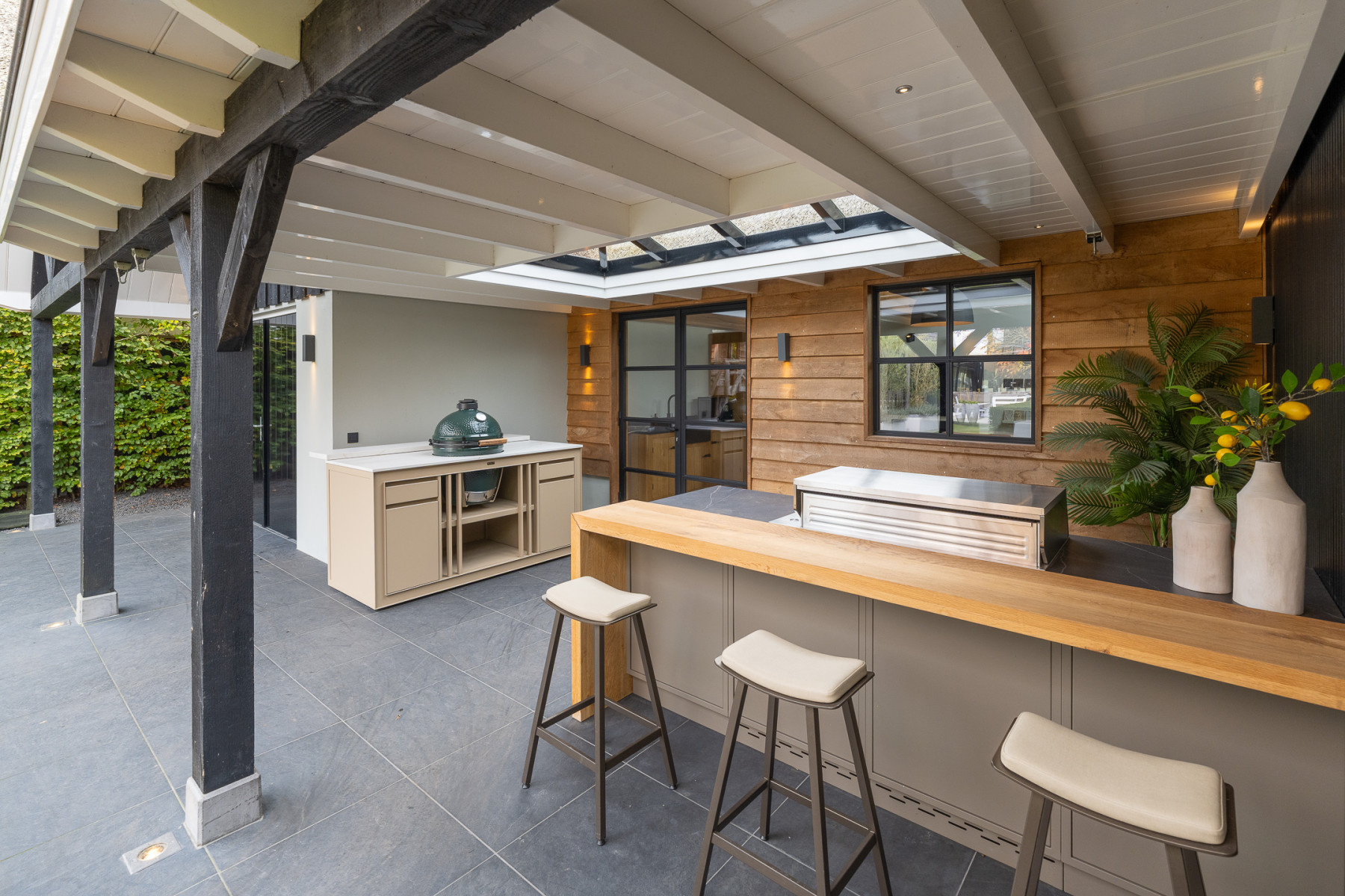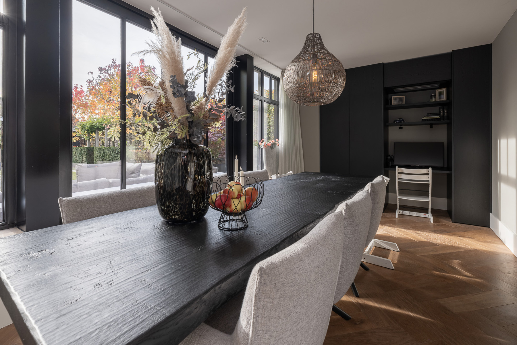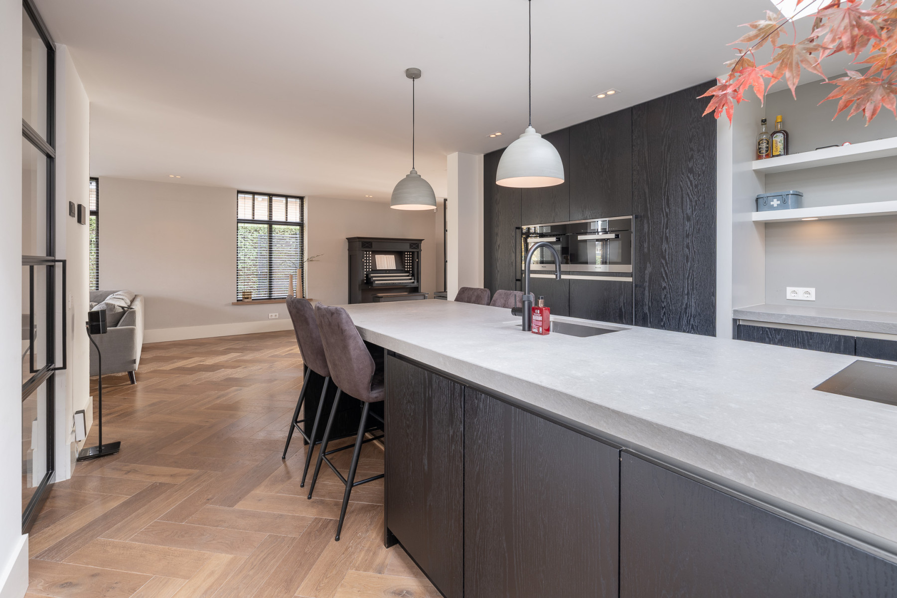 Aan alles is hier gedacht, zo vindt u een inbouw combi oven, een stoomoven, een inductieplaat met geïntegreerde afzuiging én nog een Quooker kookkraan. Net zoals de rest van de begane grond is de keuken voorzien van inbouwspots. Tijdens het koken kijkt u mooi uit over de straat en geniet u van de lichtstraat die voor veel lichtinval zorgt. En nog een leuke extra: de fijne bar waar u heerlijk kunt aanschuiven.