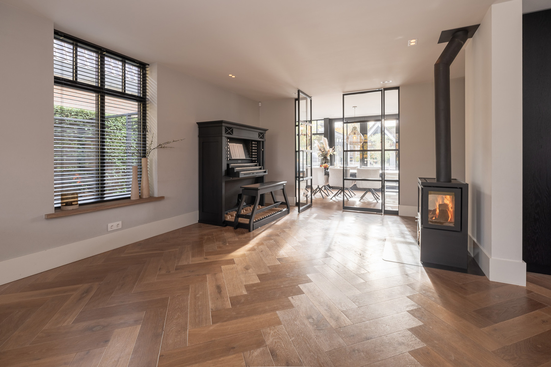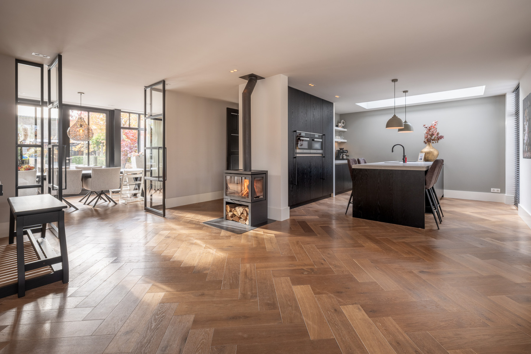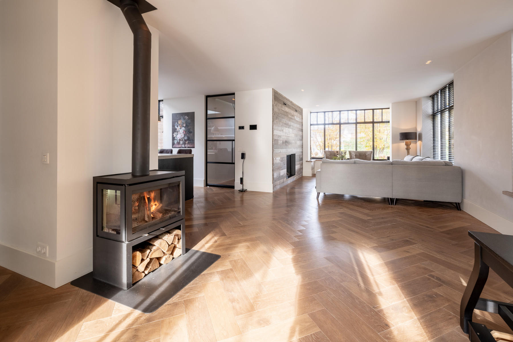 Plaats hier een comfortabele zit en genieten maar! De raampartijen zorgen voor prettige lichtinval en dankzij de eikenhouten visgraatvloer met vloerverwarming heeft dit alles een fijne uitstraling. De sfeer wordt extra versterkt door de gashaard aan de voorzijde van de woning en de houtkachel (ter overname) in het midden van de ruimte. Kortom: een woonkamer waar u zich snel thuis zult voelen!