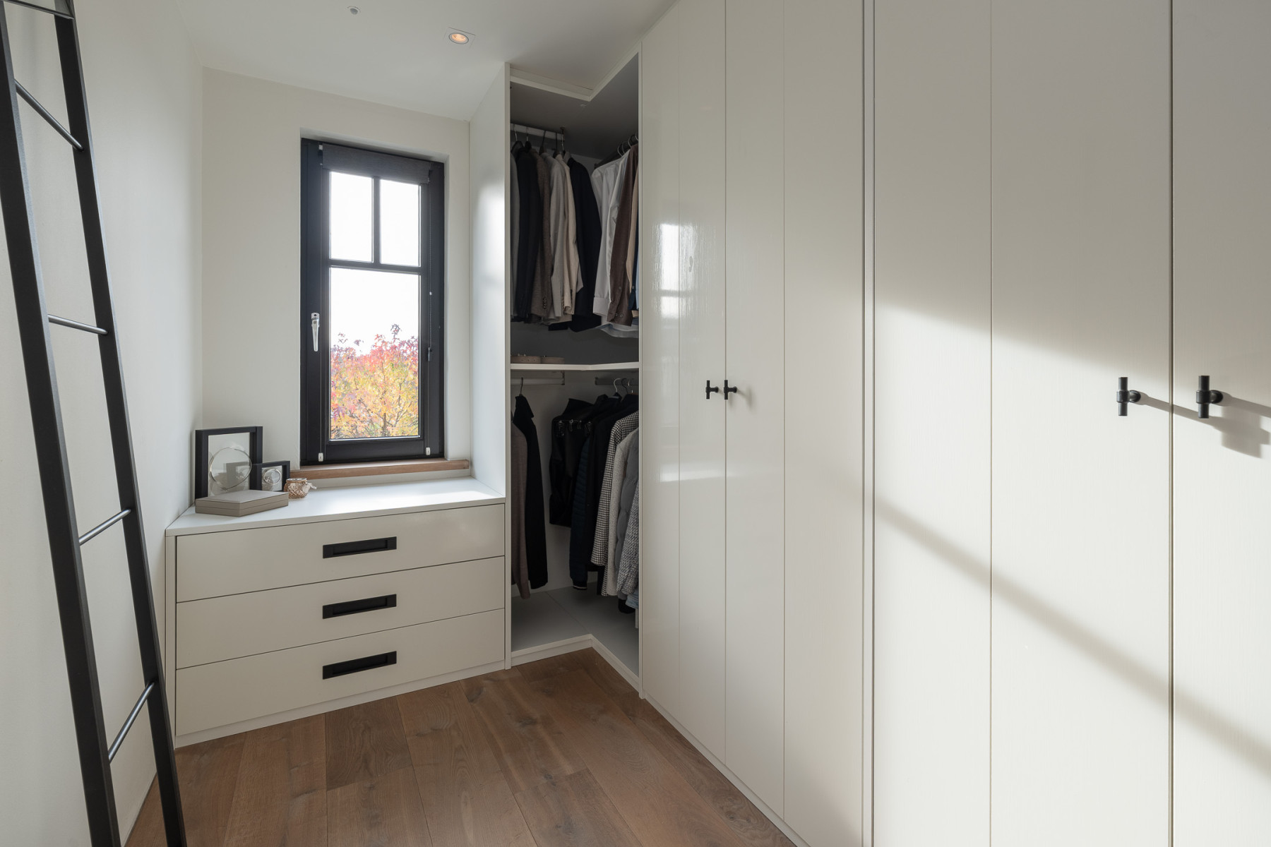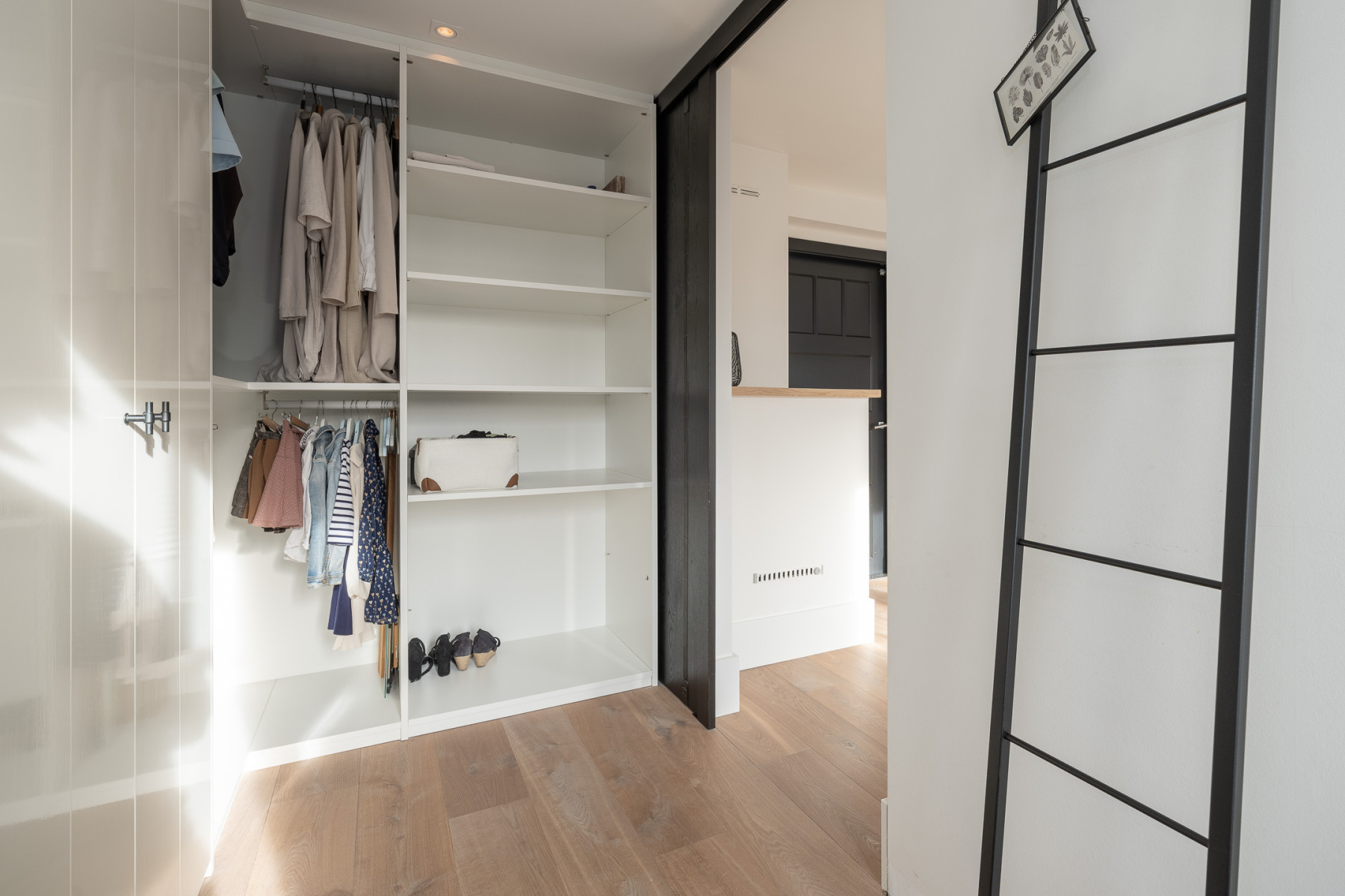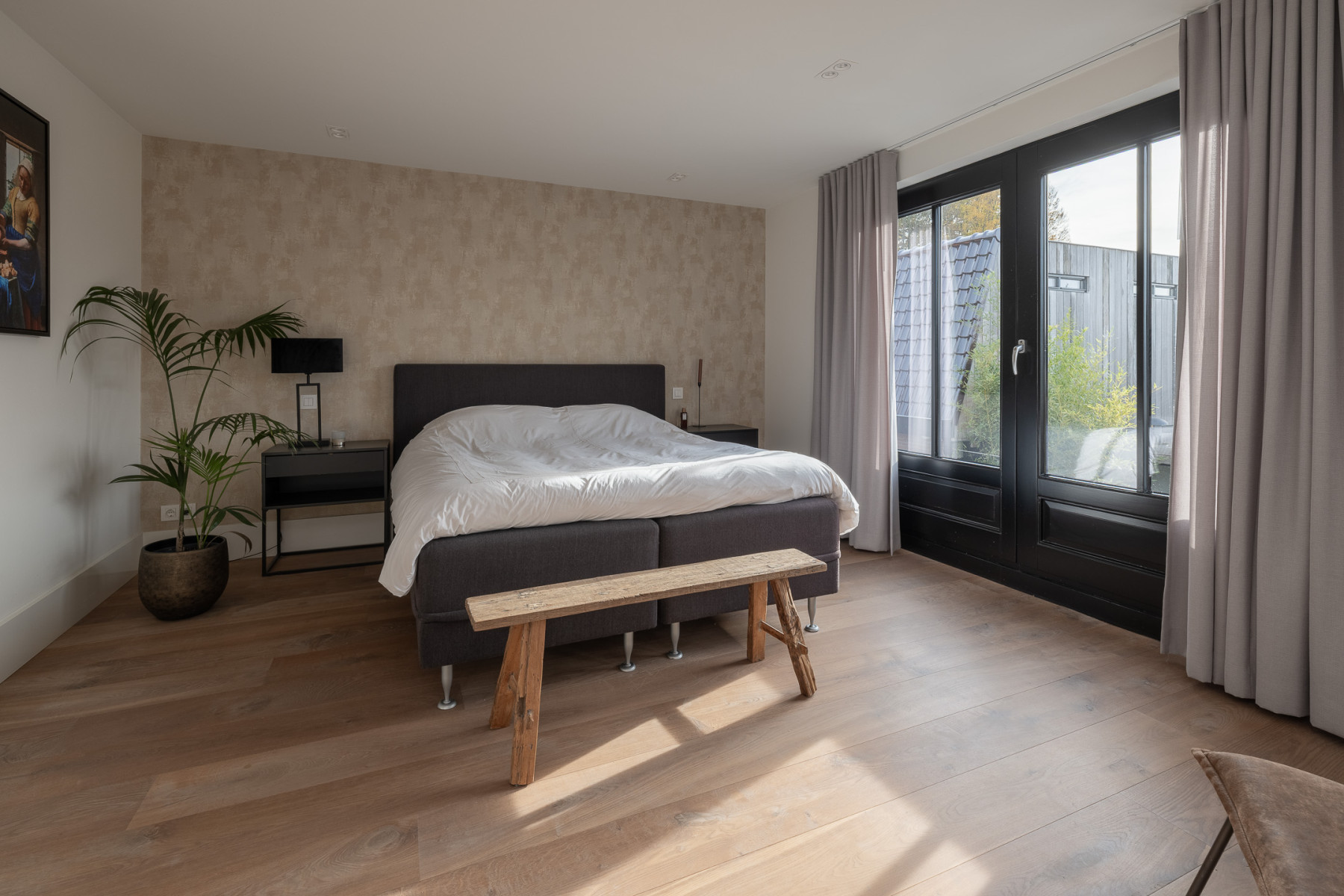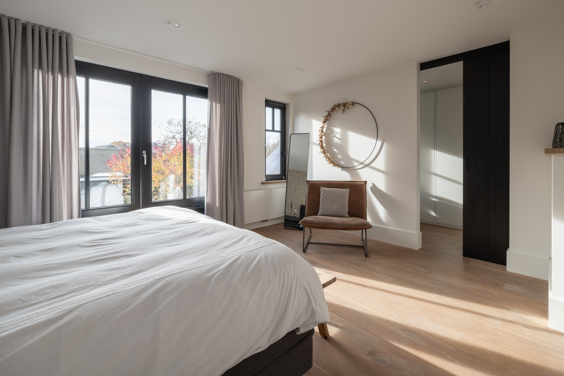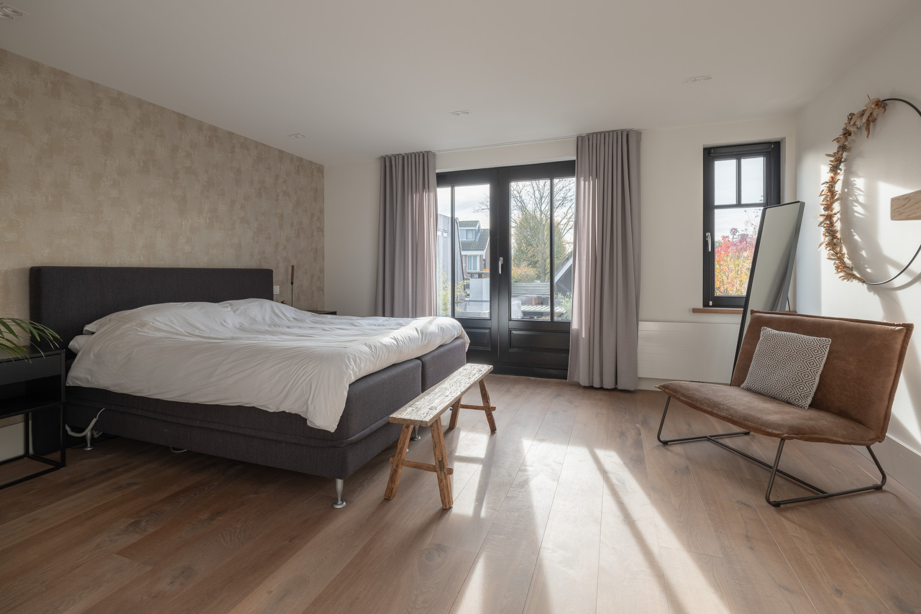 Middels de eikenhouten trap bereikt u de eerste verdieping. De overloop is voorzien van een betonnen gietvloer en inbouwspots, u verkrijgt hier toegang tot drie slaapkamers. De kamer aan de voorzijde van de woning beschikt over een vaste kast en biedt een leuk uitzicht over de straat. De ouderslaapkamer is zeer ruim en afgewerkt met dezelfde eikenhouten vloer als de begane grond. Als u de openslaande deuren opent geniet u van een heerlijk briesje én zicht op de fijne achtertuin. Aan de rechterzijde van deze kamer vindt u de inloopkast waar zich de tweede airconditioning unit bevindt, deze ruimte is prachtig afgewerkt en is af te sluiten door houten schuifdeuren. Om last van de zon te voorkomen zijn in deze slaap- en kleedkamer nog geïntegreerde screens geplaatst die strak zijn weggewerkt. Wat een luxe!